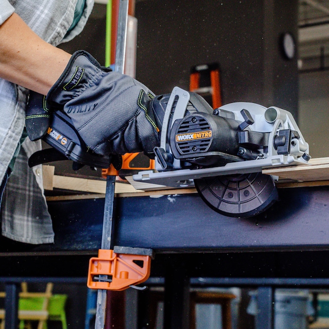 The ultra-portable and easy to handle Worx Nitro WX531L.9 20V Power Share WORXSAW 4.5 in. Cordless Compact Circular Saw with Brushless Motor might be small, but it’s more than powerful enough to get the job done. With 6900 RPM of no-load speed, it’s able to spin the blade as fast as cordless circular saws that are much larger. The 4.5 in. blade only has a 3/8 in. arbor. That’s half the size of a traditional circular saw’s blade, and it allows the motor to push the blade to higher speeds. And the user benefits from having all that power in an easy to grip and easy to transport form factor. In fact, this compact circular saw weighs less than 4 lbs., so it’s much easier to maneuver and make tricky cuts with than a full-size circ saw. Speaking of cuts, this 4.5 in. circular saw was made to cut 2x4s and plywood. With a max cutting depth of 1.5 in., it slices right through. And 0-46 degree bevel cuts are as easy as setting the bevel-adjustment lever. This cordless circular saw is driven by a high-efficiency brushless motor. It doles out more power but uses less battery while doing so, which means you get more runtime on just one charge. This 20V circular saw has a comfortable grip as well, so you can put in the hours and not feel it as much in your hands afterward. This Worx Nitro WX531L 20V Power Share WORXSAW 4.5 in. Cordless Compact Circular Saw with Brushless Motor is the more nimble version of the full-size cordless circular saw.