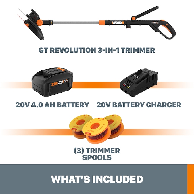 Changing the game of lawn care, 1 yard at a time, the GT Revolution is 3 lawn manicuring tools in 1. Converts almost instantly from a trimmer, to an in-line wheeled edger, to a mini-mower, so you get a professional-looking lawn that’s easier to maintain and costs less time and money. This is so much more than a weed-eater. It’s a Revolution. At less than 6 lbs., and with a telescoping shaft, and 7 handle and 6 rotating head positions, almost anyone, of any height, can comfortably use the Revolution. The shaft is a full foot longer than the original GT, and the grips are ergonomically designed to give the user a firm handle on each of the 3 functions. And when you want to switch from trimmer to edger to mini-mower, it’s just a push of a button and a turn of the head. No tools needed. It’s powerful, too. Spinning at 7600 revs/min, and running on the same 20-Volt 4.0 Ah Powershare battery that powers our chainsaws, the GT makes nice, clean cuts. And the patented Command Feed system gives you fresh line whenever you feel you need it-no bumping or auto-feed. And with an extra spool holder right on the handle, if you do run out of line in the field, you can just pop in your extra spool without a trip back to the shed.