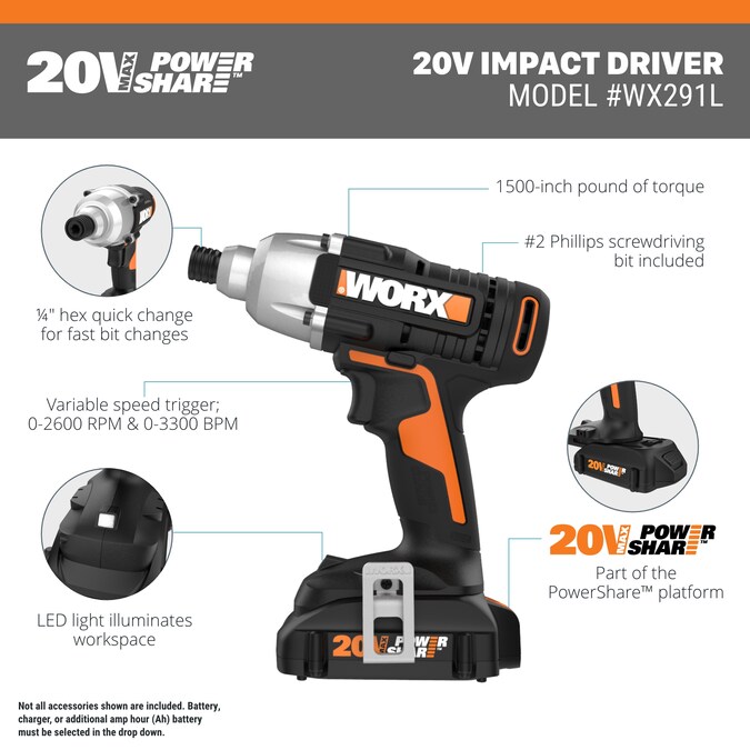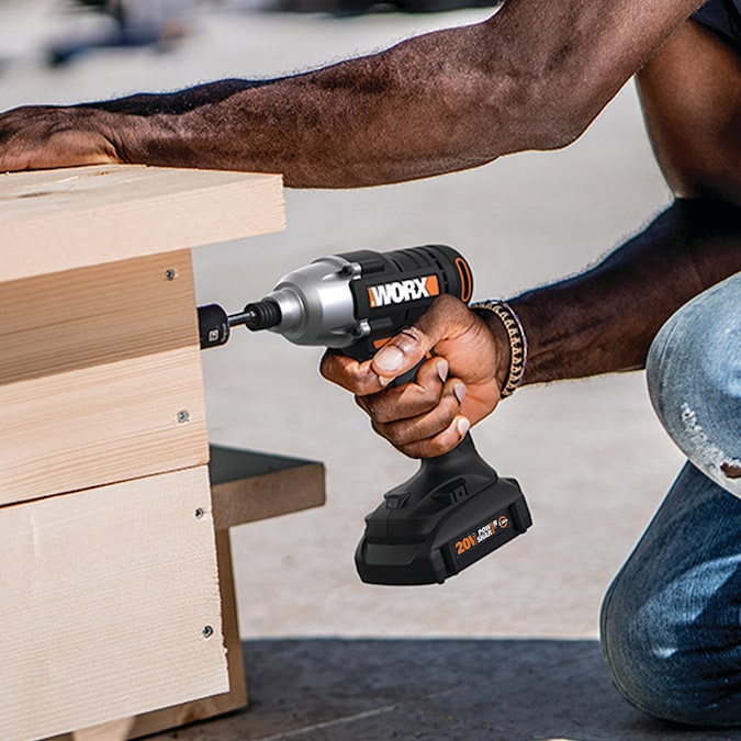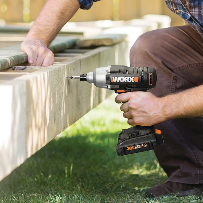 This versatile, powerful, and compact 20V impact driver was designed to be strong enough to get the job done, yet small enough to get into narrow spaces. So you can bring all this force to places other drills have trouble fitting into. Its motor has been engineered with efficiency in mind, so it wastes little battery while still doling out 0-3300 pm and 1500 inch lbs of torque. Control the speed by pulling harder on the trigger, so you can decide exactly how much force each fastener requires. And the forward and reverse switch lets you back out slowly, too. The quality of life features on this drill are what sets it apart. It’s smaller and lighter than other drills with similar specs, so you can grip it tighter. Its handle is designed to be used for long stretches with its soft, over mold construction. And the LED light prevents you from ever having to work in the dark. The 0.25in hex chuck accepts all popular brands of bits and comes with a 2 Phillips screw driving bit, as well as a 5 hour charger and 20V 1.5 Ah Power Share battery. And that battery can be used on any power or garden tool on the Worx PowerShare platform. It’s an impact driver with modern features to make it easier on the user, but still built to perform for decades to come.