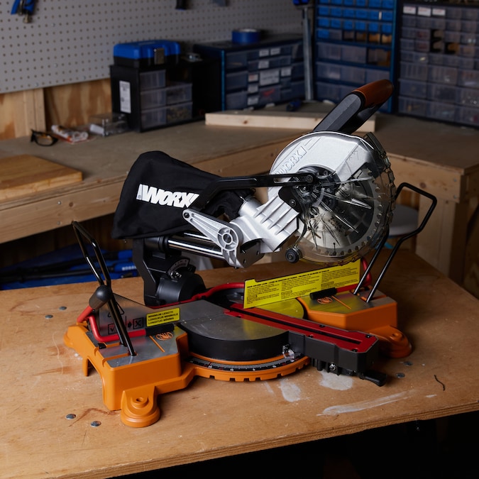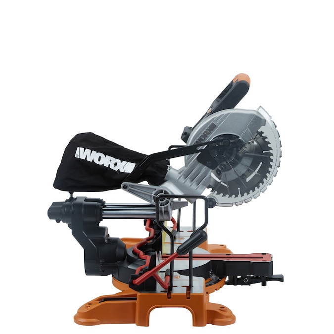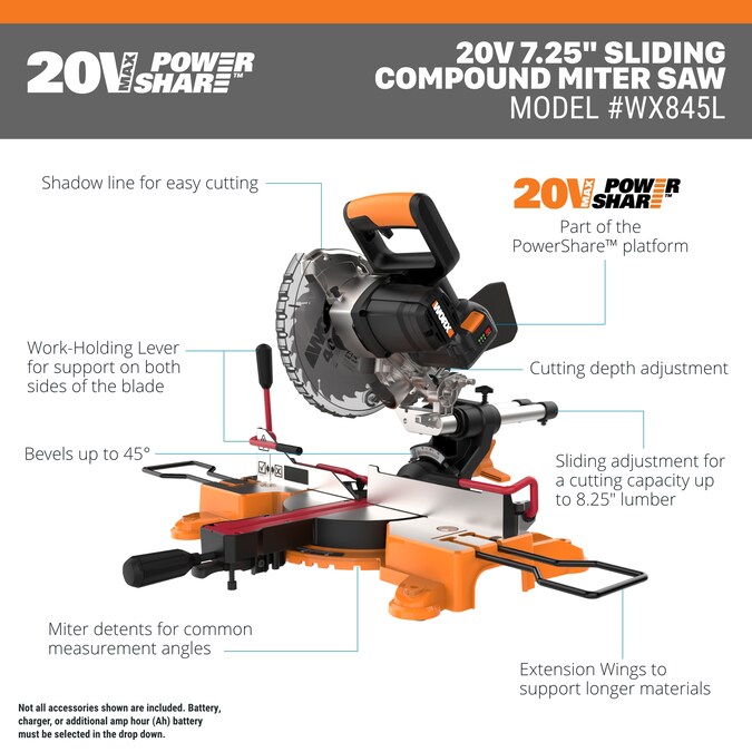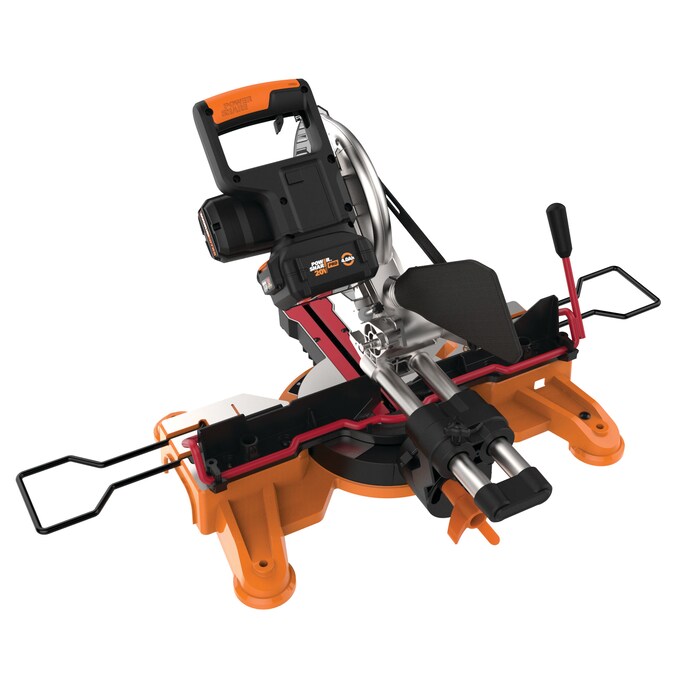 The Worx Nitro WX845L 20V Power Share 7.25 in. Cordless Sliding Compound Miter Saw has the power, expanded functionality, and run time needed to tackle advanced DIY projects or to use for professional work. This 20V Miter Saw is part of the Worx Nitro line of battery-powered tools, which, when paired with Power Share PRO high-capacity batteries, offer extended run times, plus more power and performance than other battery-operated tools on the market. 8-1/4 in. of maximum cutting capacity (at 90°) gives this Sliding Miter Saw professional-grade operability (5-3/4 in. at 45°). Work holding clamps on both sides of the blade and the extension wings hold projects of all sizes securely in place for safer, more efficient cutting, making this saw great at cutting flooring, crown molding, door frames and more. The bevel knob ranges from 0-45° allowing for perfect miter cuts, and cutting depth adjustments make partial cuts, dadoes and rabbets easy (maximum cutting thickness: 2-1/4 in at 90°, 1.63 in. at 45°), while the miter detents are handy for cutting the most common angles. This Sliding Miter Saw spins the 7-1/4 in. blade (5/8 in. arbor) at 3600 RPM of no-load speed. And when using a 4.0Ah Power Share PRO battery it offers longer run times than typical 20V Miter Saws. (Up to twice as long as standard 2.0Ah batteries.) It weighs only 21 lbs. so it’s easy to transport from the workshop to the jobsite, saving you the time and hassle of bringing projects back and forth.