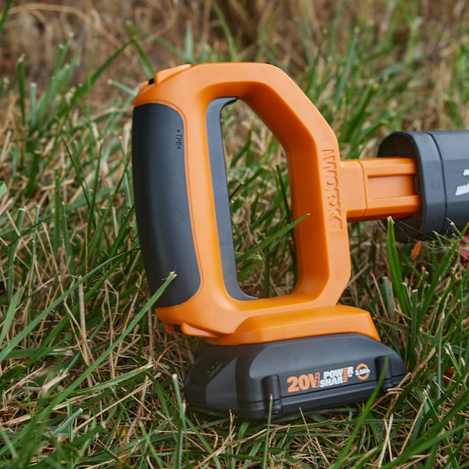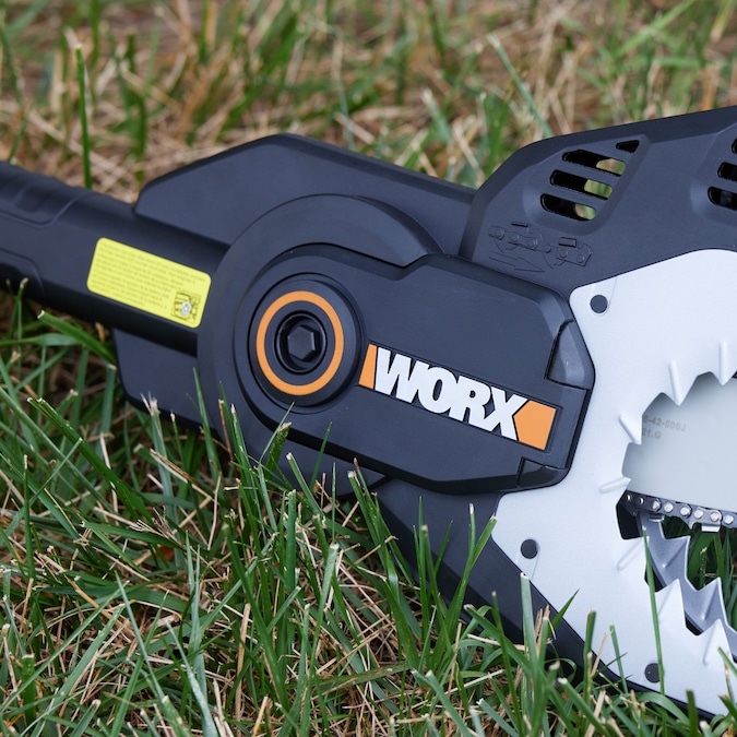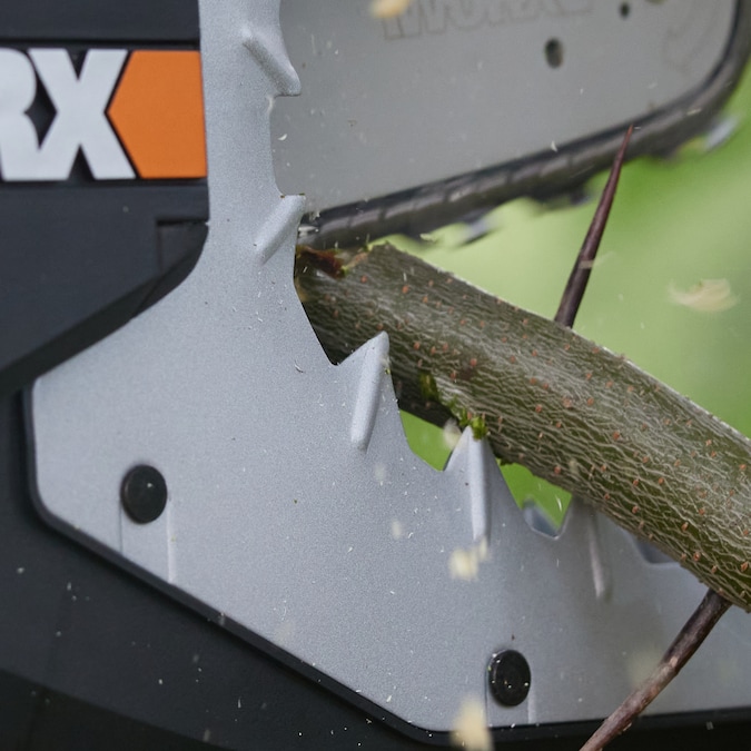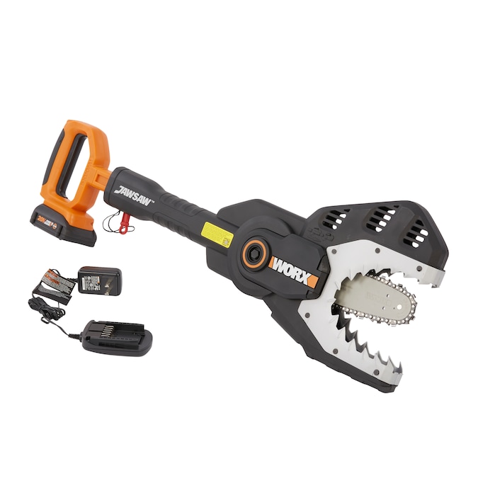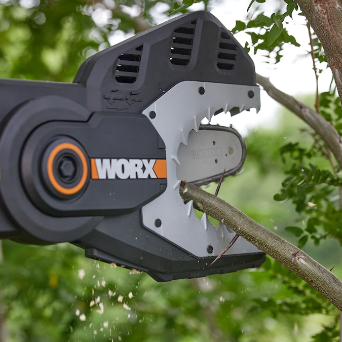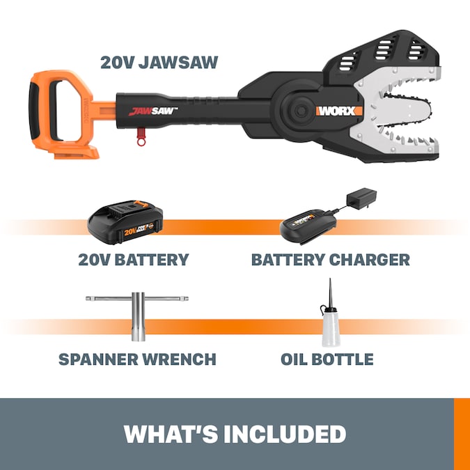 With a fully-enclosed bar and chain, the Worx 6” 20V JAWSAW Chainsaw is the safest chainsaw you can buy. The bar and chain actually retract into the neck of the tool when not in use, so you’ll never have a bare chainsaw just lying around the yard. And when in use, the thick protective housing prevents the blade and chain from ever getting outside of it. The bar moves up and down to accommodate branches up to 4” thick, but far less of the chain is ever exposed. Plus, the housing acts as prop for cutting branches on the ground. With a traditional chainsaw, you have to prop them up first to safely cut them, but with the JAWSAW, you can get to work on fallen branches right from the grass or pavement. It’s lightweight, less than 8 lbs, so it’s easy to hold up high and cut above your head. As a matter of fact, it’s compatible with our 5-foot pole attachment (sold separately), so you can trim tree limbs without having to get on a ladder. That’s safer, too. And the auto-tension and auto-oiler systems will keep the chain operating at optimum levels throughout the life of this tool. This model comes with a 20V 2.0Ah battery and 0.4A charger, which you can use to operate any tool on the Worx Power Share platform. So the next time you buy a tool, you probably won’t need to buy a new battery.