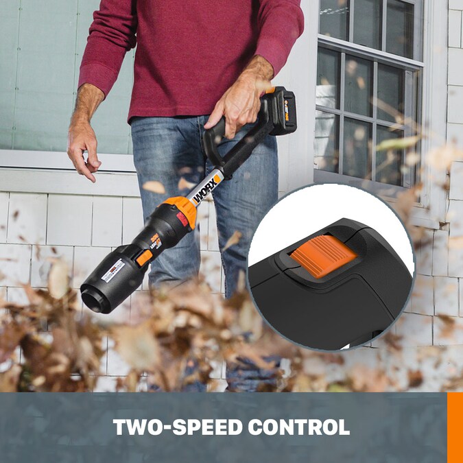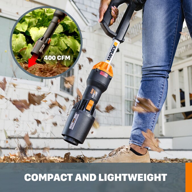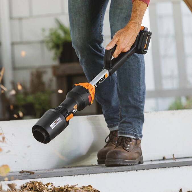 The Worx Power Share 20V LeafJet Blower weighs only 3.7 lbs, but spins out 130 mph of airspeed, at a significant 410 CFM (Cubic Feet per Minute), with 7.3 N of blower force. So you get a stream that is forceful and wide. Worx engineering can take a victory lap with this one. It is slimmer, easier to operate, more efficient than most leaf blowers on the market, and still churns out enough power to clean larger lawns. Sonic Turbine Tech is the main innovation driving all this power out of such a compact design. Air Amplifier Tech draws more air into the turbine than ever before, allowing it to push more and faster air out the other side. What’s more, this tool runs on a brushless motor, which are more efficient than the motors in leaf blowers from just a few years ago. They use less battery while providing even more power, and have a longer runtime. Plus, they extend the life of the blower overall. Additionally, because this tool is lightweight, you will get more done in less time because it is so simple to blow your lawn clear of leaves of debris. Now nearly anyone in the family can help out with the chores. This Worx Power Share 20V LeafJet Blower comes with a 4.0Ah battery and a 2-Amp charger. That’s plenty of power to take a spin around a decent-sized lawn. And this battery runs every tool on the Worx Power Share platform, so you can grow your collection without always having to buy a battery.