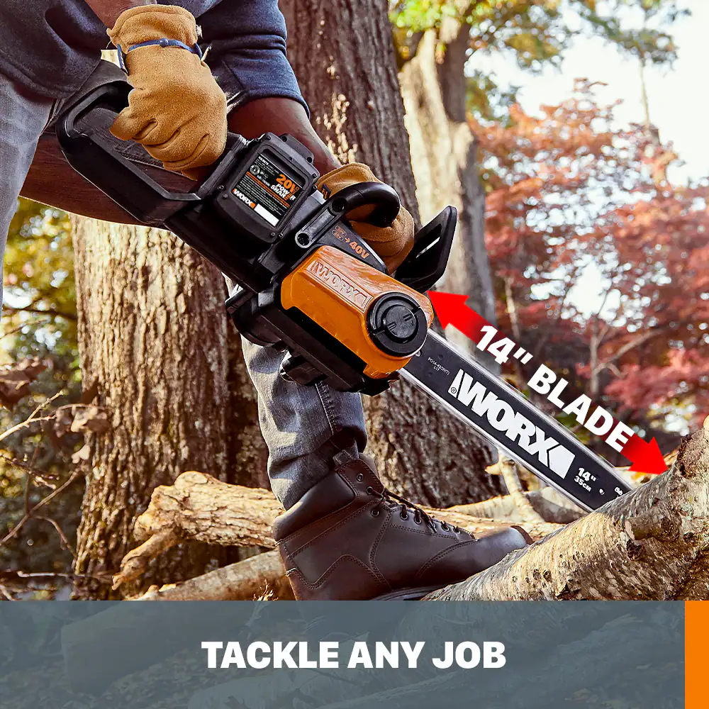 Gas-like performance without all the drawbacks of gas. That’s what the Worx 40V Power Share 14” Cordless Chainsaw gives you. We’ve doubled the volts of our standard Power Share tools and made a chainsaw powered by two 20V batteries. Double the run time and upgraded performance but still with cordless convenience and without the smell or expense of gasoline. We’re able to achieve this on account of the saw’s high-efficiency brushless motor. As part of the Power Share platform, it uses the same batteries as every other tool, outdoor power and lifestyle product in that family. It’s more durable and uses less battery than a motor based around a brush design. It spins the 0.043” gauge chain, with a 3/8” pitch, at 26ft/s. So you’ve got all the power you need to perform every regular chainsaw job. Cut 26” diameter logs on the ground or 13” diameter trees that are still standing, for instance. Auto-tensioning and auto-oiling systems keep the bar and chain running at peak performance throughout the entire life of this tool. And on-board battery charge indicators, and oil-tank markings, let you know when you’ll need to recharge or refill the oil. Plus, the quick-stop chain brake adds an extra level of safety to this saw, so you’ll know you can always shut it down at a moment’s notice.