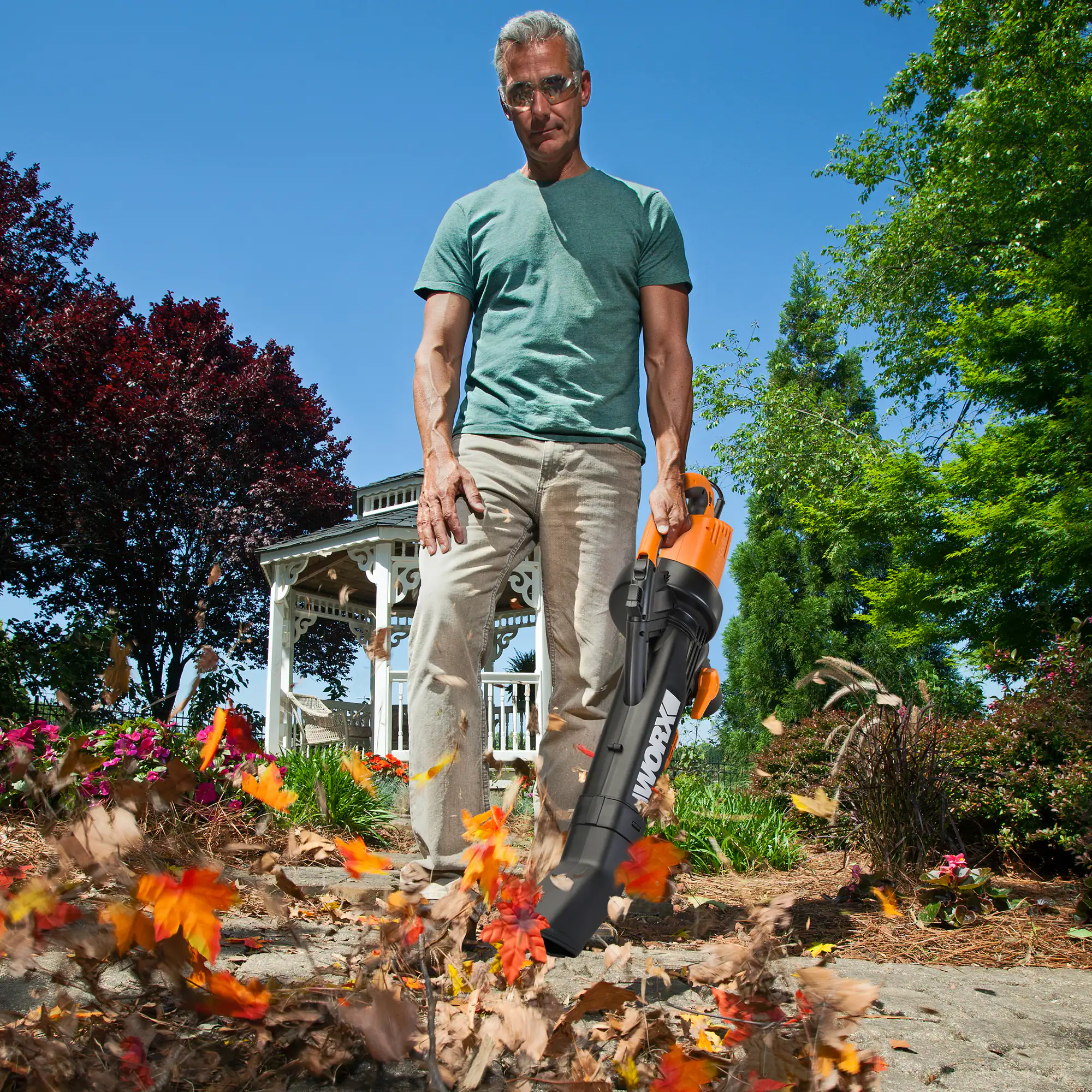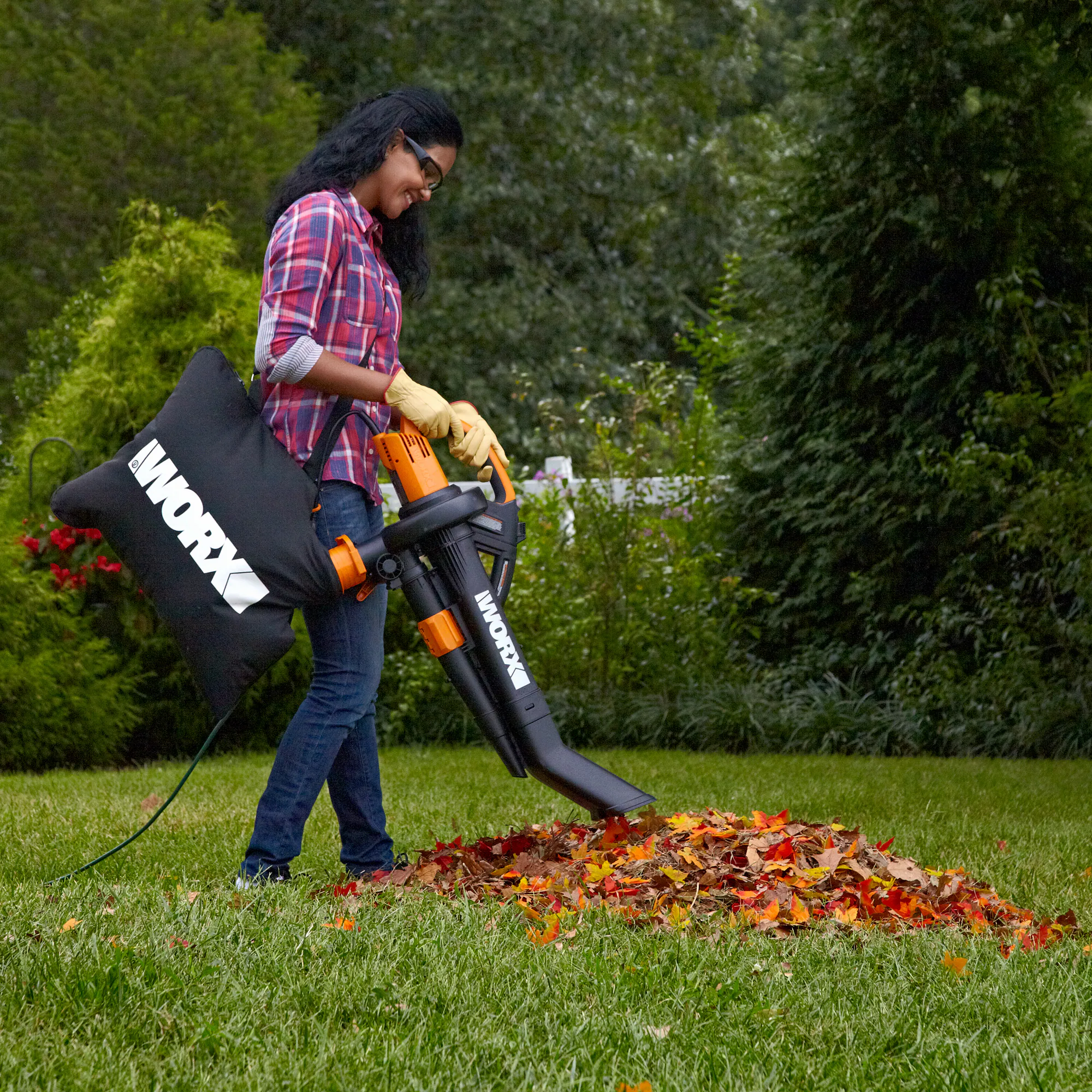 The Worx 350 cfm – 12A Electric TRIVAC Blower/Vac is your 3-in-1 complete leaf and debris clearing system. Blow the leaves into a pile, flip the switch and suck them up and mulch them into the collection bag, and dump it for compost or collection. It takes a chore that often lasts all afternoon and makes it go much quicker. It takes 18 bags worth of leaves and chops it down into 1 with its powerful two-stage metal impeller and shredder blades. If a leaf blower is better than a rake, the TRIVAC is better than a regular ol’ leaf blower. You don’t even need to switch out tubes to change between functions. You just flip a switch. And that tube is angled so you can get under patio furniture and the deck without having to squat or get on your hands and knees. And even though this machine blows out air between 80 and 210 mph, it weighs less than 10 lbs and has been engineered to be operated with just one hand. That means almost anyone can use it to clean up the yard or blow out the driveway. The collection bag technically holds 1.2 Bushels of yard waste, but again, with the 18:1 mulcher, that’s going to be 18x more leaves than if you were raking or blowing the traditional way. Stop making yard work such a chore, and grab yourself a TRIVAC 3-in-1 Blowing, Vacuuming & Mulching System.