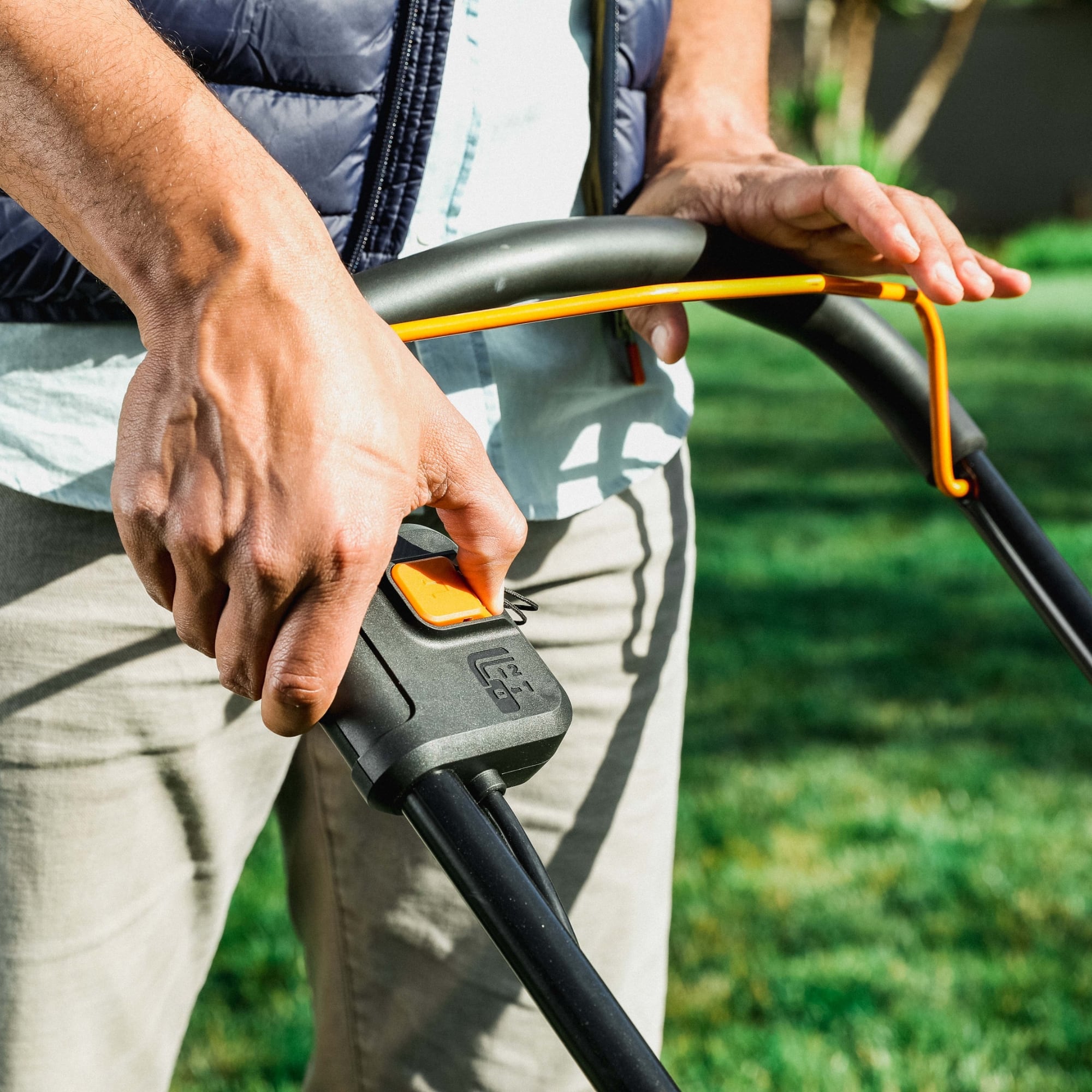 The 2-in-1 Bag & Mulch 40V Lawn Mower from Worx has all the power and advantages of a traditional mower, without the drawbacks. Battery-powered mowers are quieter, more efficient and cost effective, and cleaner to use for both you and the environment. And with double the power and double the runtime, this mower offers gas-like performance. As part of the Power Share platform, it uses the same batteries as every other tool, outdoor power and lifestyle product in that family. The two 20V batteries in this model to give it 40V of power, and this version comes with two 4.0 Ah batteries. That’s twice as much charge as the standard 2.0 Ah rechargeable batteries, for twice the runtime. You can mow up to 1/8 acre per charge. And we tossed in a dual-port charger, so you can “fill up” quickly. It takes 2 hours to charge both or if you just need one battery for another Worx PowerShare tool, you can charge one in just an hour. This is a modern mower with modern features. Intellicut gives you extra torque when the grass is thicker, and then lets you dial it back down to conserve energy when the terrain is smooth. The six cutting height positions range from 1.5”-4.0”, and the cut-to-edge placement of the blades lets you get closer to the house or garden for less trimming later.