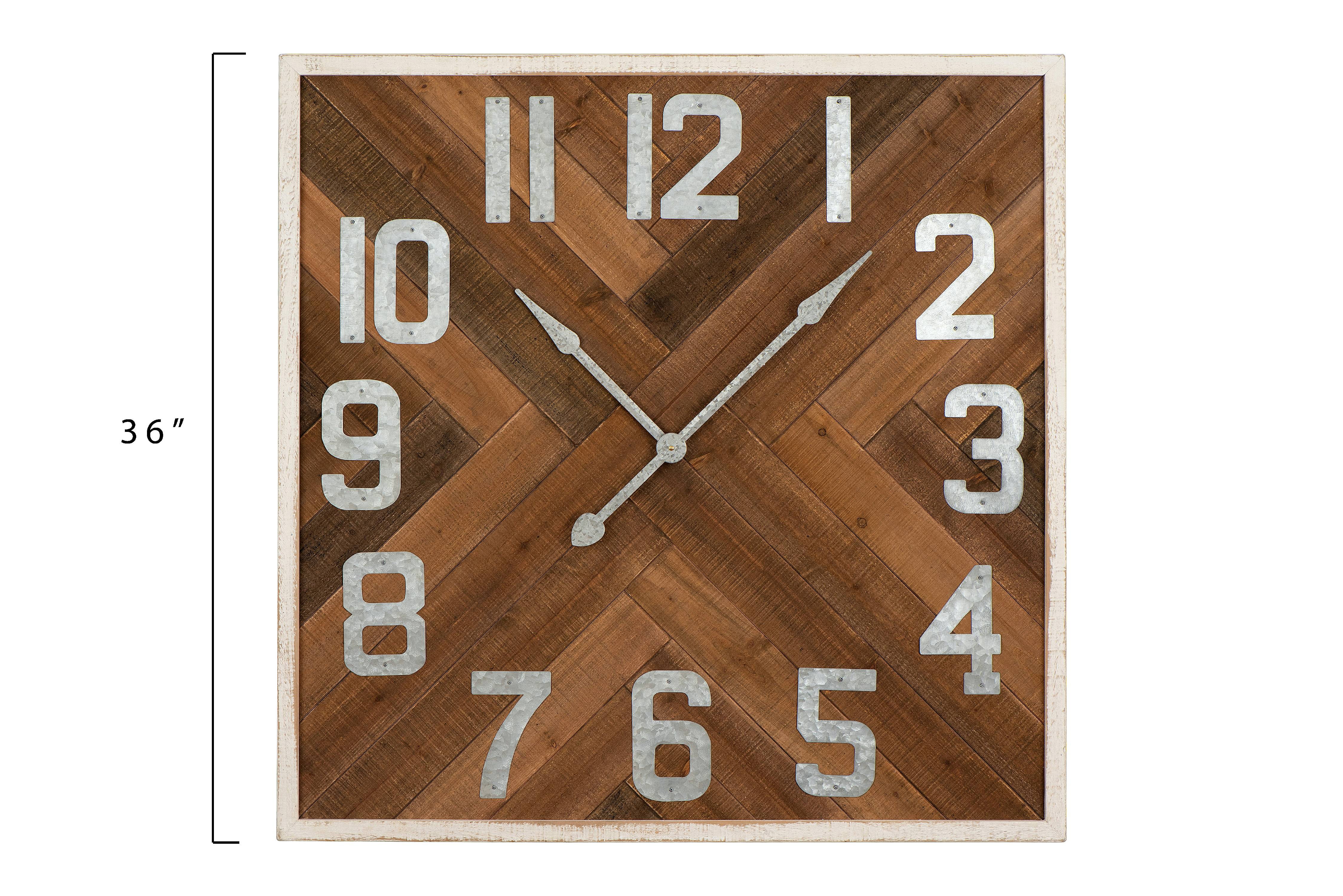 Woven Paths 36″ Square Stained Wood Wall Clock: Combination of wood slats in various lengths create a beautiful design Metal numbers are skillfully created and match the metal hand pieces 36″L x 2.25″W x 36″H Requires 1 AA battery (not included) Wipe clean with a dry cloth