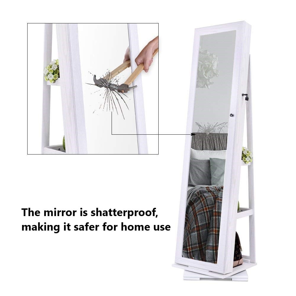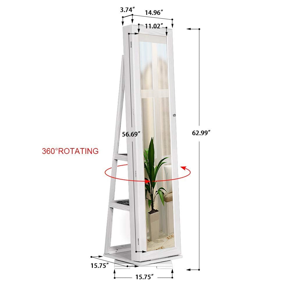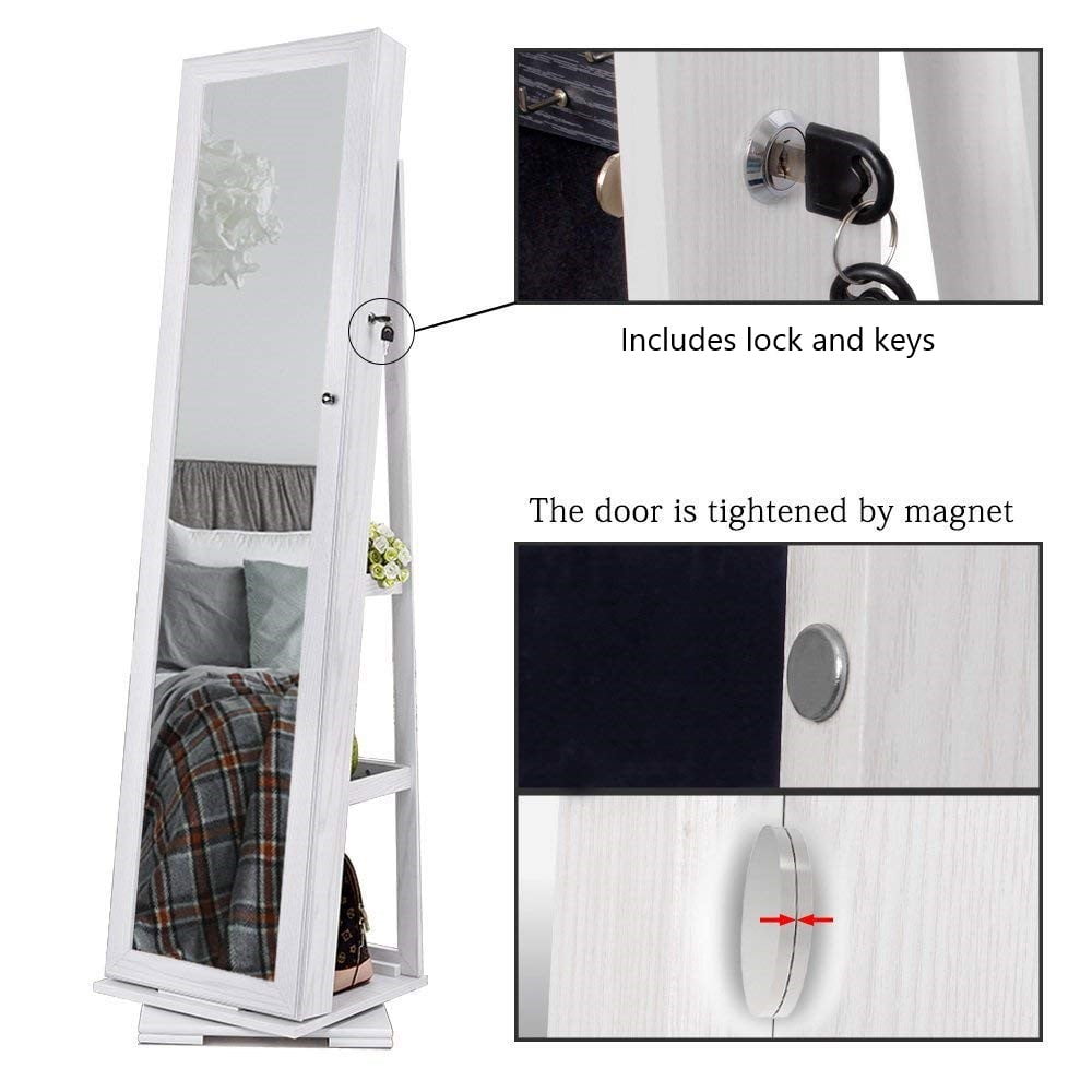 360-Degree Rotatable – 360-degree rotating design allows easy access to the items you’ve stored inside and backside the armoire. Full-Length Mirror – Equipped with a front 56” long full-length mirror to provide you a wide field of vision to guarantee your look absolute best from head to toe. Ample Storage Space – The cabinet can hold up to 90 rings, 42 pair of earrings, 30 necklaces, 2 storage bags, has 1 bracelet bar, and has 5 lined shelves for other items. High Quality Material – Made of environmental sturdy MDF panel and solid wood grain PVC surface. Secure Storage – Lockable design with a key and keeps your jewelry, makeup and other accessories safe and clean. Specification: Dimensions: 62.99″ X 15.75″ X 15.75″ Color: White Material: MDF Package Content: 1 x Jewelry Cabinet, 1 x Instruction Manual