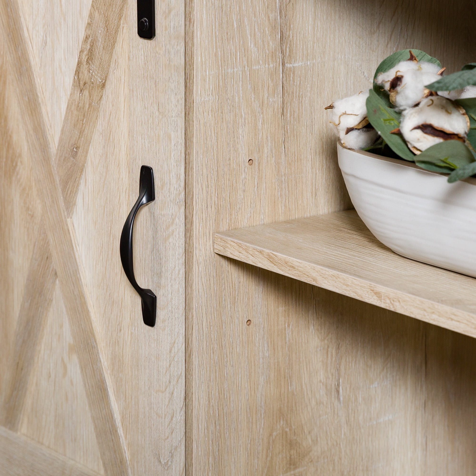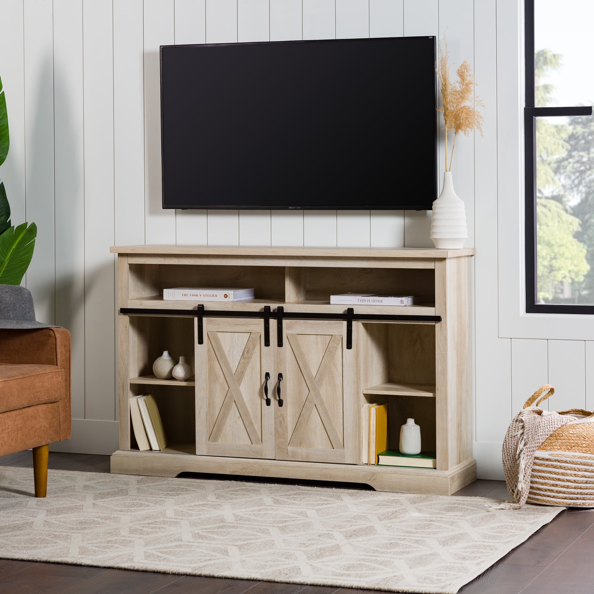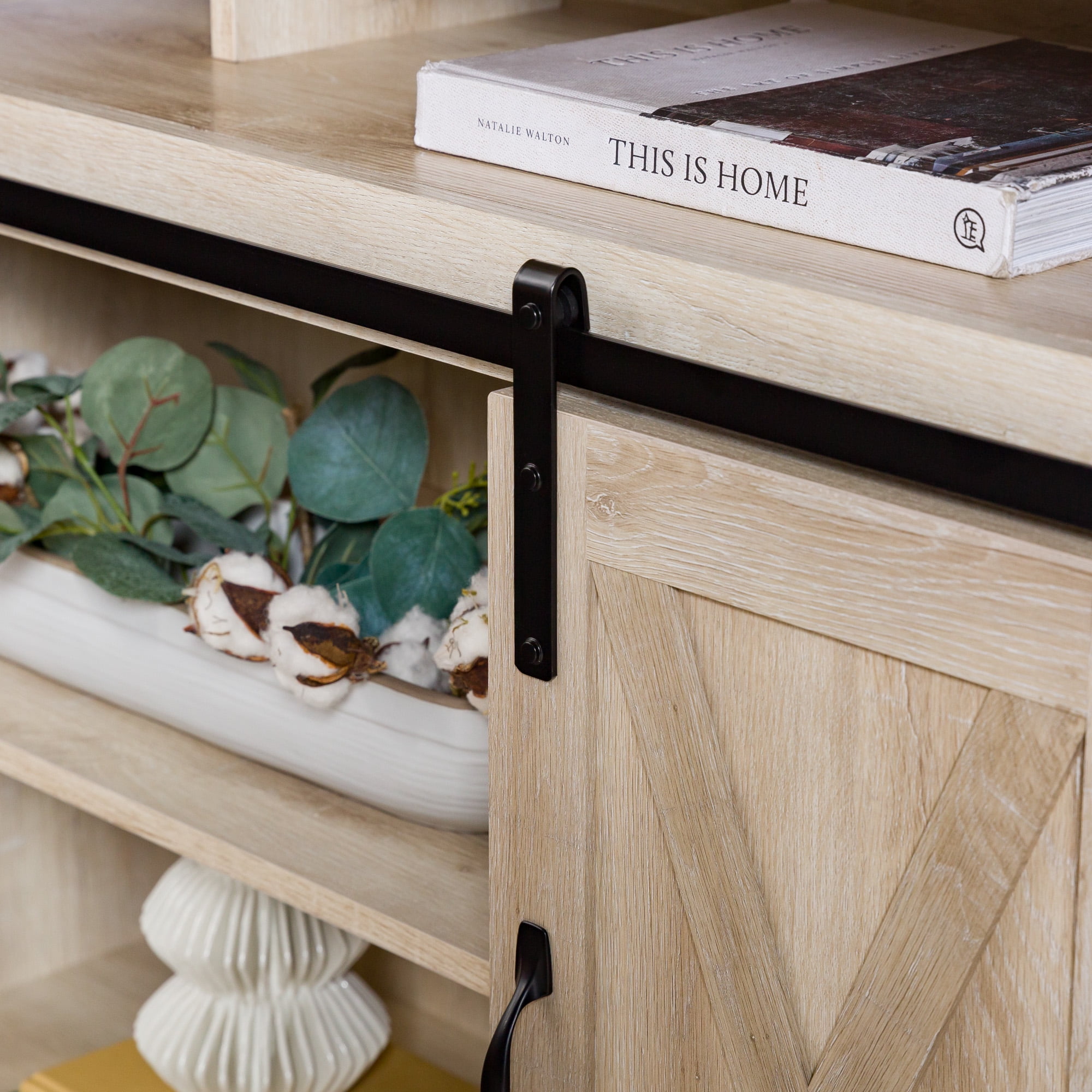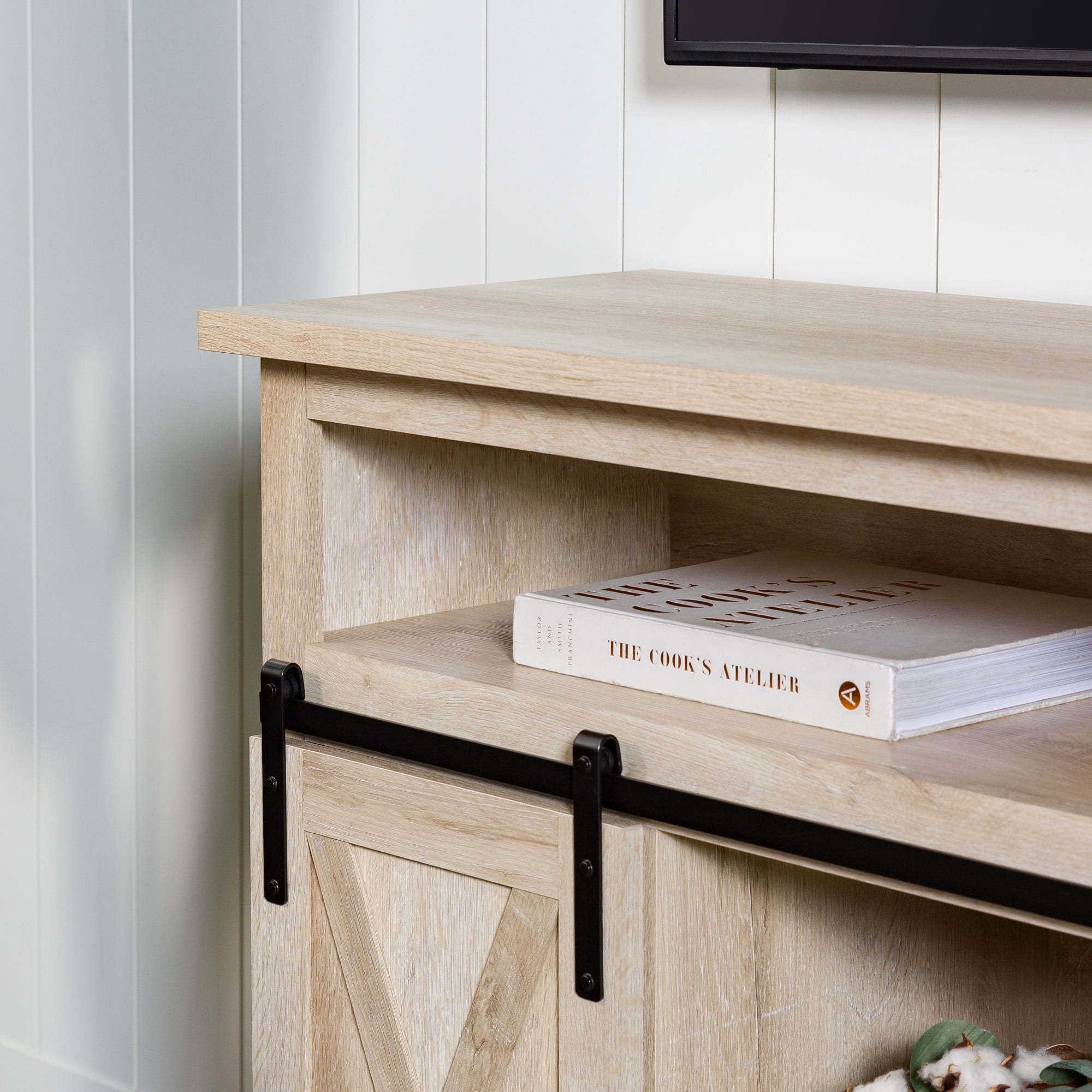Featuring a modern and traditional farmhouse style Made of high-grade MDF, durable laminate, and painted metal Can accommodate up to a 60″ TV Functional sliding barn door fronts Cord management options Adjustable shelves Open and closed storage