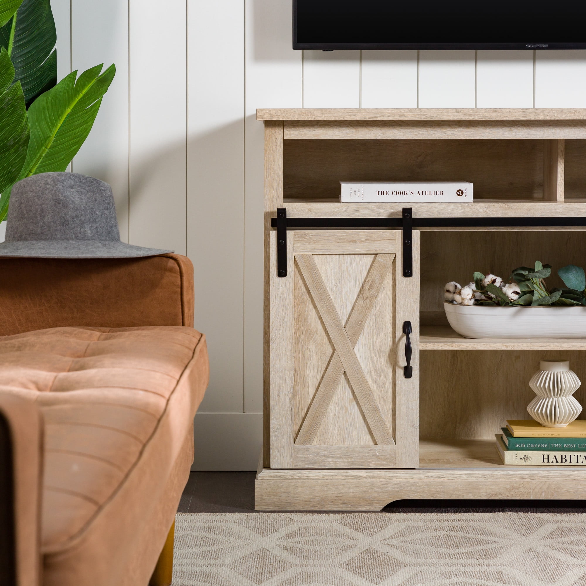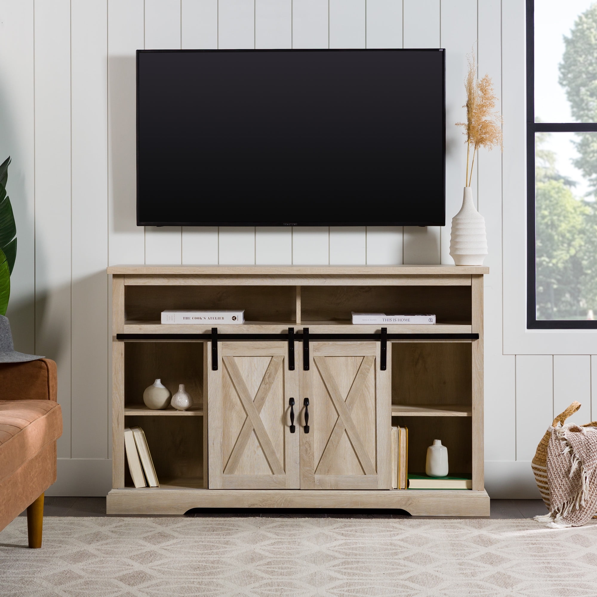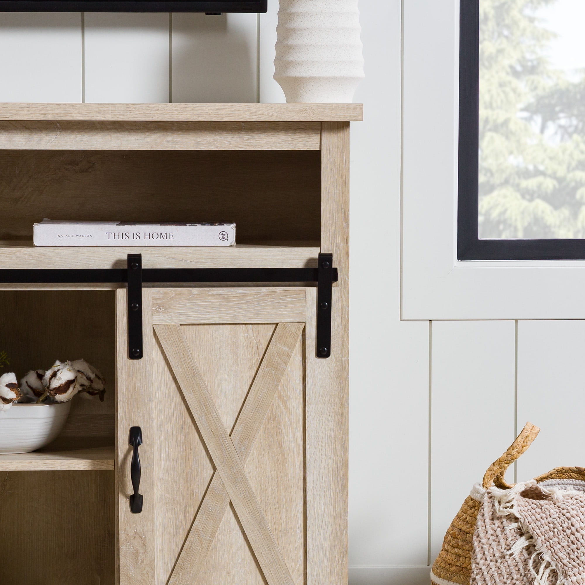 Bring storage space and a rustic design element your home with the Woven Paths Farmhouse Barn Door TV Stand into the living room or bedroom. Sliding barn doors on the cabinet space create a customizable storage experience and can hide any of the three adjustable shelves. Position the sliding doors in the center or sides, with your media, electronics, accessories, glassware, or decor on the shelves. The stand can accommodate TVs up to 60″ and the cord management holes keep cables organized for a tidy appearance. A versatile entertainment stand provides a modern farmhouse aesthetic that will last for years to come. Display your TV in style with the Woven Paths Farmhouse Barn Door TV Stand. The Woven Paths collection blends rustic farmhouse style with bohemian accents perfect for any season. This collection makes it easy and affordable to brighten up any room with cozy, vibrant, quality pieces.