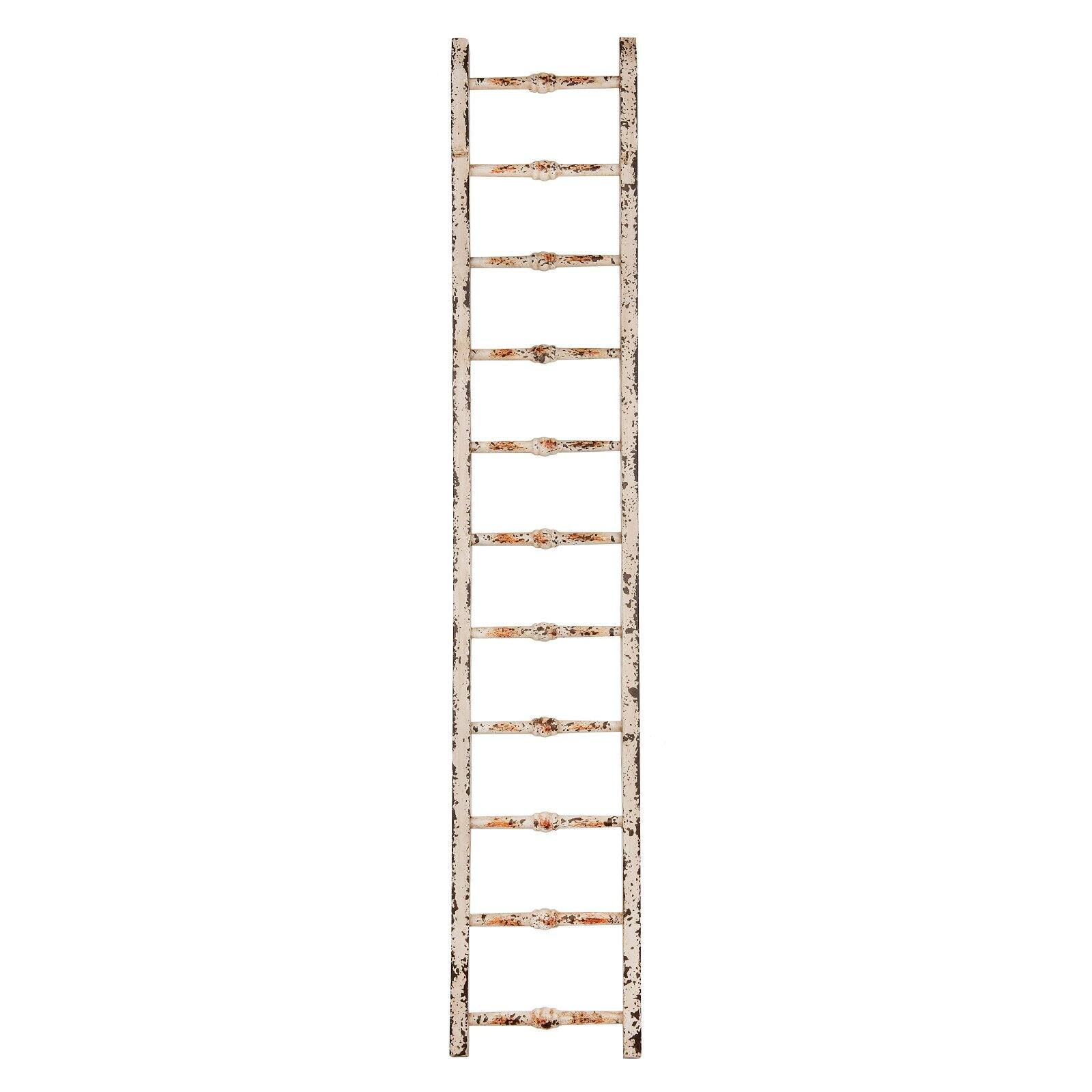 Woven Paths Farmhouse Distressed White Wood Ladder Decorative ladder ideal for displaying scarves, aprons, and more The distressed white finish adds a rustic charm to any living space Measures 12.25 inches in height, perfect for draping and hanging blankets and throws Versatile design can be used in various rooms, including bedrooms, living rooms, and bathrooms Can serve as a unique towel rack in the bathroom or a statement piece in any room