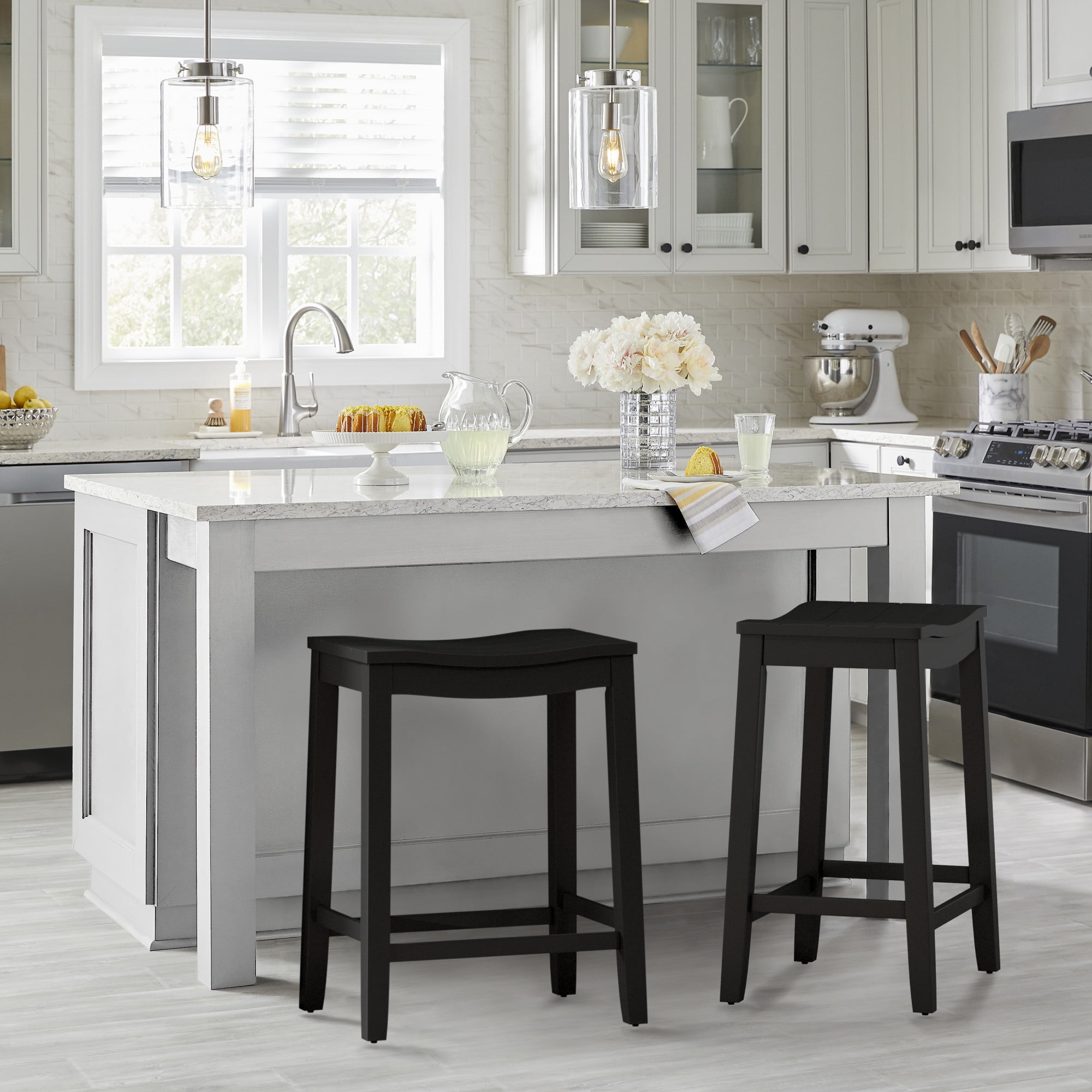 The Woven Paths Fiddler Backless Wood Counter Height Stool embodies coastal charm with a farmhouse flair. Our versatile backless counter height saddle stool has a wide wood shiplap saddle seat, perfectly curved for added comfort, and easily fits under kitchen islands or counter height spaces. The neutral black finish creates a stylish focal point for your dining space and is an easy addition to any decor. Durable wood flared legs add extra support and are complemented by perfectly a placed footrest adding an extra layer of comfort while eating, entertaining or working. Assembly is required. Add a farmhouse feel to any room with the Woven Paths Fiddler Backless Wood Counter Height Stool. The Woven Paths collection blends rustic farmhouse style with bohemian accents perfect for any season. This collection makes it easy and affordable to brighten up any room with cozy, vibrant, quality pieces.