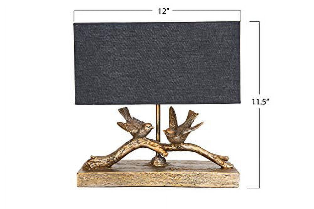 Woven Paths Gold Resin Birds on Branch Lamp with Flax Shade, 14.25″: Make a glowing vignette and bring garden-inspired style to your home with this 12-inch table lamp. Crafted from resin, the base features a tree branch design with two birds perched atop of it. Intricate carvings bring a lifelike quality to the piece, while the gold finish brings contrast to the rectangular linen shade. Place this luminary atop your foyer’s console table, and then pair it with a blooming floral vase and shimmering mirror to create an inviting display. Use it to illuminate a cozy reading nook by placing it on top of a side table next to an arm chair. Or, use it to round out a woodland-themed atmosphere in the guest bedroom.