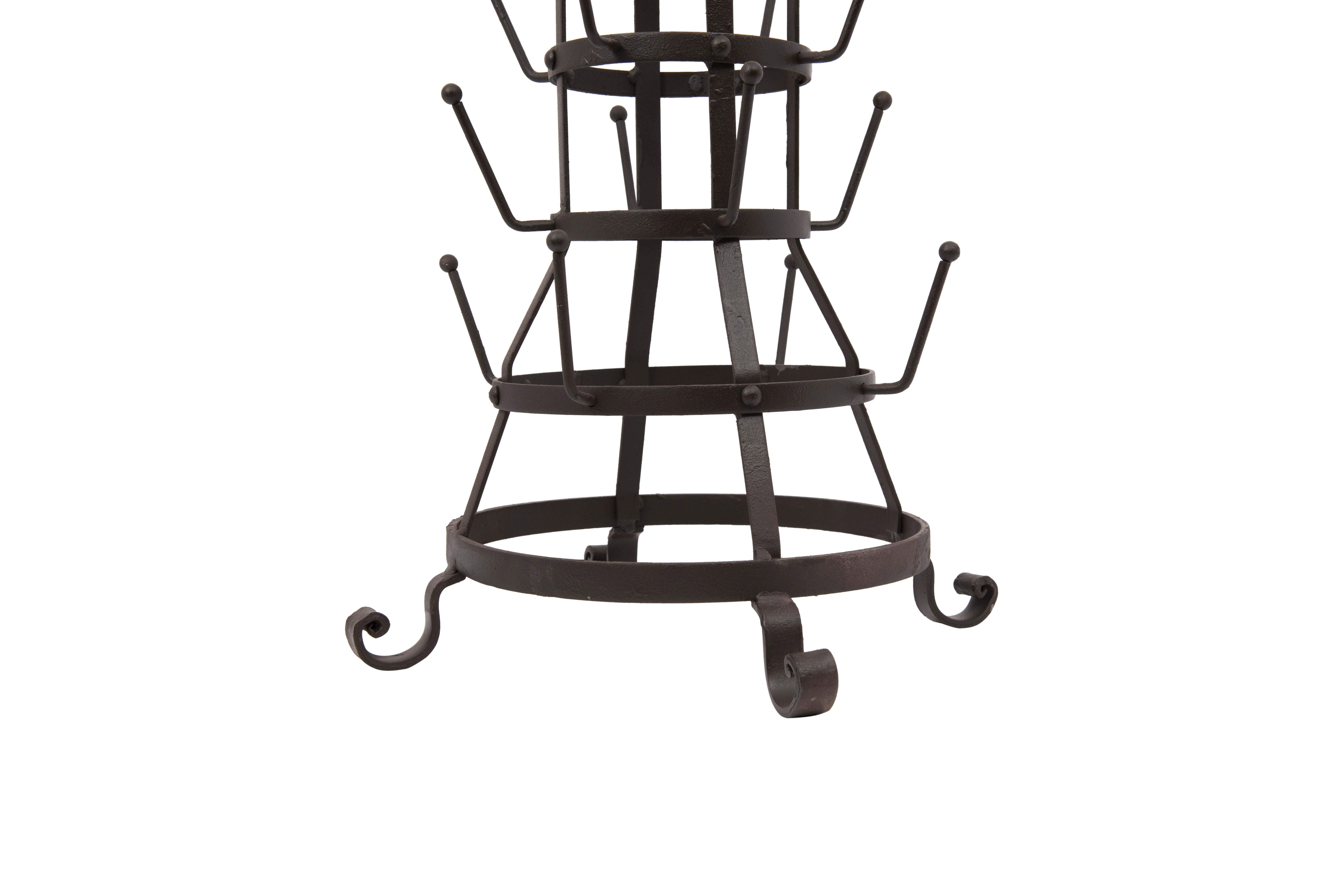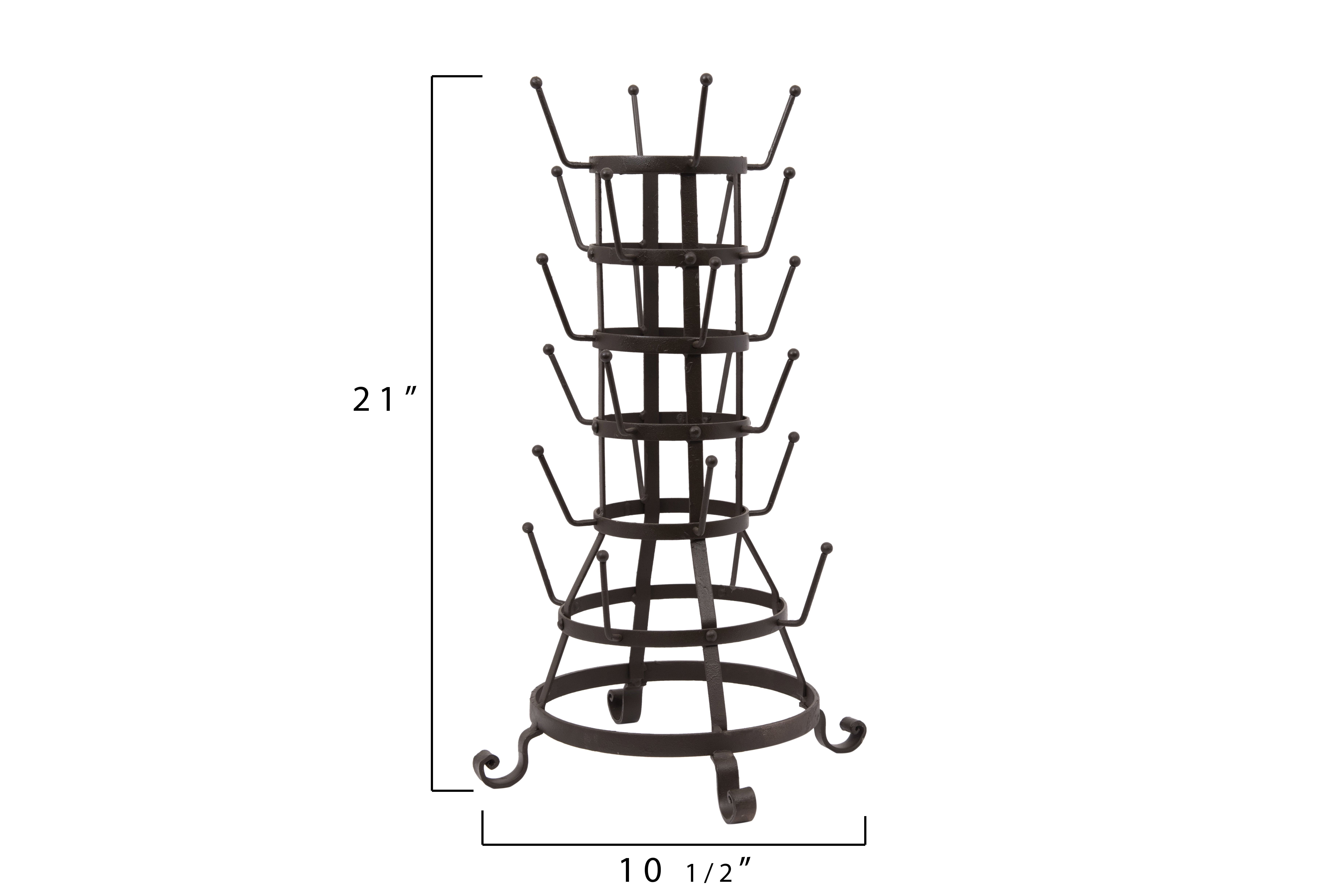 Woven Paths Metal Bottle/Mug Holder with 24 Hooks: Vintage-inspired bottle rack with black finish Can be used in a variety of ways Use for holding bottles, mugs, or craft items like ribbon and yarn Can accommodate up to 24 bottles or mugs Measures: 13.75″L x 13.75″W x 24.6″H Pair with other items from the Woven Paths collection