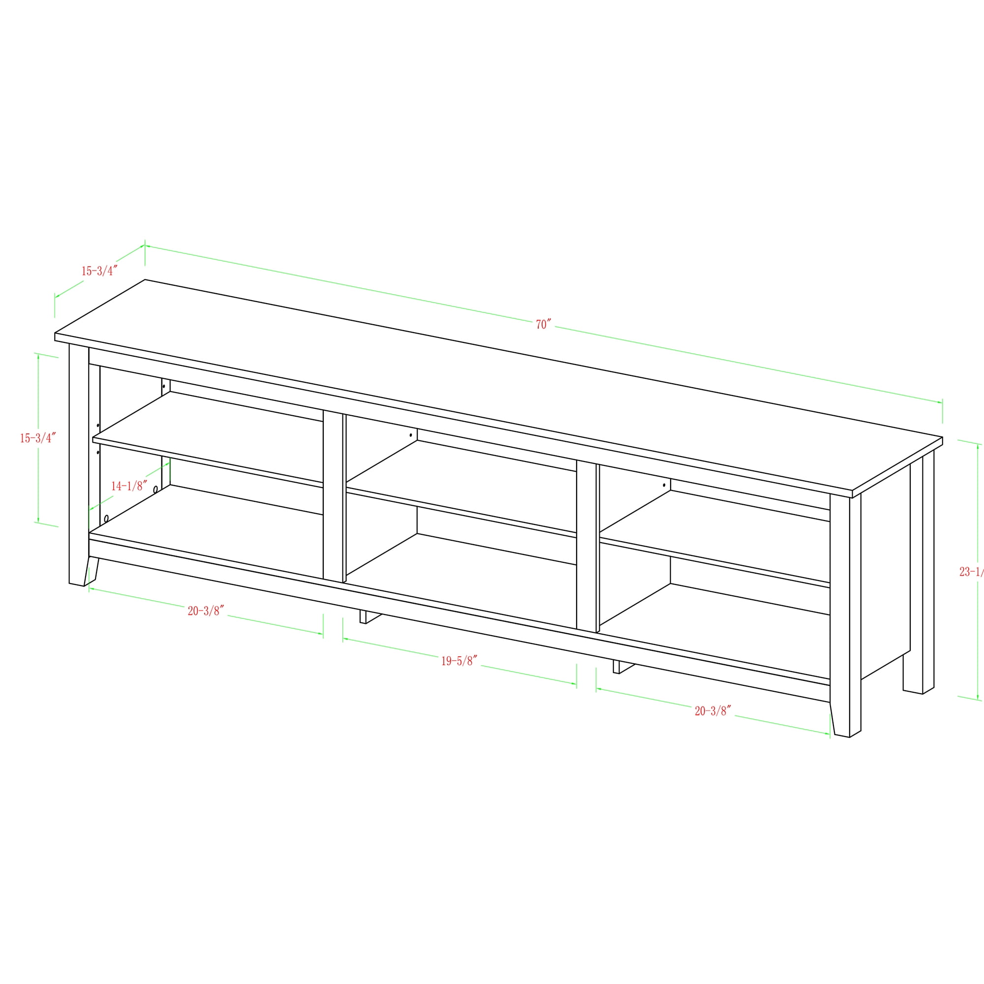 Woven Paths Open Storage TV Stand for TVs up to 78″, White Oak: Accommodates most TVs up to 78″ Adjustable shelving on both sides makes it easy to fit your media and more Cord management features to organize wires Outer opening dimensions are: 20-3/8″ W x 14-1/8″ D x 15-3/4″ H with an adjustable shelf in the center Center opening dimensions are: 19-5/8″ w x 14-1/8″ D x 15-3/4″ H with an adjustable shelf in the center Supports up to 250 pounds Dimensions: 70″ W x 16″ D x 24″ H Weight: 88 lbs Ships ready to assemble with step-by-step instructions