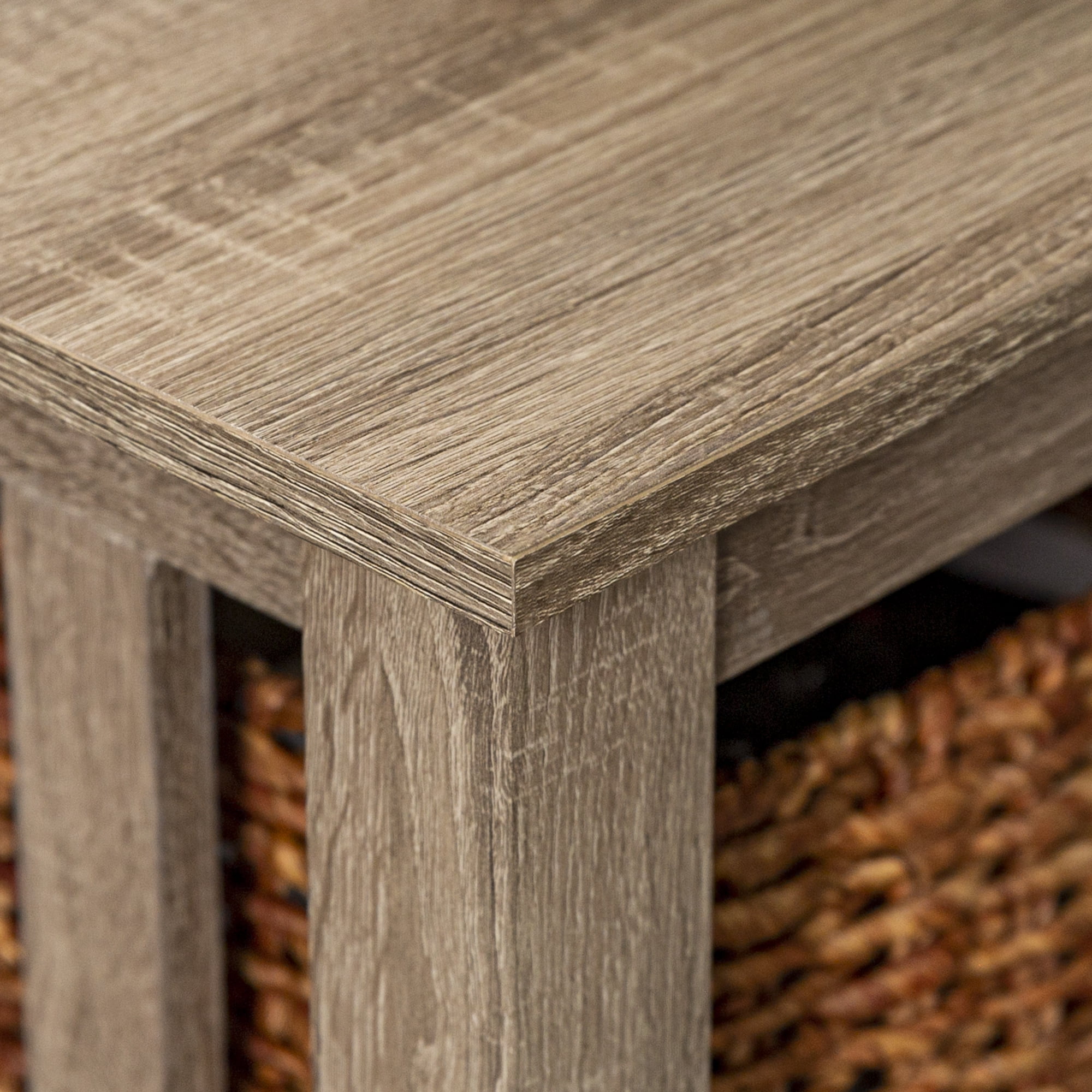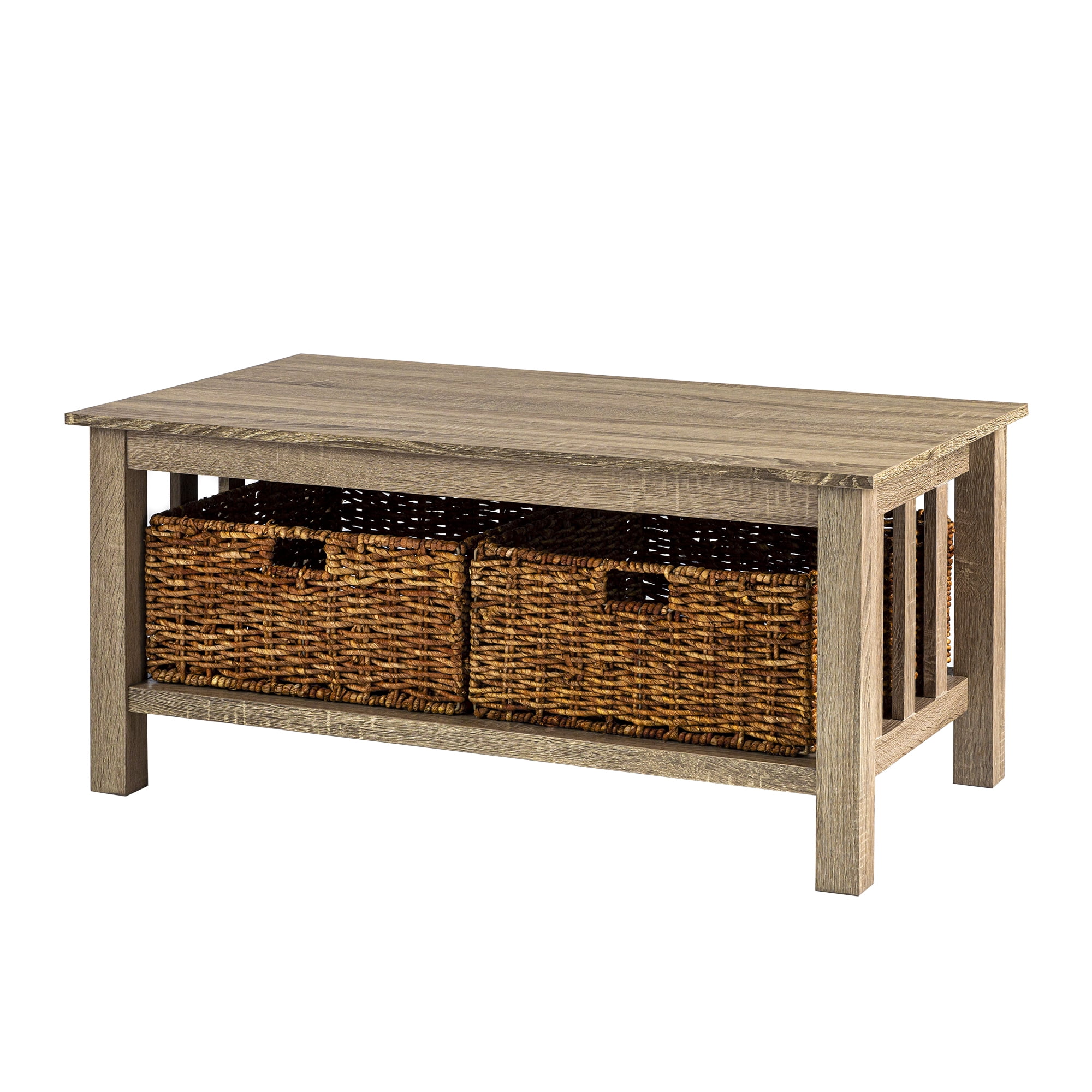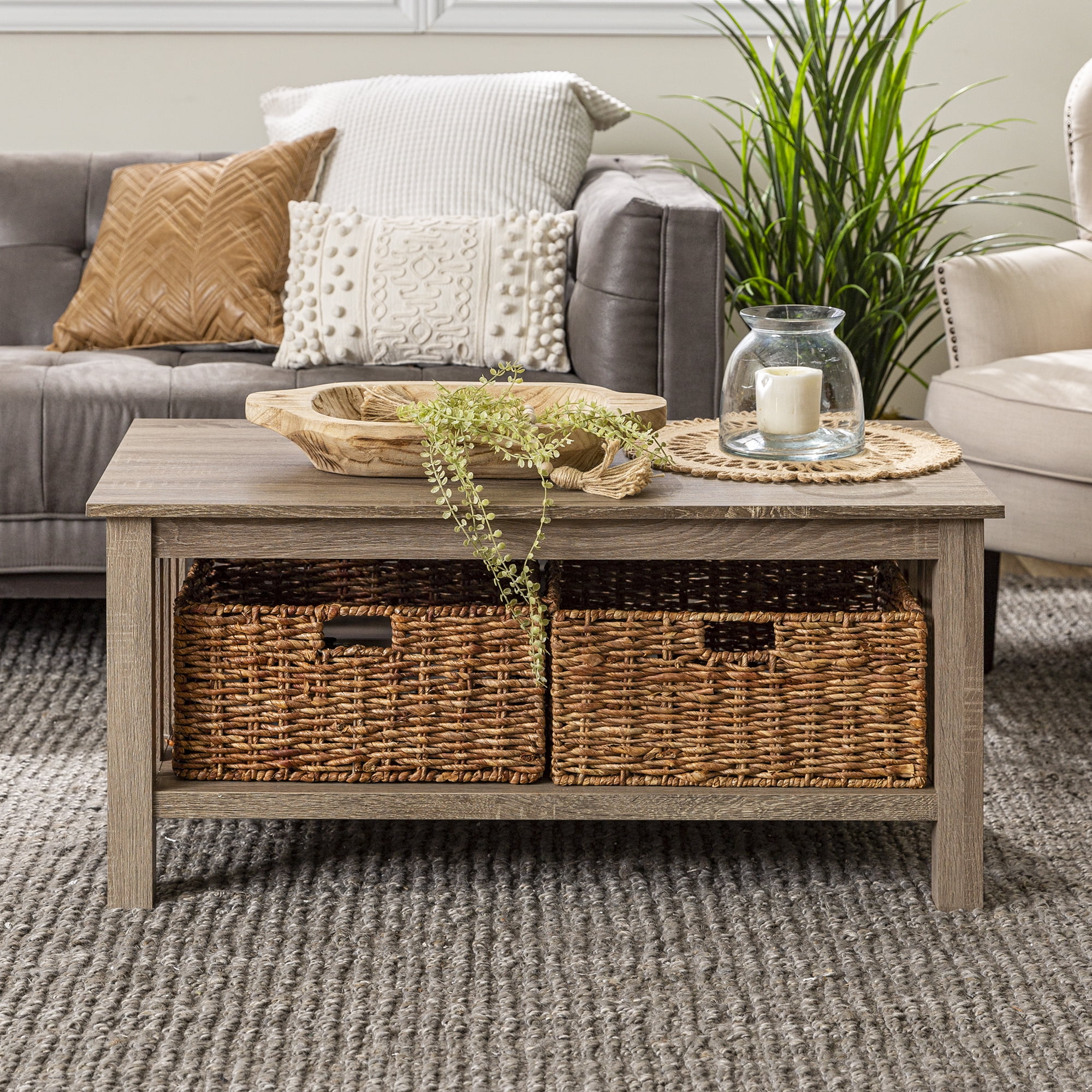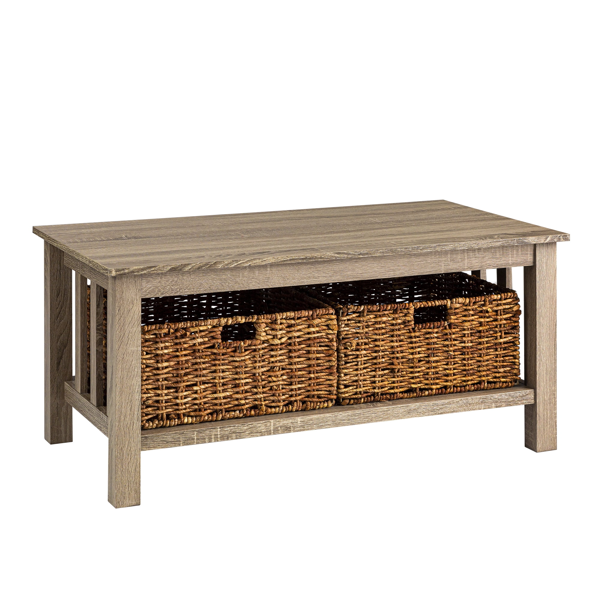 Woven Paths Traditional Storage Coffee Table with Bins, Driftwood: With a traditional style to incorporate into your living room Includes two wicker baskets for storage Made of high-grade MDF with a wood texture appearance Provides ample storage space in a stylish, elegant design In a driftwood finish Ships ready to assemble with step-by-step instructions Dimensions: 40″ W x 22″ D x 18″ H Weight: 49 lbs Premium 65-grain laminate with TruLife™ patterns. Our durable laminates are pressure-applied to certified MDF for maximum consistency and value. Note about wood composite or engineered wood: Often referred to as “MDF” which stand for medium density fiberboard, this type of wood composite is made of compressed wood fibers and has several benefits including affordability, consistency, and resistance to warping or rotting over time