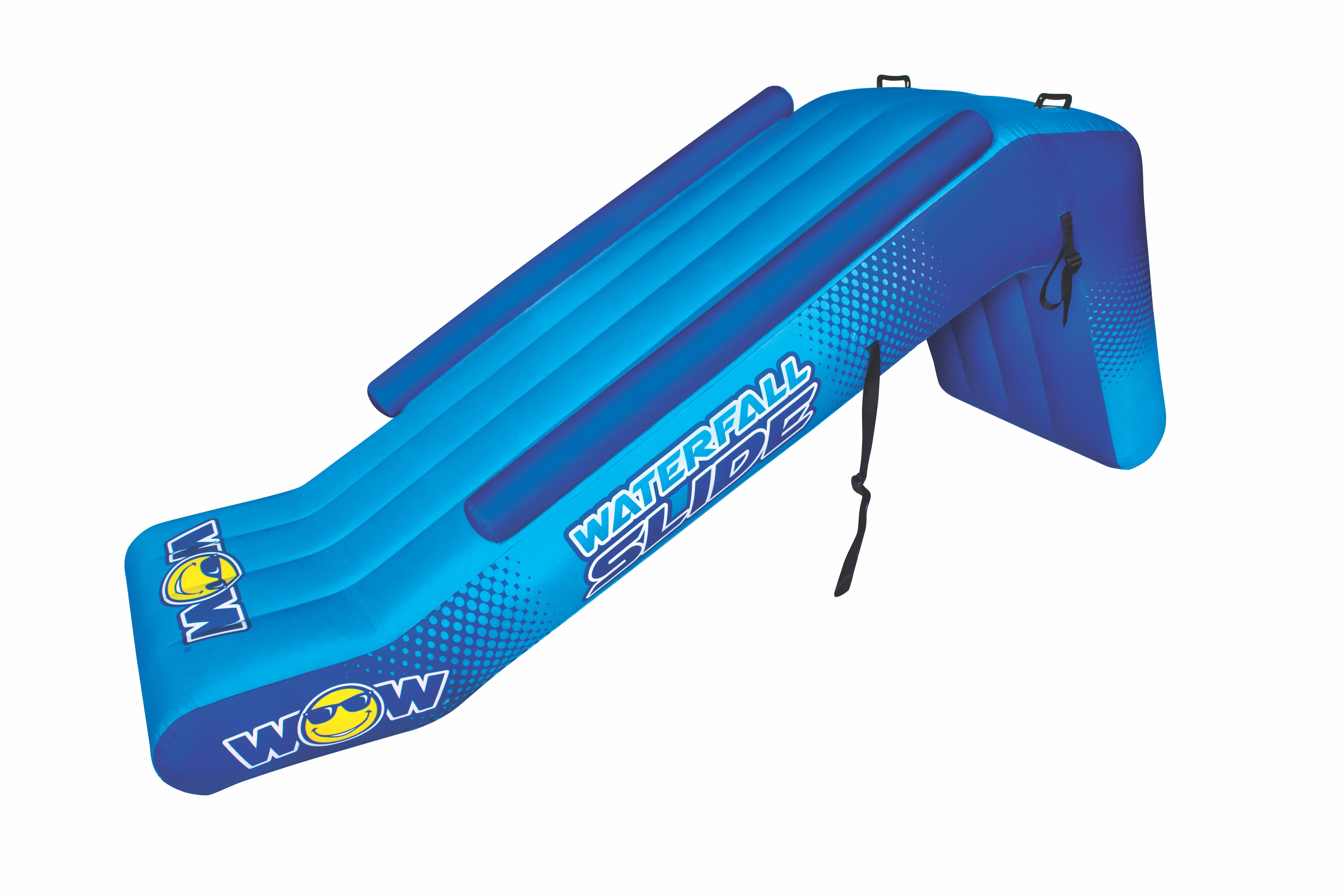 The Pontoon Waterfall Slide by WOW SPORTS turns any pontoon into a playground! Slide into the coolness of your favorite body of water. The Waterfall slide is made with a Premium layered reinforced PVC which makes it Ultra Heavy-Duty for heavy-duty fun. Capacity: 1 person (200 lbs. Max)Adjustable Straps let you fit the slide to most pontoon boats; Inflate & Attach to your Craft easily in minutes; 8-foot smooth glide sliding surface; Inflatable deluxe safety rails ; Molded steps and two molded handles make it easy to board; Deflate and fold up for EZ Storage; Take turns and slide one at a time; 1-year WOW warranty