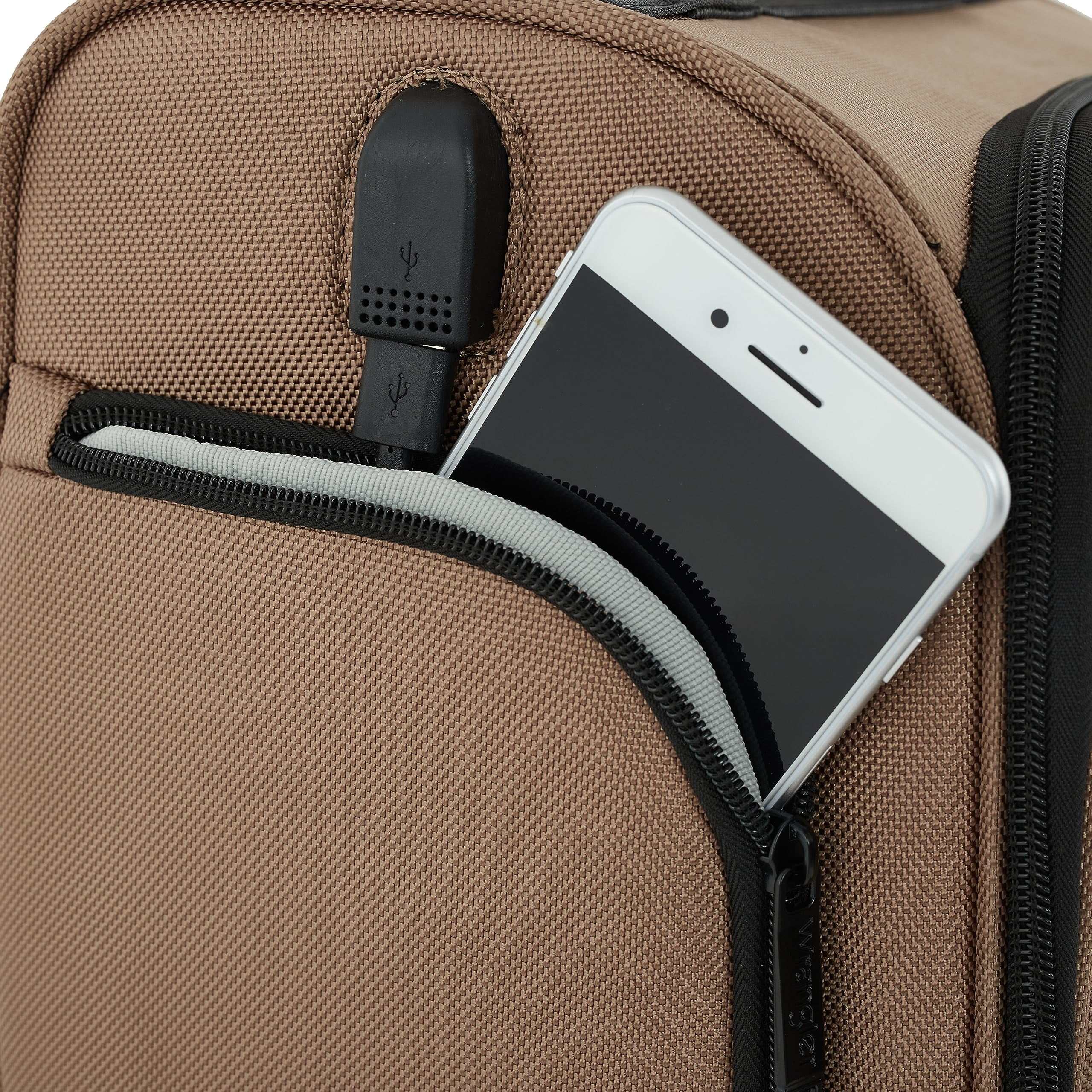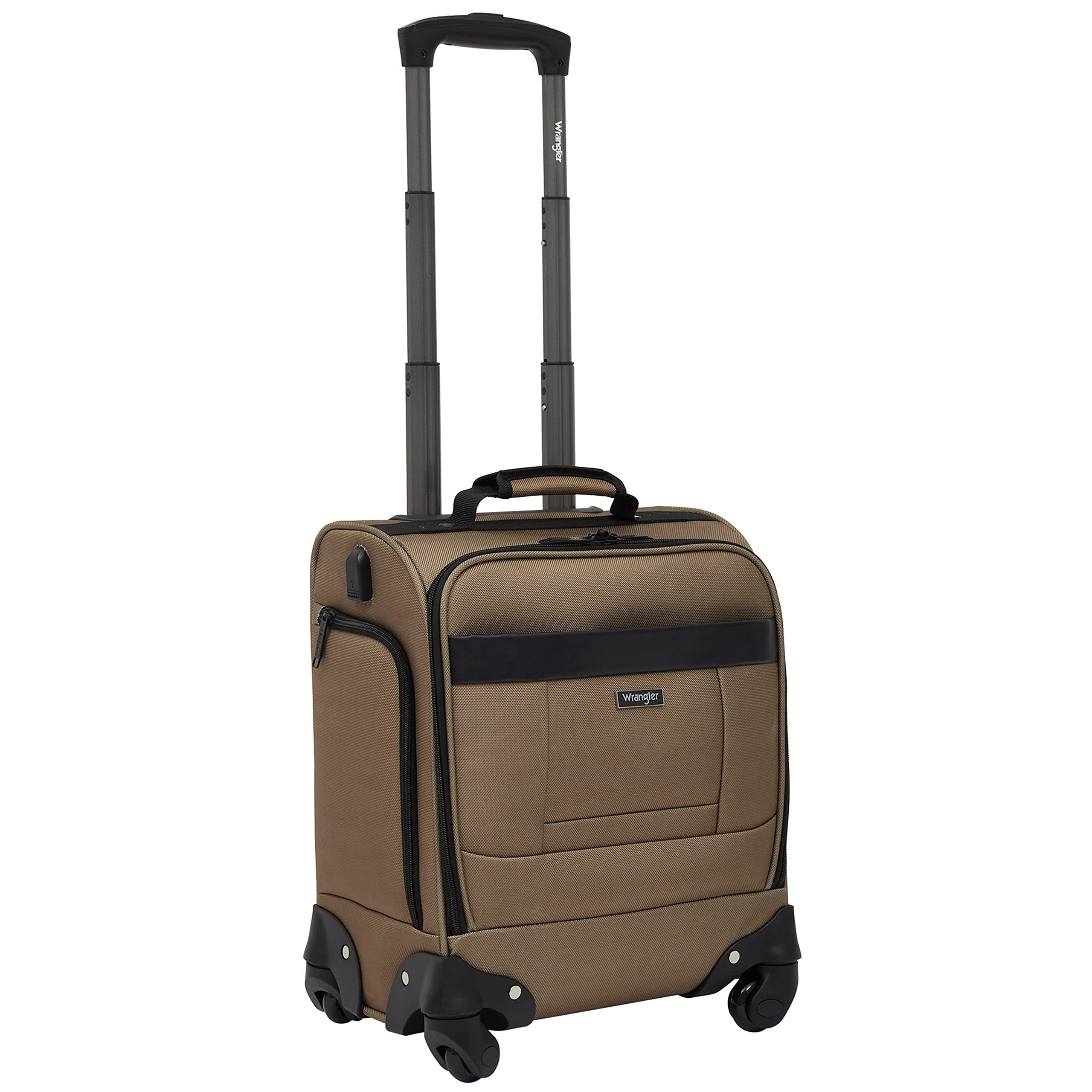 The Wrangler Brooks rolling 4-wheel under seater features 4 independent spinner wheels, adjustable telescopic handle and a side USP port, enabling you to charge all your devices. (Power bank not included). Convenient and compact, it’s designed to fit under most airline seats. Check with your carrier for their dimensions. With the wheels, it’s measures 16.5″ x 13″ x 8″ and is only 5.5 lbs. Additional features include a padded laptop section along with organizer pockets. Roomy front pocket and side pocket for your accessories. Made of heavy-duty polyester for reliability.