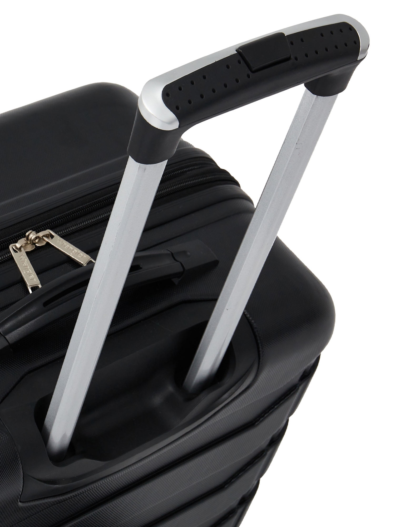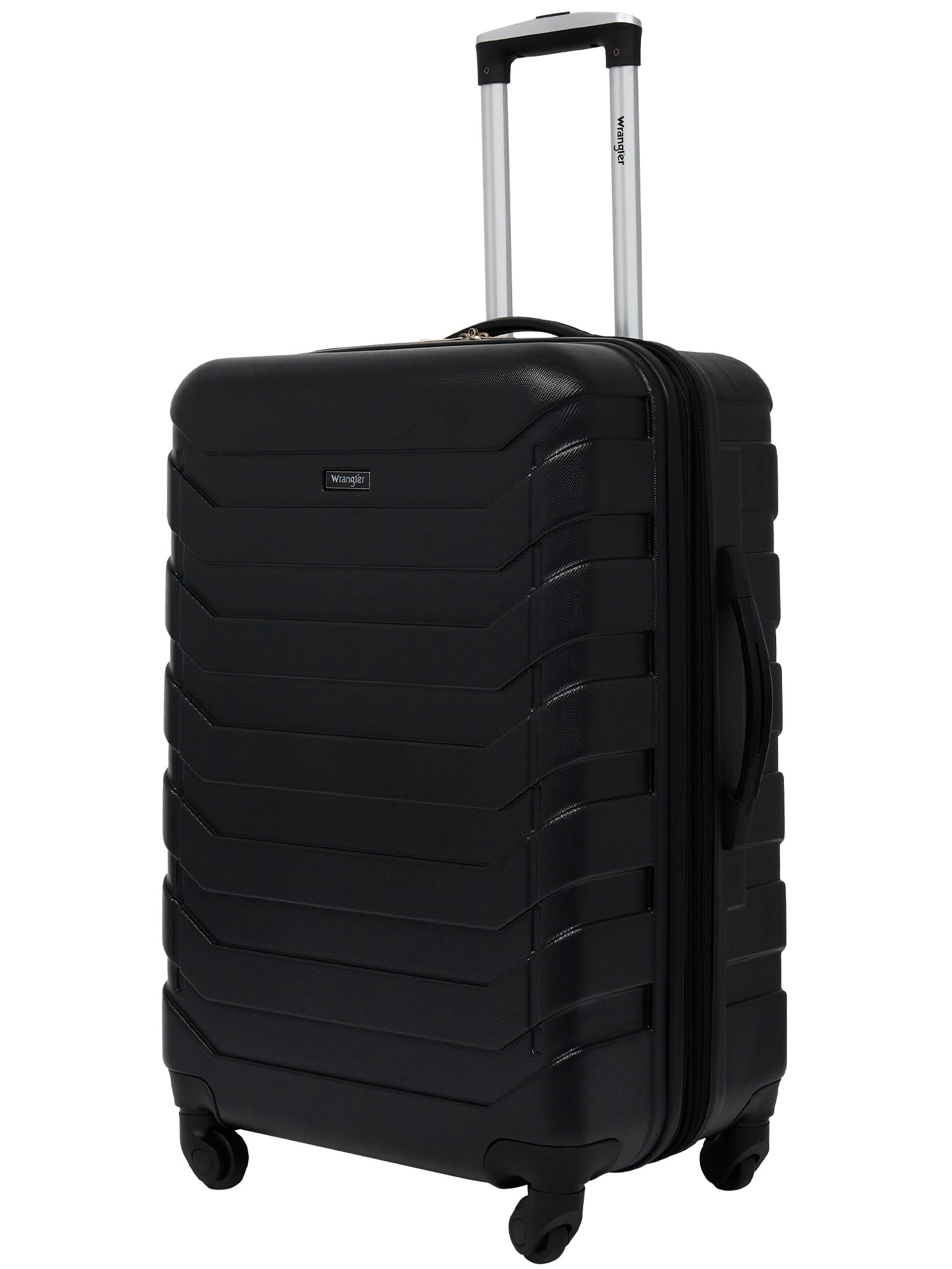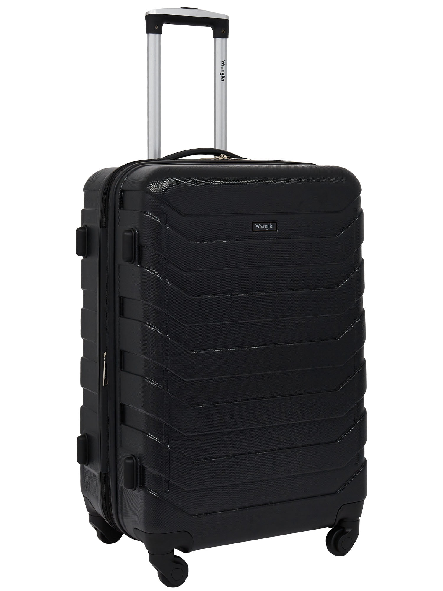 Push-button recessed locking handle system and 4-spinner wheels Top and side carry handles Fully-lined interior with compression straps Meets check-in requirements Matches the Wrangler 4 pc. set