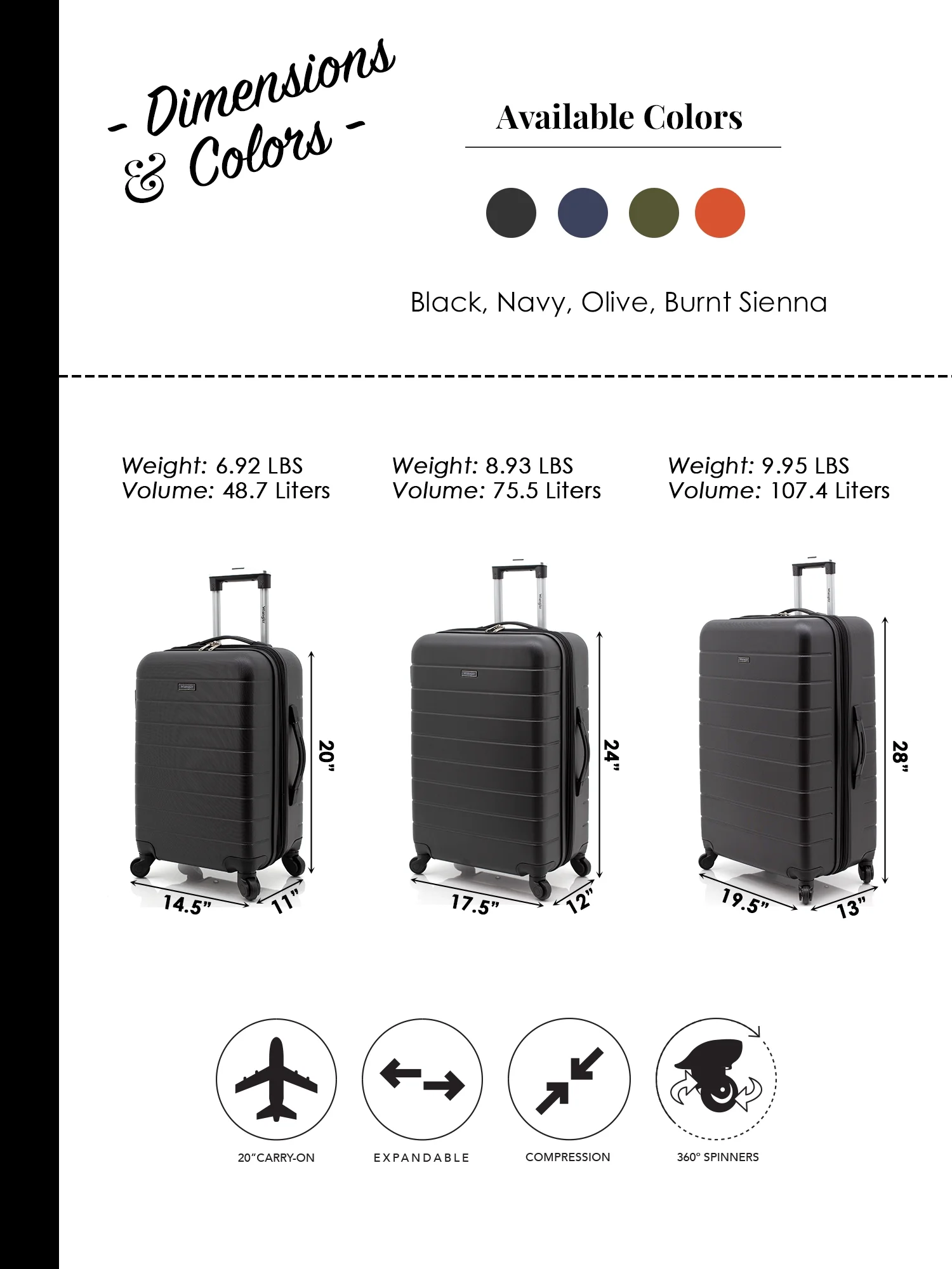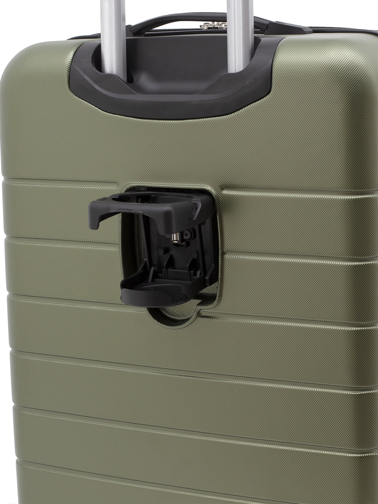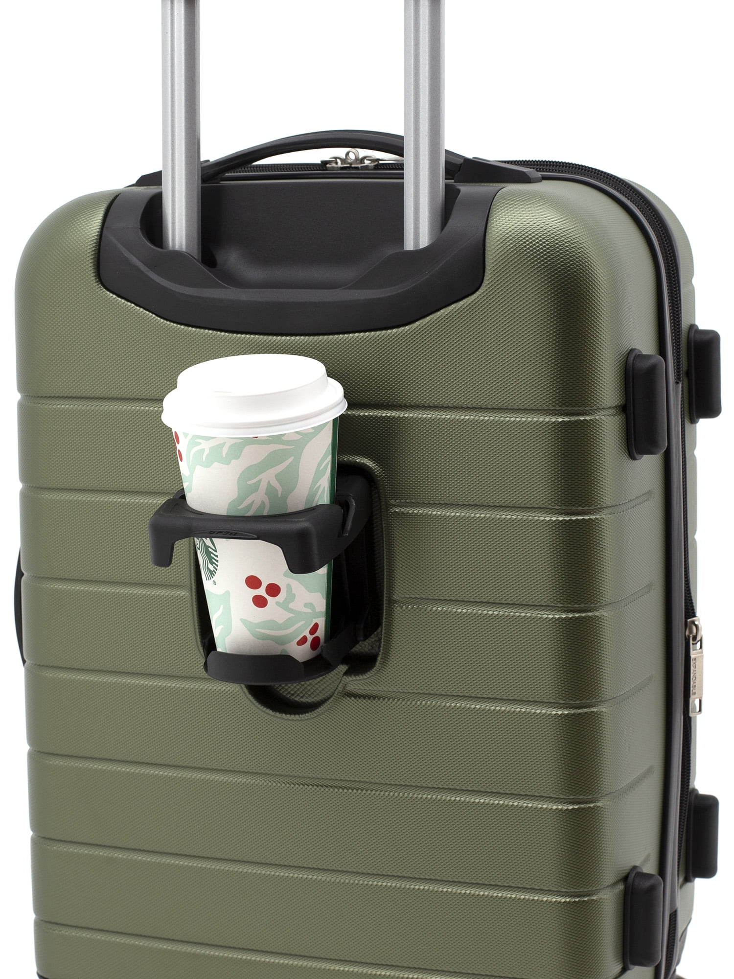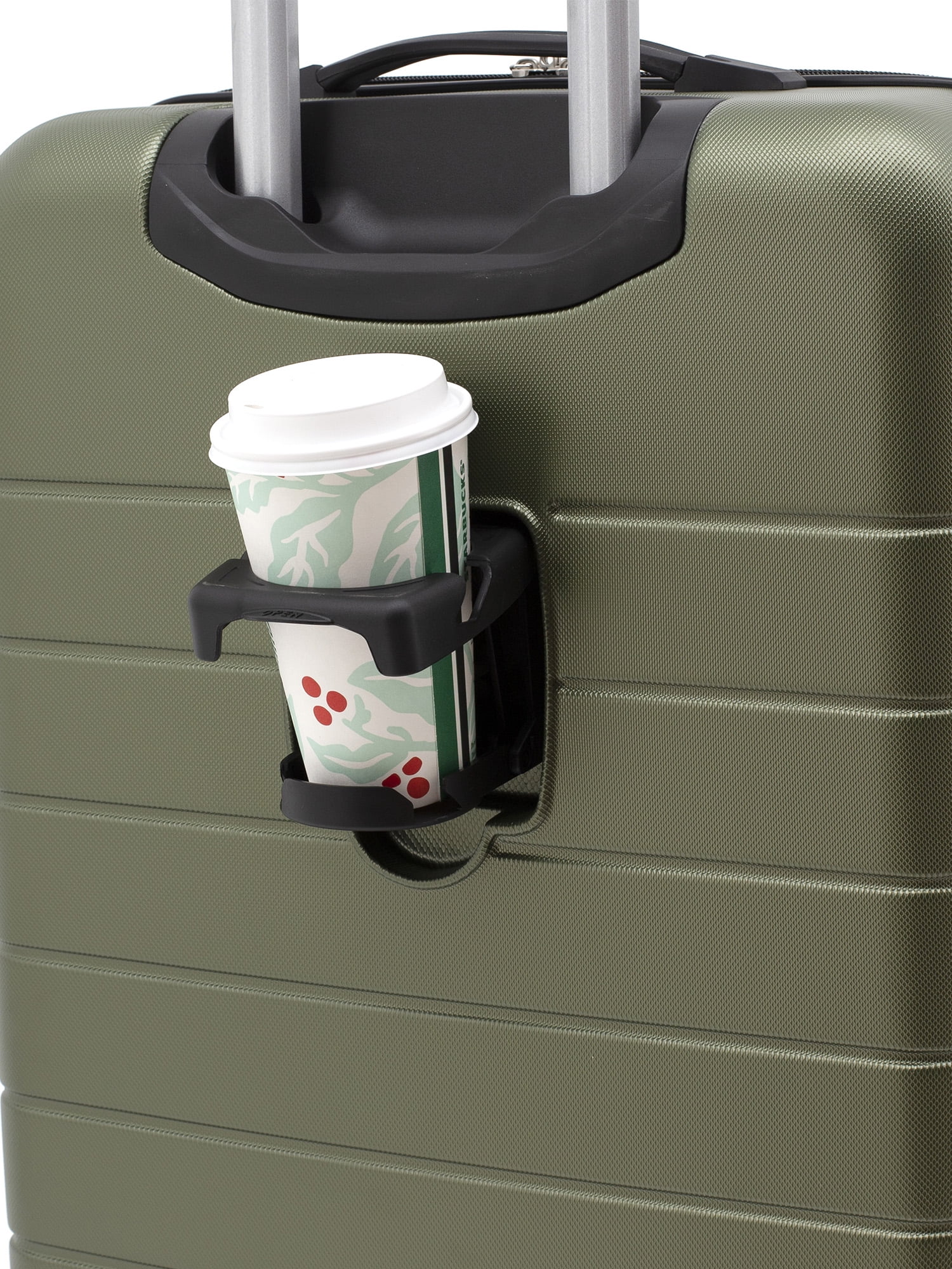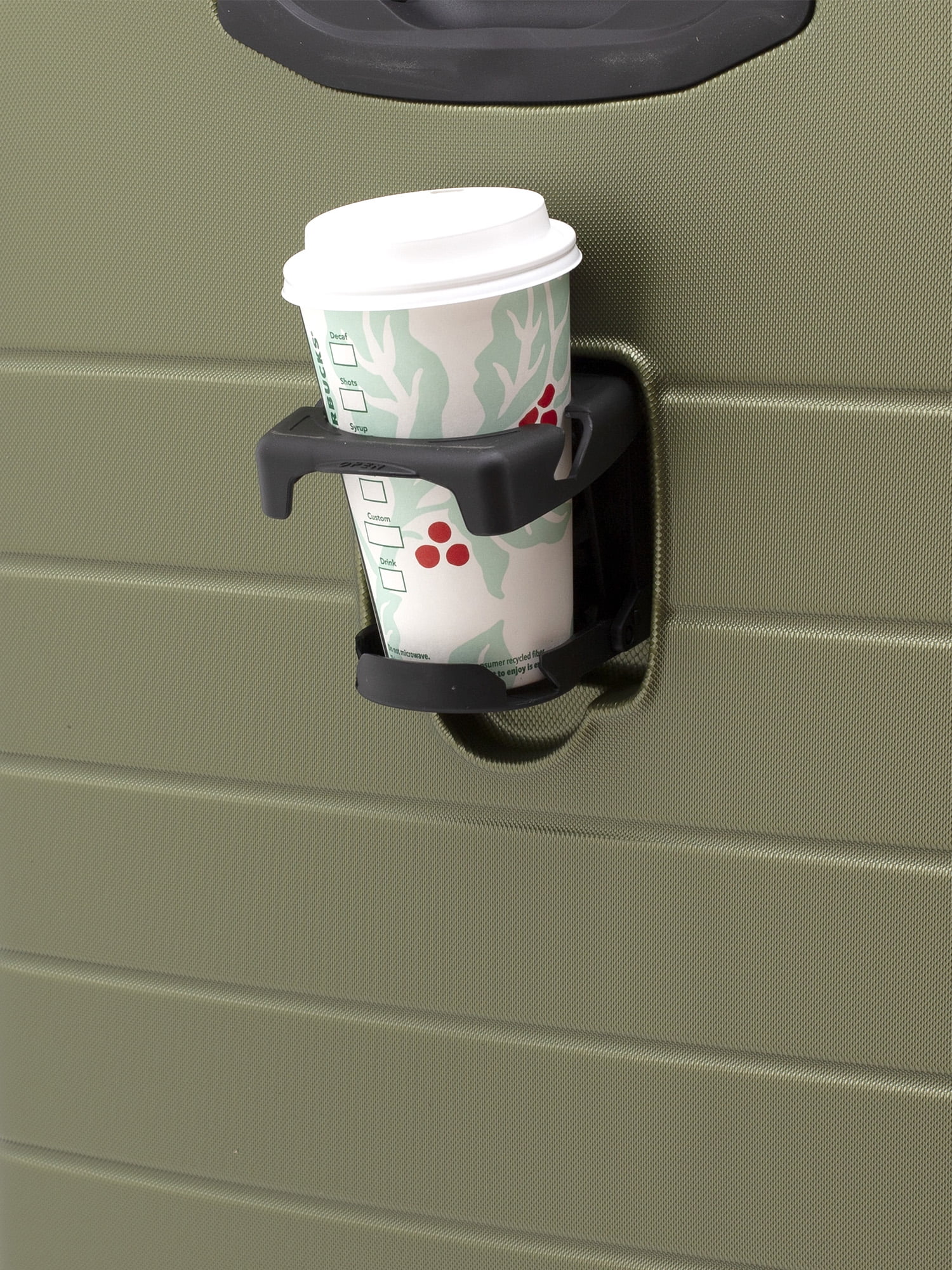 Push-button telescopic handle system Expands for added packing capacity Spinner wheels for 360° mobility Located in the back of luggage allows you to choose from a cup-holder that holds most cup sizes, a USB port to charge your devices or use as a phone holder (accessories not included) Fully-lined interior with zippered accessory pocket and compression straps