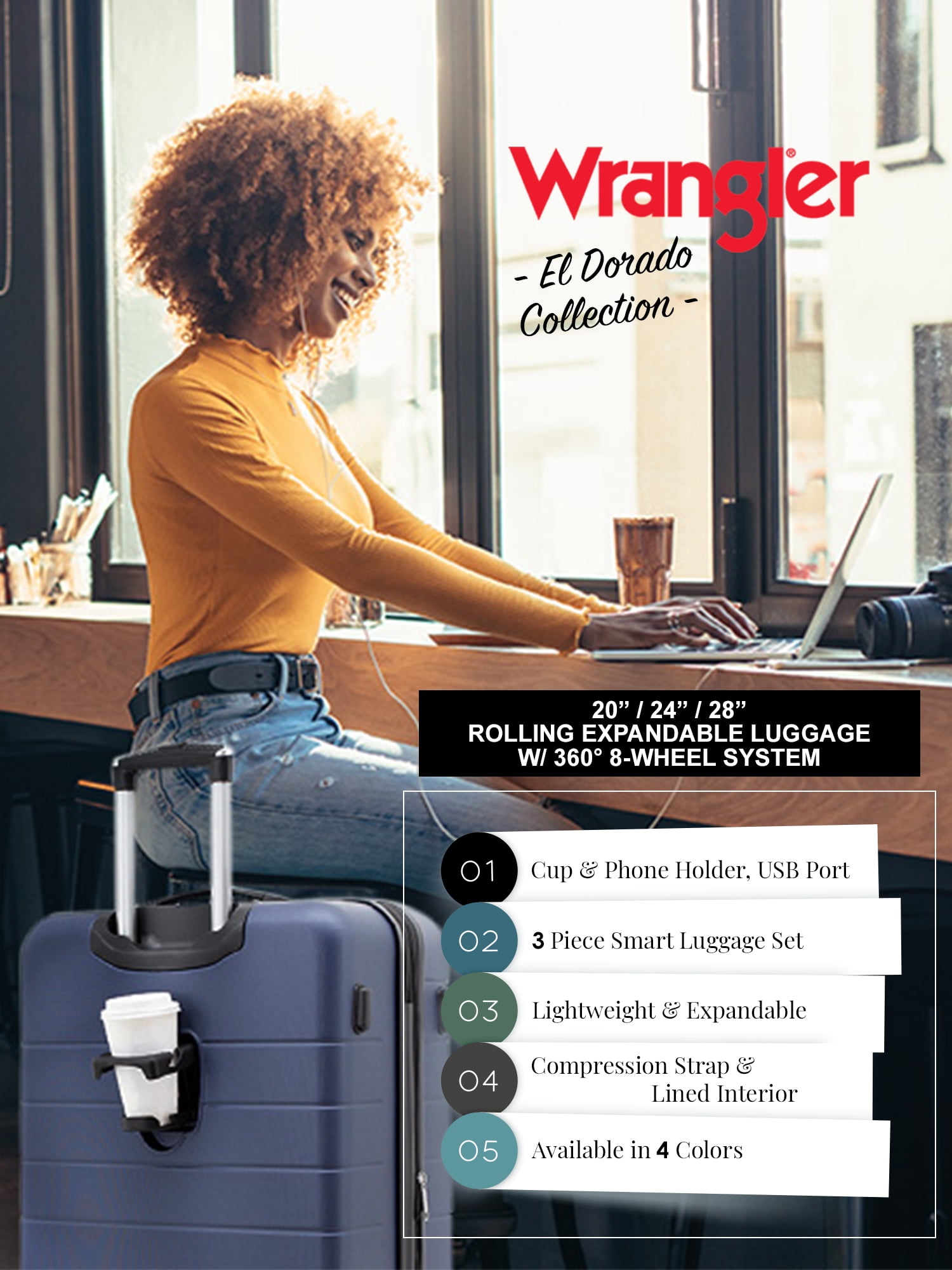 Wrangler 3 Piece Luggage Set with Cup Holder and USB Port, Olive Green
