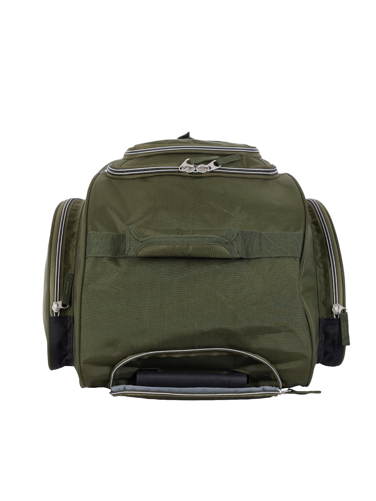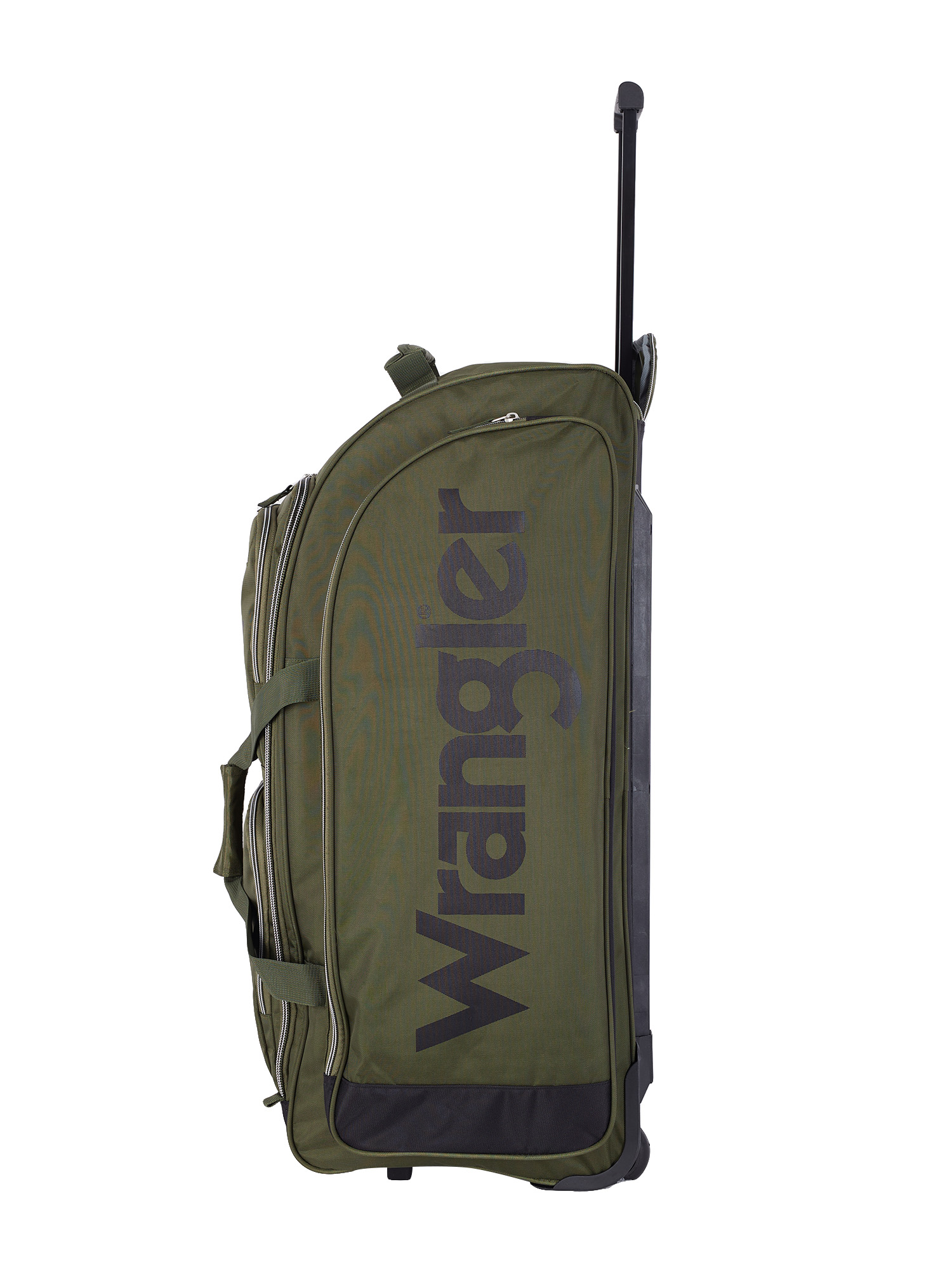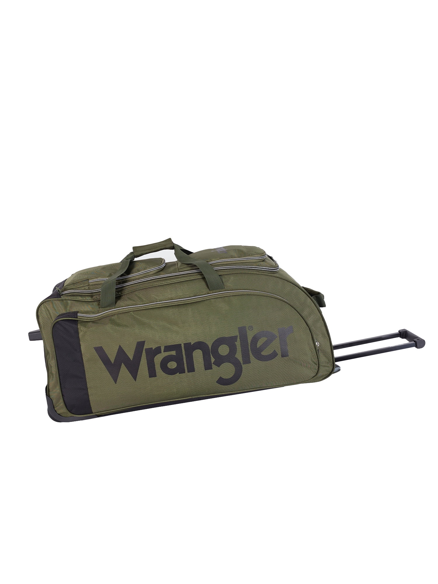 This Wrangler deluxe rolling upright duffel is ideal for all long trips. It features 7 individual packing pockets, easy-glide in-line skate wheels and a telescopic handle. Top handle is perfect when removing from an airport conveyer or use the front web handle with comfort hand grip. Made of high density 900 denier polyester. For added protection, the bottom has set-down bars to keep the material from touching the ground. Easily holds a weeks’ worth of your travel clothes. Ideal for adult travel. Weighs only 7.6 lbs. and meets airline check-in requirements.