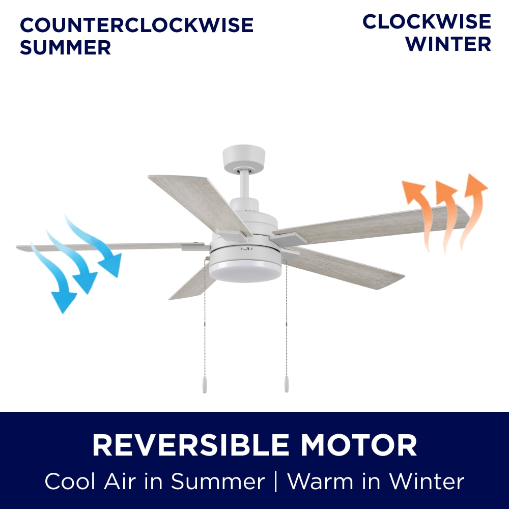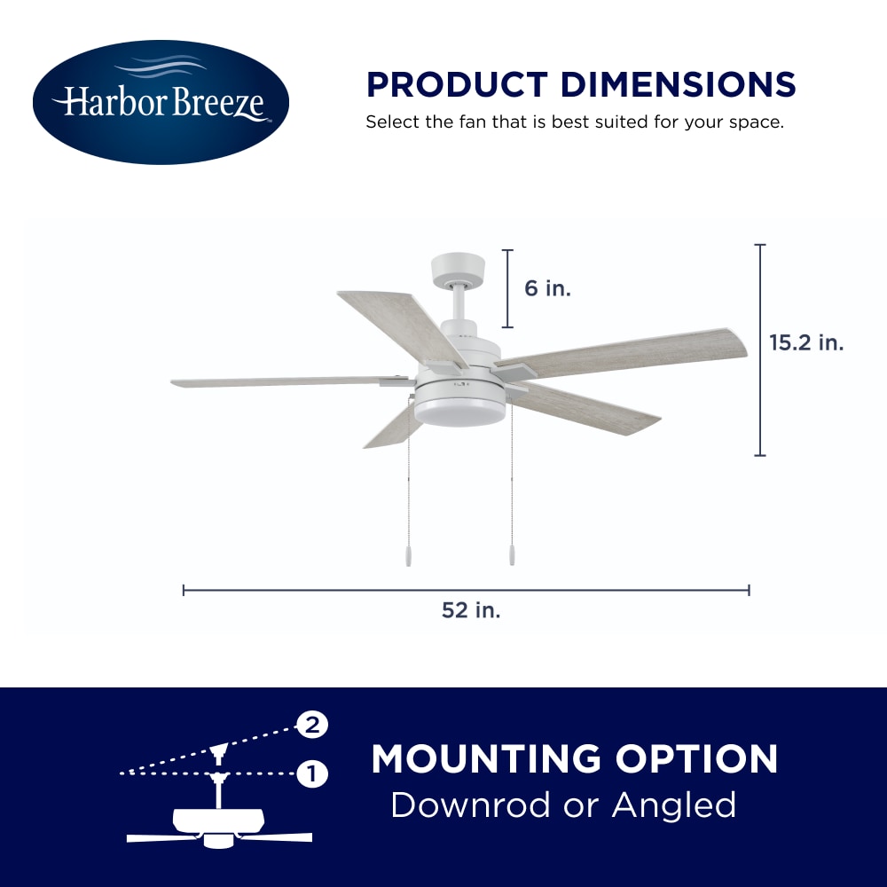 The Harbor Breeze Wrightsville is a 52-inch white pull-chain ceiling fan with integrated LED light. The 5 reversible blades are designed with easy-to-attach blades for Easy2Hang installation. It’s the perfect size for any indoor room up to 400-sqft. With its three-speed reversible motor, it will provide comforting air circulation year-round. Harbor Breeze ceiling fans provide style, function, and illumination to help make your house a home.