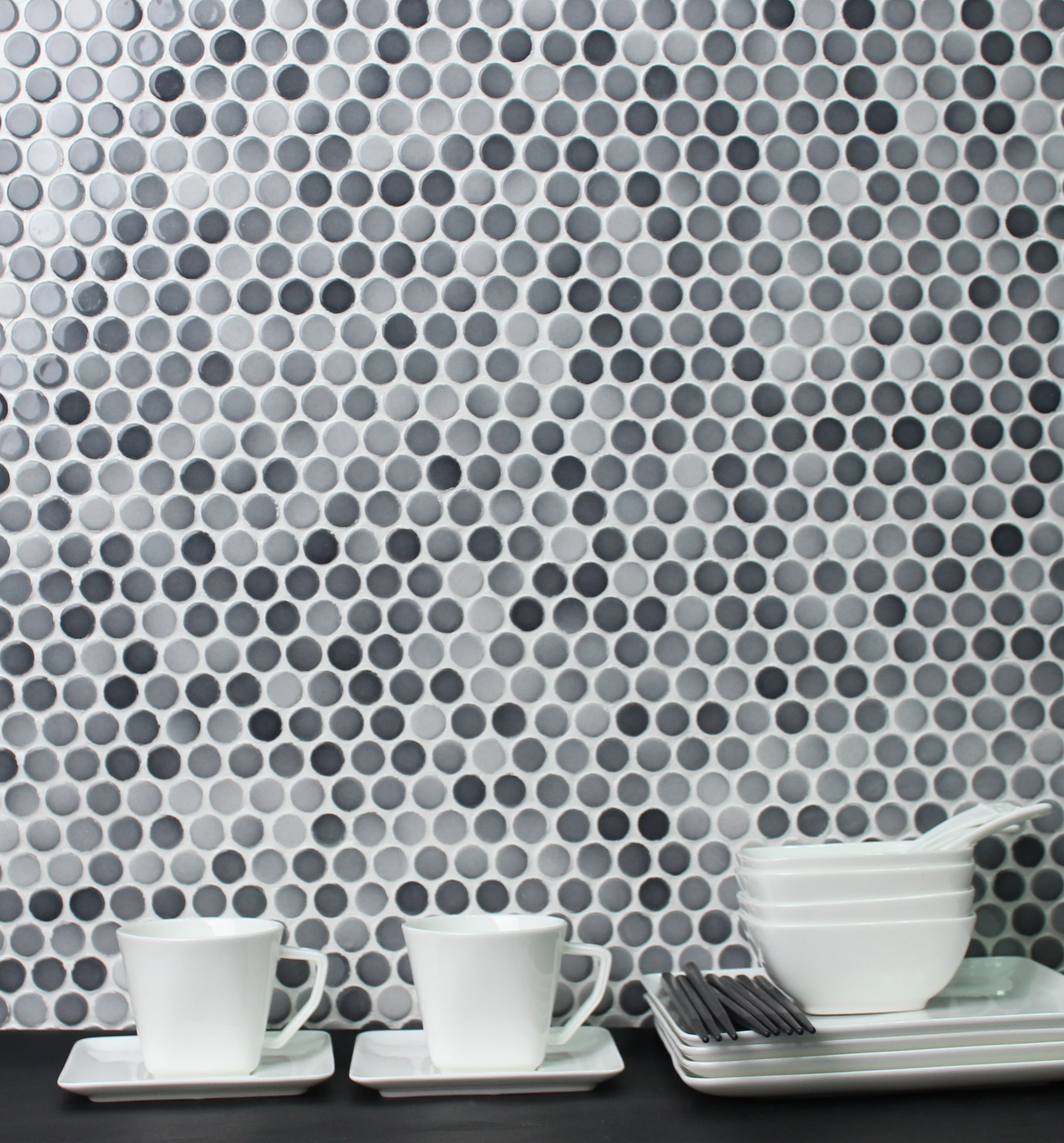 Our glossy porcelain tiles are designed to be used on any walls throughout the home. They are heat and water-resistant and can be installed outside as they are frost proof. They are perfect for residential and commercial use. The tile is glazed, and the color is burned into the surface of the tile so that they won’t fade, age or have significant color variations. The tiles come on a mesh-backed sheet making them easy to install. The glazed finish makes these tiles look beautiful in natural and artificial light, giving your room a stunning appearance no matter the time of day. Sheet Size: 11.4″ x 11.6″ x 6mm thick Color: Shades of Gray Finish: Glazed Porcelain with Glossy Finish Layout: Penny Round