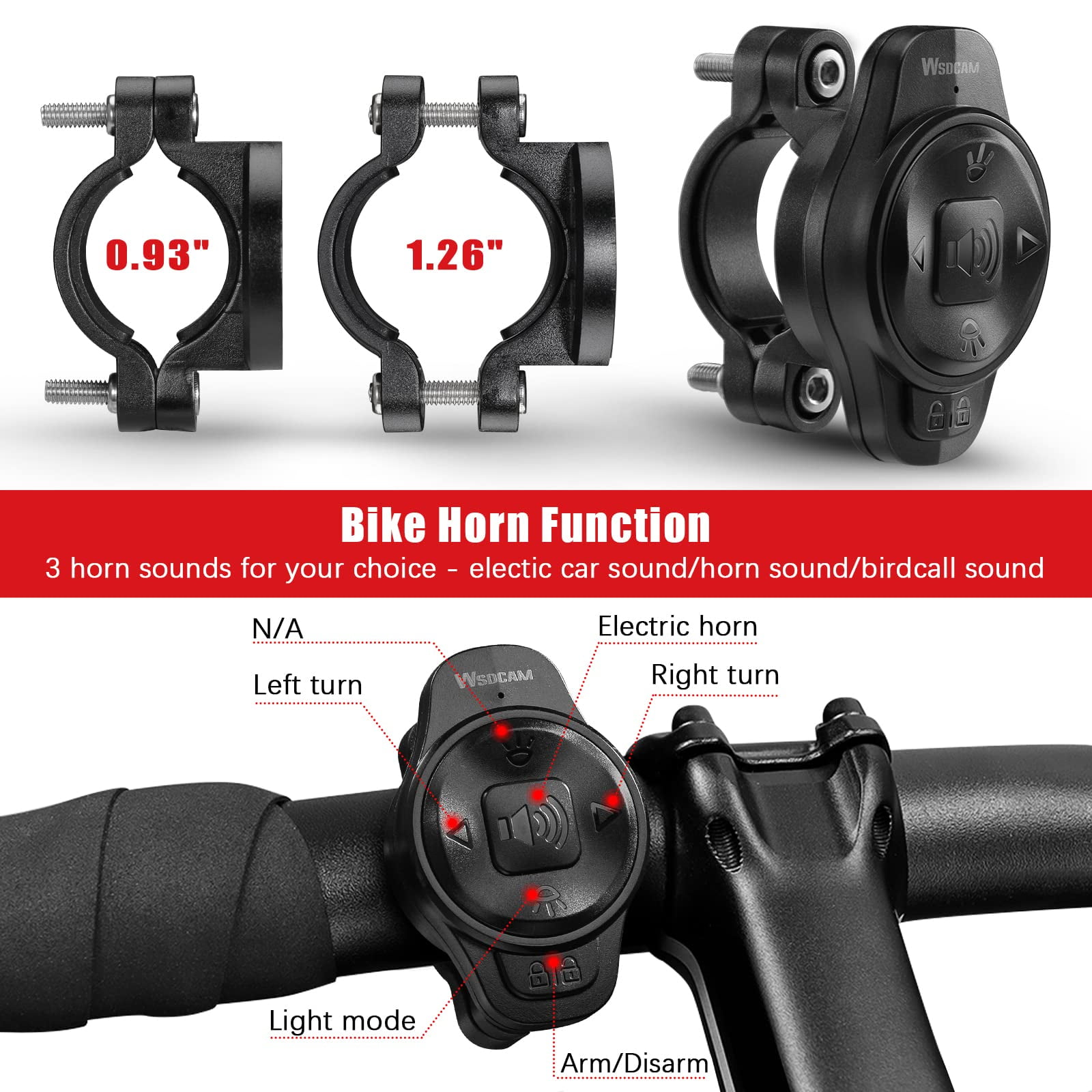 WSDCAM 5-IN-1 Bike Horn Alarm Tail Light with Turn Signals Brake Light with 2 Remotes NOTE: Have to pair the additional remote with the taillight before using.(The pairing method see the user manual) The 5-in-1 tail light alarm horn helps you ride with peace of mind and give you peace of mind when park outside. It makes your bike more like motorcycle and car. 160LM Ultra-bright rear light enhances your visibility for night riding even daytime riding, bicycle turn signals let drivers and pedestrians know exactly the direction you will ride, auto brake light alerts other drivers behind you, 110 dB bike horn to alert pedestrians and drivers you are coming, bike alarm provides additional security and deters thieves effectively when your vehicles park at home or outdoors. A must have for road bikes and mountain bikes! 5-In-1 Function: Ultra-bright Bike Tail Light (with 6 light modes) Bike Turn Signals (with clicking sound) Auto Brake Light Anti-theft Vibration Alarm (with 7 adjustable sensitivity) Loud 110dB Bike Horn (with 3 horn tones) Product Features: 6 Light Modes – Slow FlashingBreathingFast BlinkingSteady LightEmergency LightOFF Smart Auto on/off Light Mode – Slow FlashingBreathing Wireless Remote Control (can add up to 8 remotes) IP54 Waterproof, High & Low Temperature Resistance USB Type-C Rechargeable (with charging level indicator) Long Battery Life (with battery-saving technology) Package Including: 1* Bike taillight alarm (including battery) 2* Remote (including battery) 1* Taillight mounting bracket 2* Remote mounting bracket 2* Remote key chain 1* USB Type-C Cable (NOT included charge adapter) No-slip mats Hex cap screws Hex key User Manual