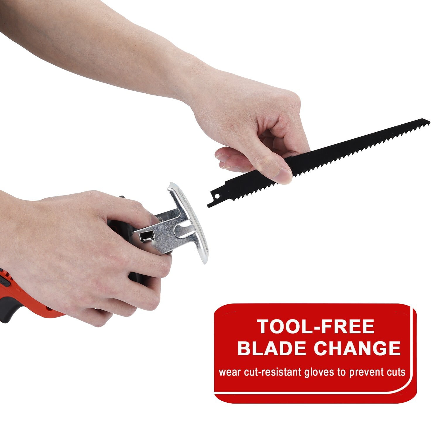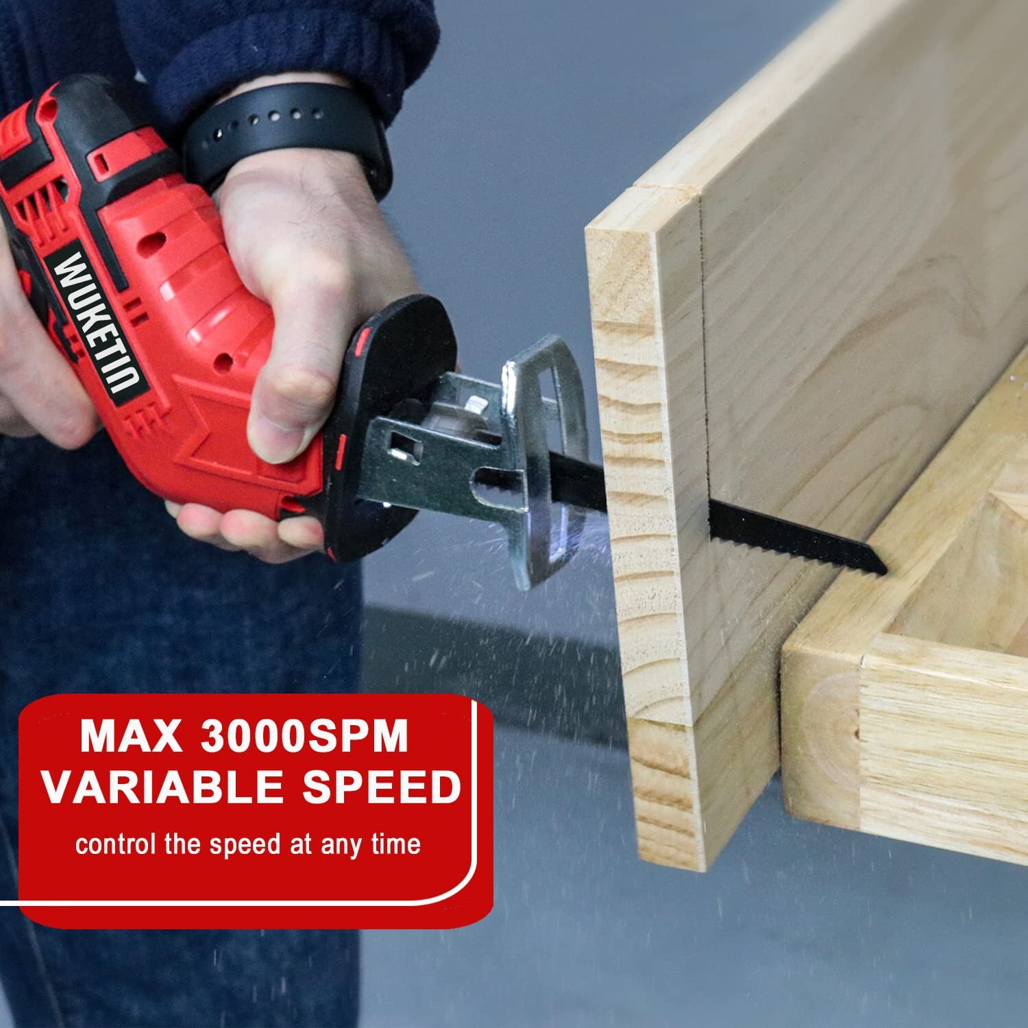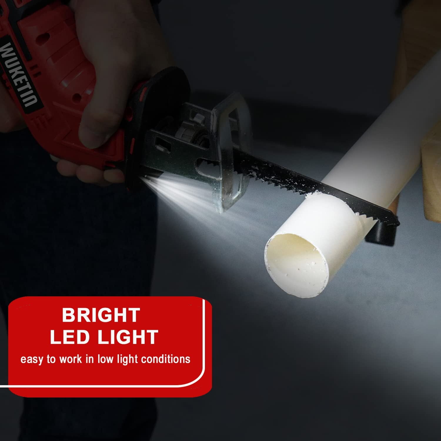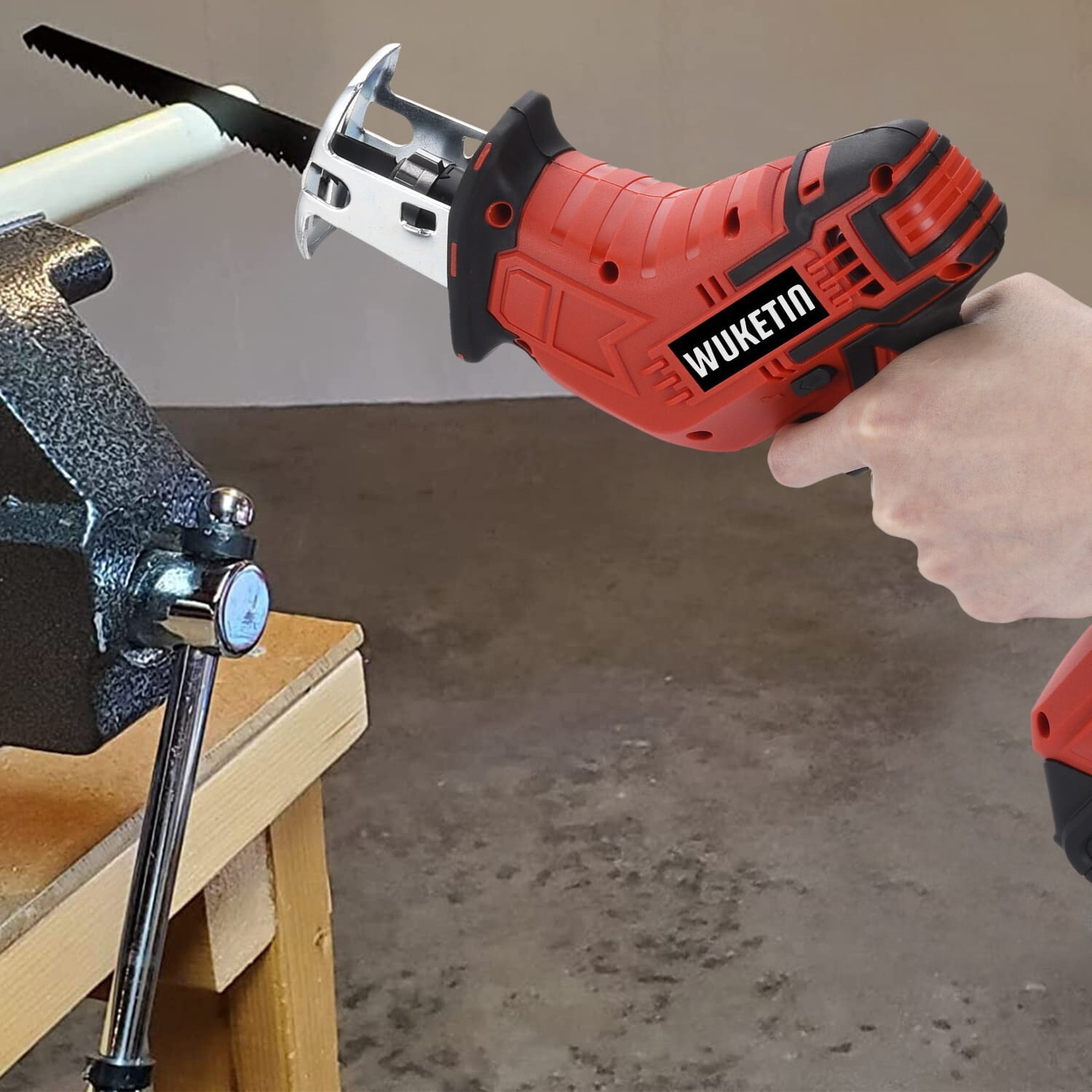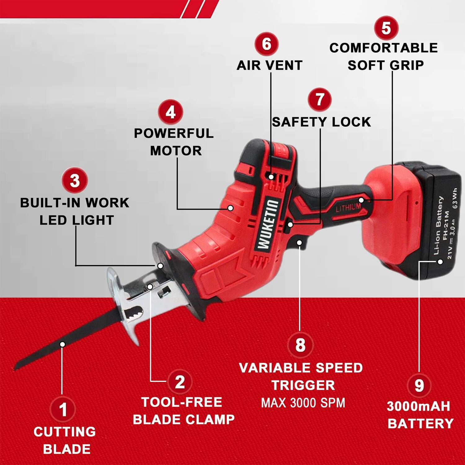 WUKETIN reciprocating saw is a powerful tool with a 21V battery delivering no load speed of 0 – 3000 SPM for cutting through wood, pipe, and metals. It features a variable-speed trigger and lock-off button, ergonomic soft rubber handle for improved control, tool-less blade change mechanism, and a reasonable anti-trigger switch design for safety. Additionally, it has 45min fast charging with 2 large-capacity batteries for increased working time and efficiency. Product Details: Color: Red&Black Blade Material: Metal Surface Recommendation: Plastic+ABS Power Source: Battery Powered Battery: 2.0Ah Voltage: 21 Volts (DC) Amperage: 3 Amps Item Weight: 3.5 Pounds Blade Length: 6 Inches Number of Teeth: 24 Usage: Cutting PVC Pipe, Cutting Metal, Cutting Wood, Cutting Plastic Package List: 1 x 21v Reciprocating Saw 2 x 2.0Ah Battery 1 x Fast Charger 6 x 6 inch Cutting Blades 1 x Tool Box 1 x Glasses 1 x Gloves 1 x User Manual