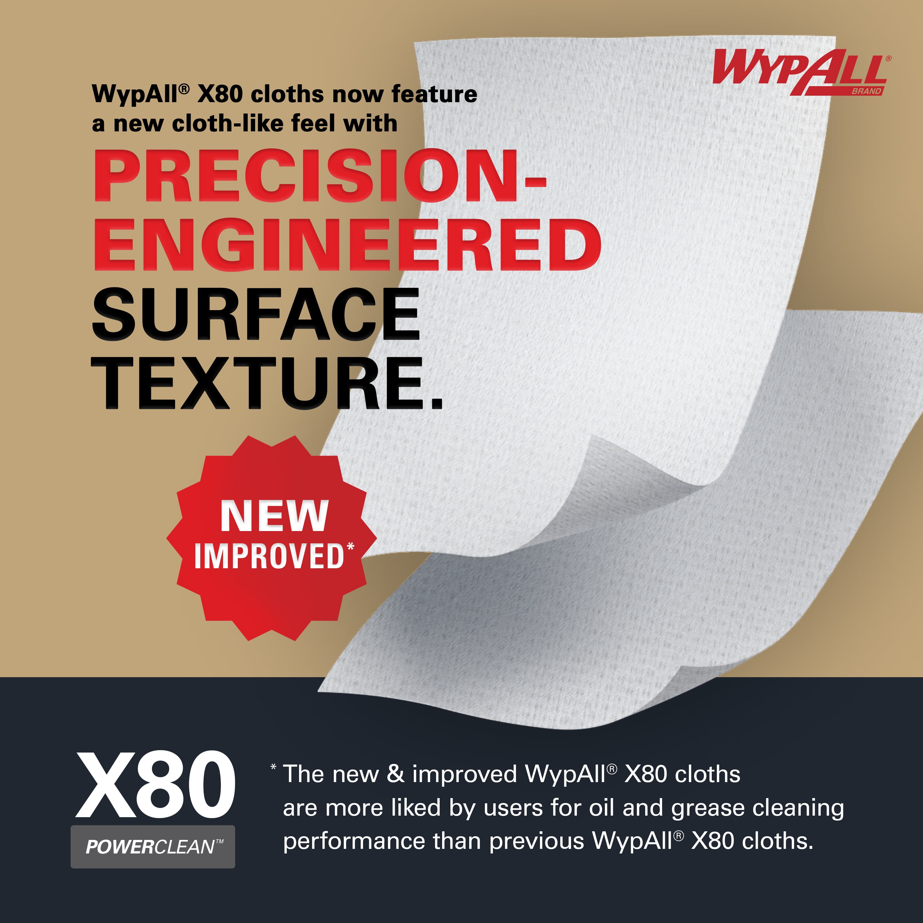 WypAll® is the number one brand of disposable wipes in the US and Canada. Maximize performance while minimizing time, effort and product waste. WypAll® PowerClean™ X80 Heavy Duty Cloths feature innovations like high-tech Hydroknit® fast-absorbing material and are durable for scrubbing. These contaminant-free commercial cloths are a favorite replacement for industrial cloth towels, which can harbor dangerous chemicals, such as lead (In a 2003 Gradient study, 100% of the sampled laundered shop towels tested, lead was detected at levels that may exceed health based exposure guidelines.). WypAll® PowerClean™ X80 Heavy Duty Cloths are made of soft pulp fibers, bonded to a polypropylene base sheet for absorbency and durability, making them suitable for removing dirt, oil, grime and solvents in industrial and manufacturing businesses. The reusable cloths are reinforced for strength when wet and dry. These bulk cloths are a great alternative – safer and more efficient – to replace laundered rental shop towels or and cleaning towels. Use them for heavy duty machine- and part-wiping, wiping metal shavings, prepping surfaces with solvents and cleaning rough surfaces. After all, every business gets dirty. But for the toughest grease and grime, you can trust WypAll® PowerClean™ X80 Heavy Duty Cloths.