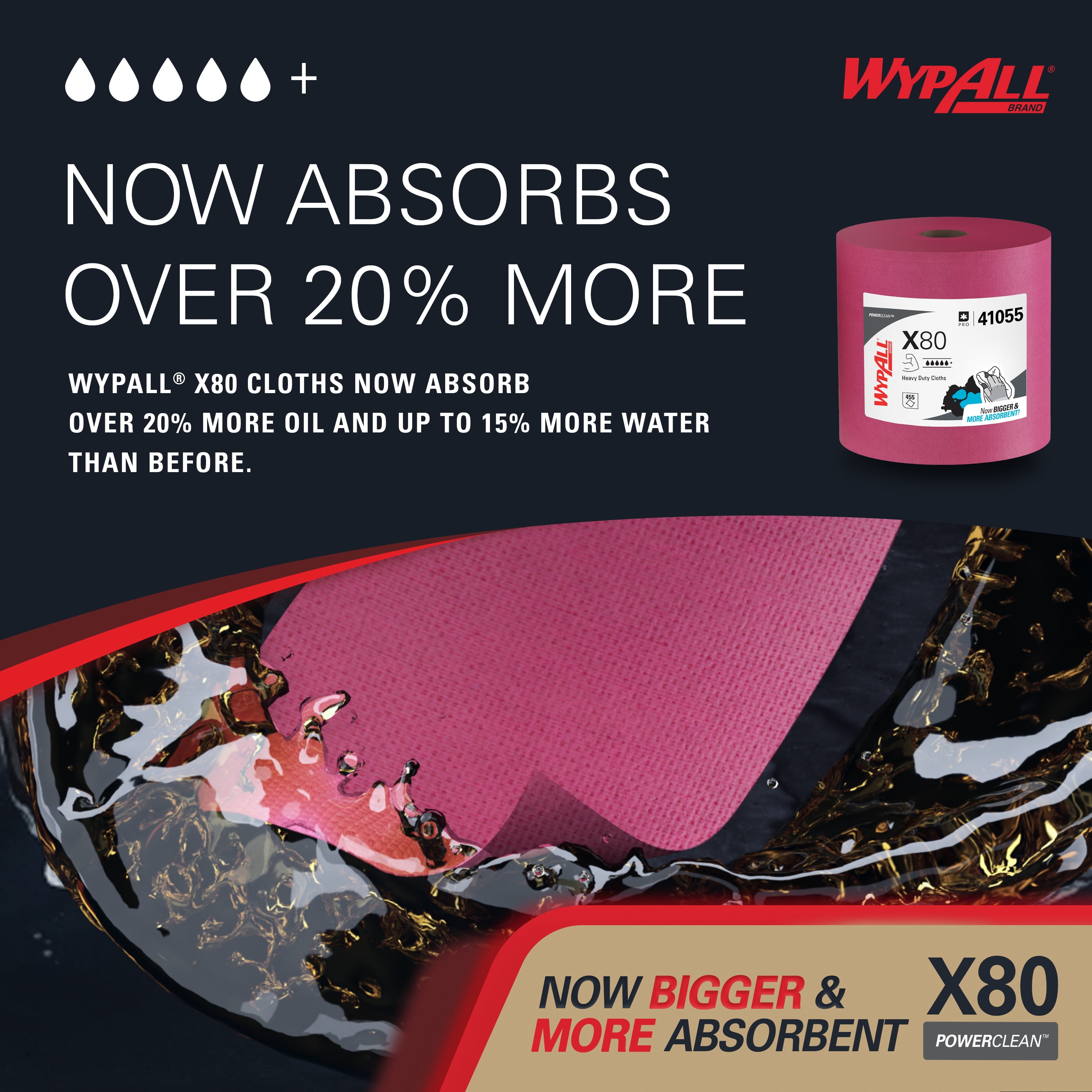 455 Sheets/Roll; 1 Roll of WypAll® PowerClean™ X80 Heavy Duty Cloths/Case; 455 Sheets/Case; Red; Jumbo Roll; Extended Use Towels These durable wipes absorb more water and oil then textile shop rags and stay strong. 3x less lint vs. rental shop towels. Great for cleaning abrasive surfaces, machine and tool part wiping and absorbing industrial size spills. These wipes provide a fresh, clean and consistent sheet every time.