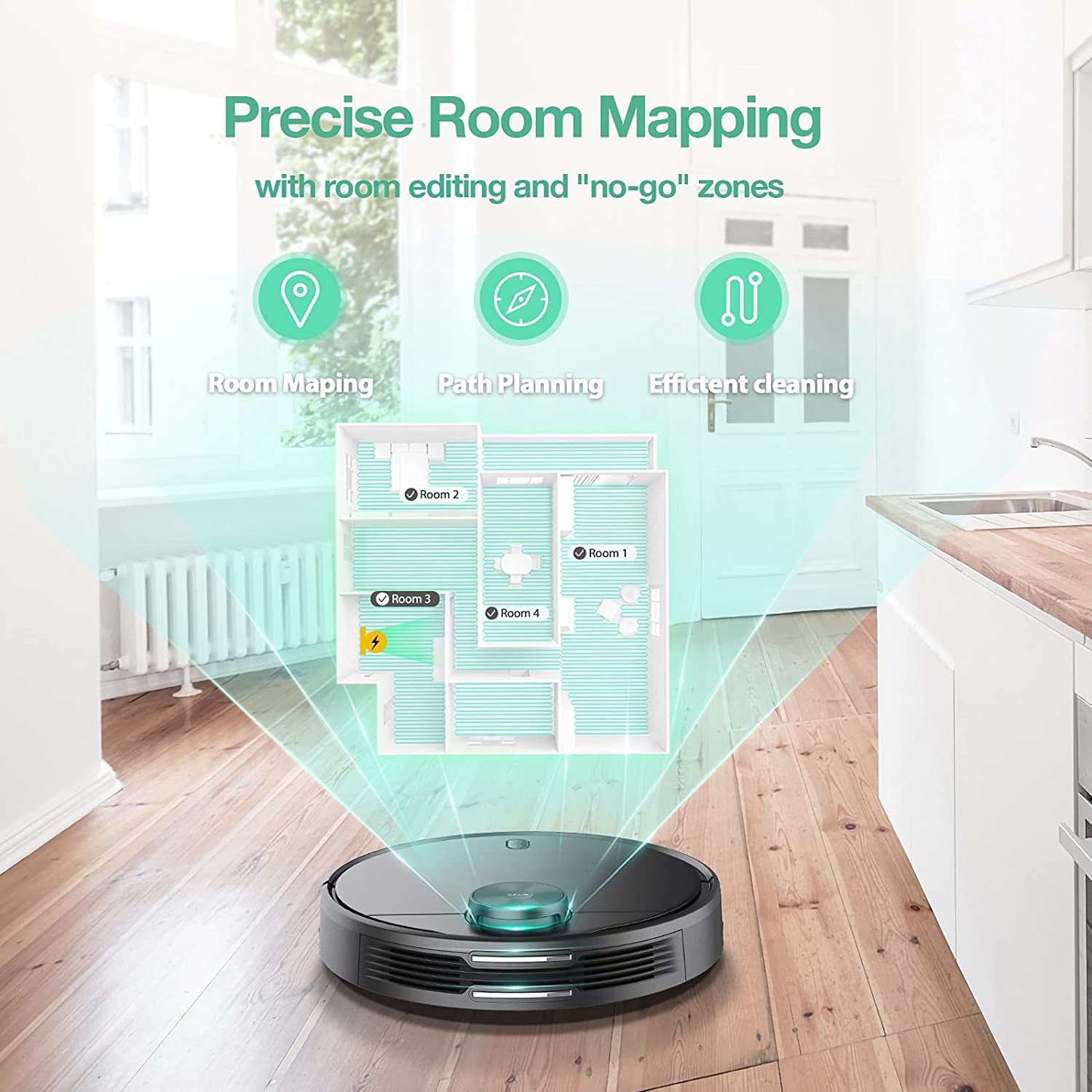 Room mapping: A LiDAR sensor on top of the vacuum scans your rooms in seconds and builds a floor plan on your phone that you can see, edit, and save Quick & efficient cleaning: Using the map built by the LIDAR sensor, Wyze Robot Vacuum divides rooms into sections and moves around in straight lines for the most efficient path possible Multi-surface vacuuming: Wyze Robot Vacuum cleans all surfaces?hard flooring and soft carpet. It can cross height gaps up to 0.8 in (20 mm) to clean across any bumps in the road Virtual Walls & Area Selection: Create virtual walls and restricted areas. Have cords under your desk? Dog bowls in the corner? No problem. Tell your Wyze Robot Vacuum where it can?t go Self-charging: Wyze Robot Vacuum drives itself back to the charging station after it?s finished its path. Or if the battery gets low during cleaning, it returns for a charge before picking back up right where it left off