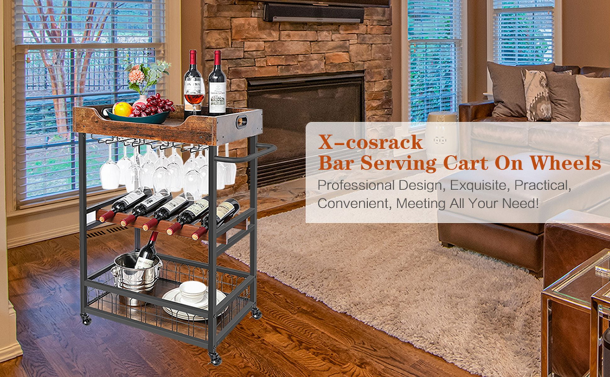 【Top Quality Home Bar Furniture】X-cosrack Bar Serving Cart adopts high-quality eco-friendly MDF and strong metal frame. The surface of the MDF is perfectly matched with the vintage industrial style high-grade wood-grain stickers. 【Elaborate Design Coffee Cart Beverage Cart】There is a removable wood tray on the top of our kitchen serving cart, which can be used to place bartender kit, fruits, appetizers, desserts, etc. 【Rolling Bar Cart】Our bar cart has four 360° rotating casters, two of which are equipped with brakes to prevent sliding when stopped. The smooth casters allow you to easily move serving cart in the kitchen, dining room or any other place. Our exquisite retro industrial style kitchen serving cart is fully functional, which is definitely the best supplement for entertaining friends and family. Crafted from the finest wood and craftsmanship, the wine cart is durable and timeless food cart. Removable Tray Bar Cart: The top shelf is removable to be used as a food tray. Making it easy to serve your lover everywhere. 3 Tier Ample Storage Space Bar Stand: Featured wine rack and hanging glass storage. Enable to hold 5 wine bottles and 16 wine glasses. Three open shelves with Removable Top Shelf for serving wine, beer, soda, bottled water, meats, cheese, fruits,etc. Solid and Durable Bar Carts for The Home: The mix of robust steel and particleboard panels ensures the sturdiness of this rolling bar cart, making it not only strong to hold up to 132 lb in total but also durable for years of enjoyment. Versatile Bar Cart: This serving bar cart can be used in different occasions,such as kitchen, dining room, or living room, it can be used as wine cart, beverage drink cart, kitchen cart, or coffee cart.