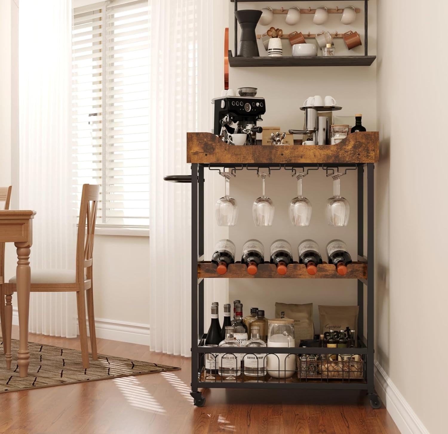 x-Cosrack 3 Tier Home Bar Cart with Wine Rack and Glasses Holder, Mobile Kitchen Storage on Wheels, Brown