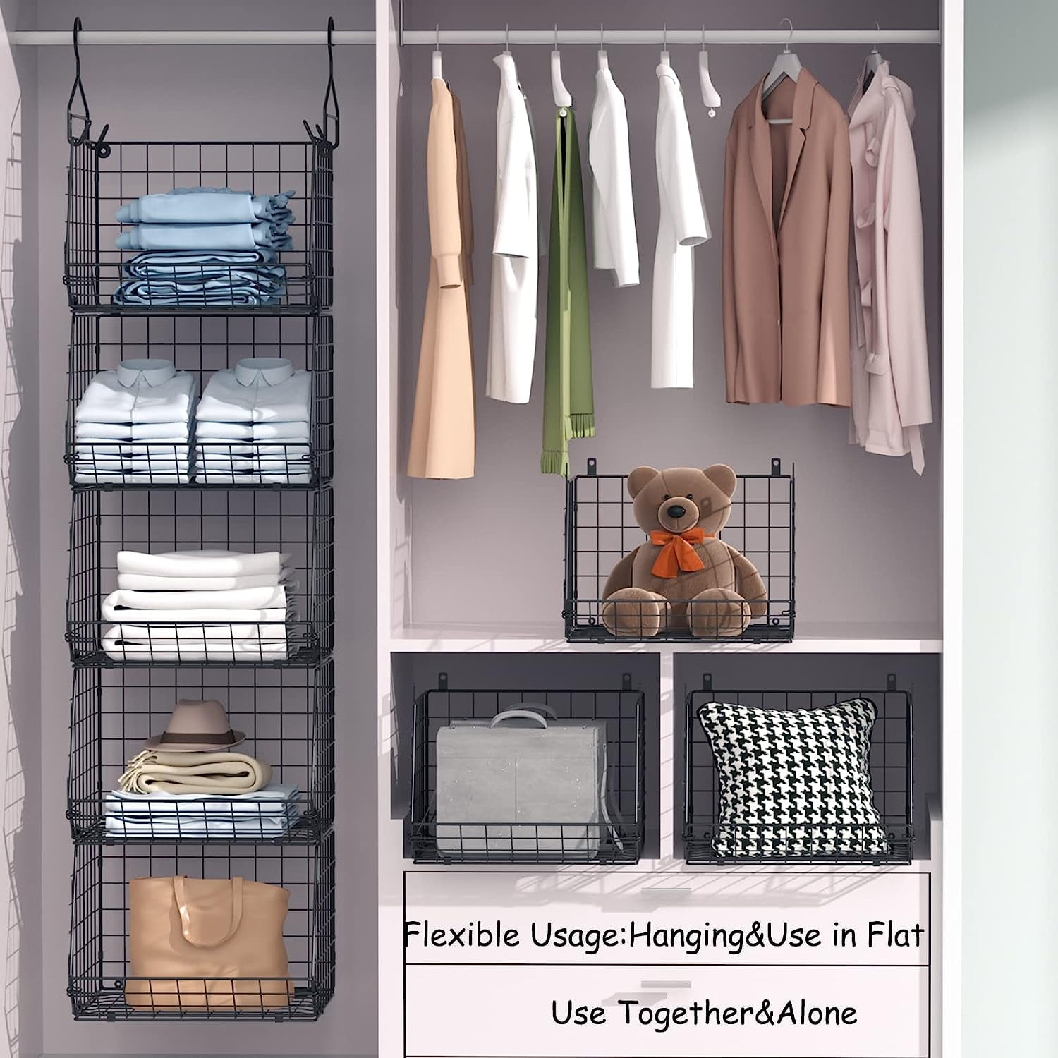Suitable for bedroom, closets, laundry room, play room, college dormitory with rods. Wardrobe Hanging Organizer: Come with 5 wide open baskets, maximize your closet space and a large capacity for storage clothes, socks, pants, dolls, and etc. Come with 2 sturdy hanging hooks, make it easy to hang on your closet rod. Featuring dense wire grid, make this metal wire basket more stable and long time using. Wall Mounted Design 5 in 1 or Use Alone: X-cosrack closet hanging organizer is the layered design, used alone or stacked according to your own need and idea. And you can screw all the five baskets together and hang them as a unit on the closet rod to store clothes, hats, sweaters, jeans, shirts, shoes, purses and other accessories. Also, you can hang 3 baskets on the wall, and place 2 on the shelf. You can DIY the using methods. Foldable Hanging Shelves with 5 S Hooks: Foldable design, when not use it, just fold down for sleek storage on a shelf or desk. Come with 5 S hooks, you can use hooks to hang key chains, wallets etc. according to your needs. Dimension&Care: Each set contains 5 metal wire baskets, 4 large hanging sturdy hooks, 5 small S hooks and installation hardware. To clean, wipe with a damp cloth and towel dry. Patent Number: US D948,899S Wall-mounted&Cabinet&Hanging Storage: Come with 4 sturdy large hanging hooks, you can use them to hang the basket on the closet rod or garment rod. Optional wall mounted design, easily mount to the wall with included hardware. Moreover, you can use it in flat on a surface, to store items anywhere like dorms, bathrooms, bedrooms, closets, under the bed, in the garage or in the pantry. Space Save: The hanging closet organizer allows for easy hanging with cubby spaces as well as side pockets for smaller items that are often hard to find. It makes organizing so easy but does not take up much space at the same time.