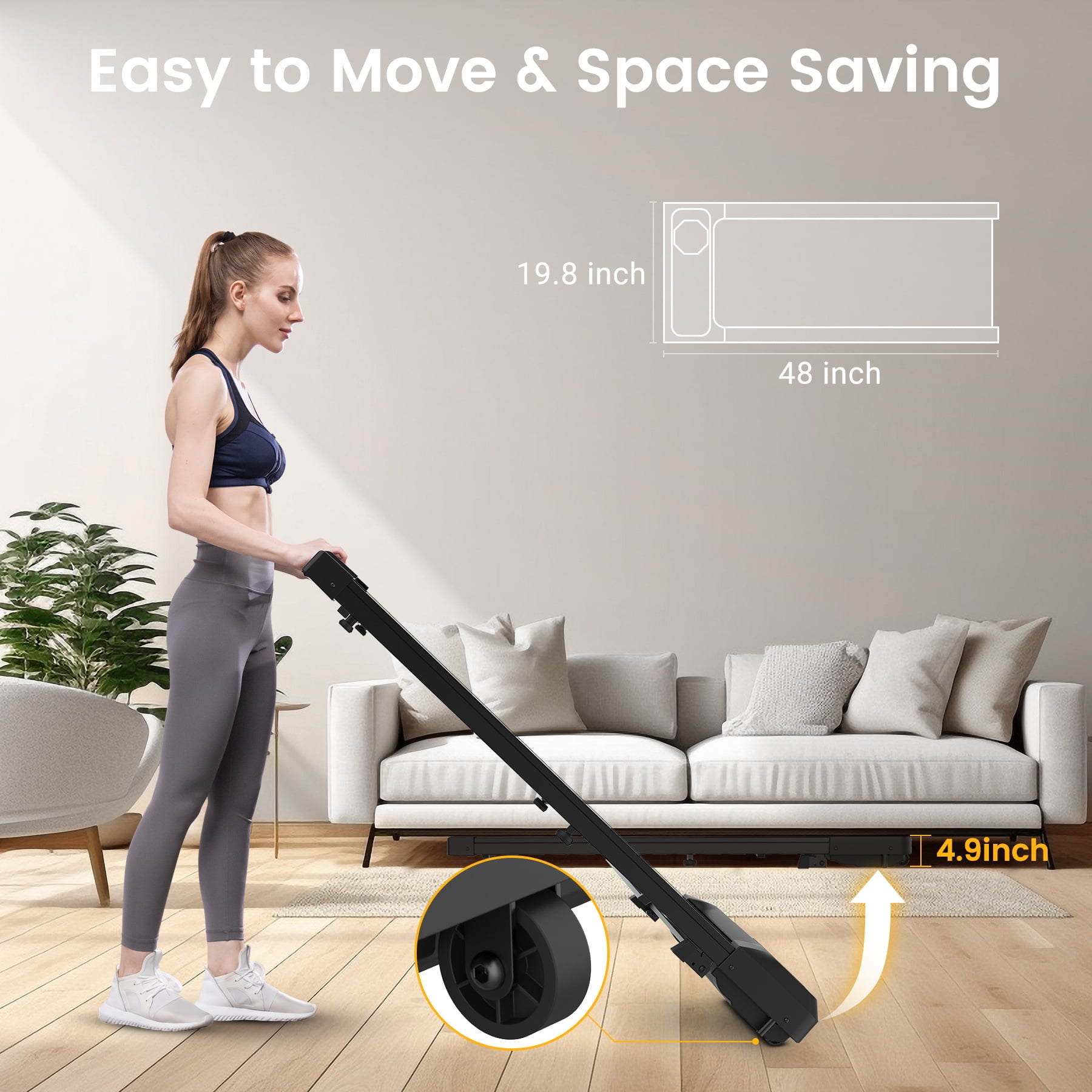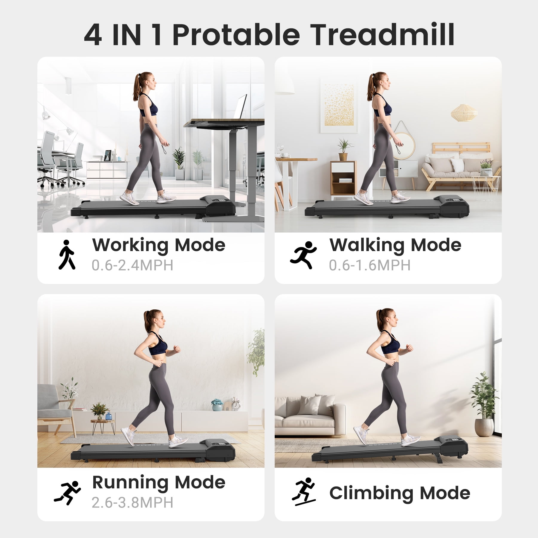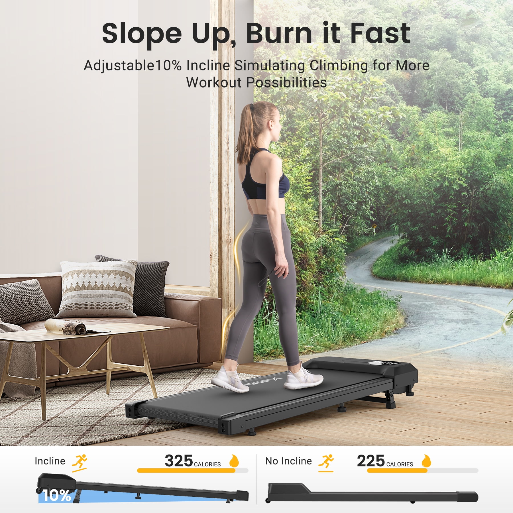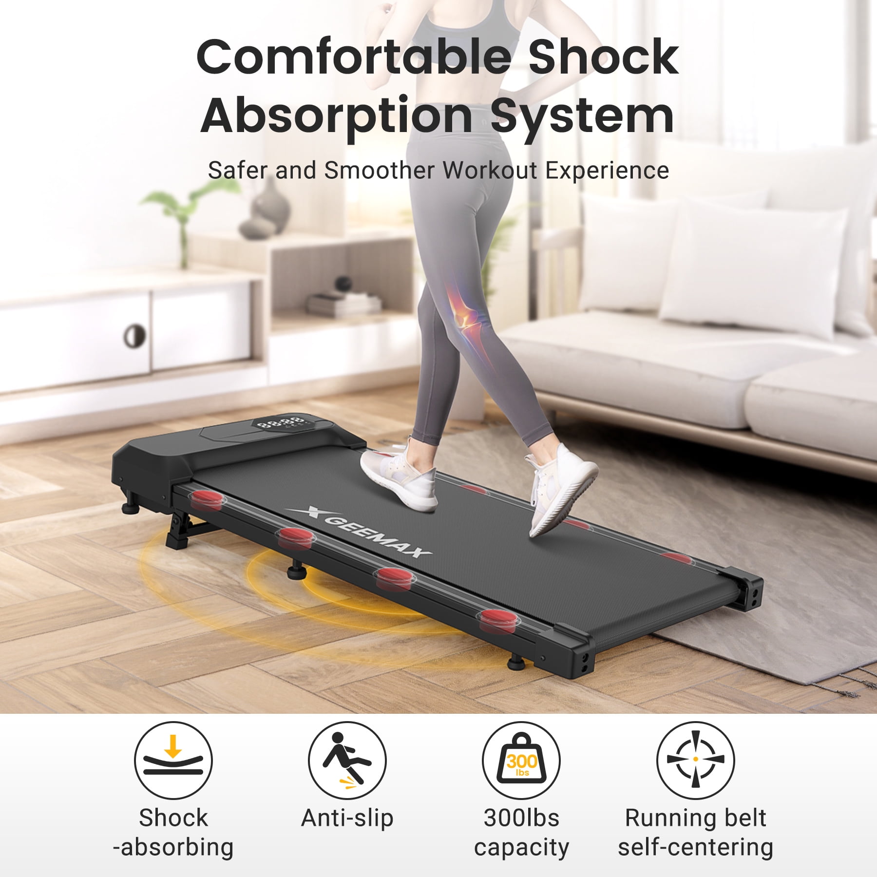 Key Features: 【Walking Pad with Incline Burns More Calories】 Easily activate the incline manually in just 2 seconds. Its 10% incline is designed to simulate hill-like exercise experience, which effectively improves the calories burning efficiency. Make it a short workout during busy work or family breaks, also effective in shaping your glutes and legs. 【Powerful But Quiet Motor】 X GEEMAX walking treadmill adopt avanced 2.5HP ultra silent motor can reach 0.6-3.8 mph. Proven through hundreds of thousands of tests, our motors have lower temperatures and longer life than others, and the noise of this walking pad treadmill with incline is less than 40 dB, ensuring it won’t disturb your family or neighbors’ rest. 【Dual Shock Absorption & Automatic Reset Running Belt】 The walking pad treadmill under desks includs 8 silicone shock absorbers and a 5-layer running belt, offering superior knee protection and enhancing overall comfort during your workout. The upgraded mechanics are designed to automatically center the running belt once it’s deflected and load up to 300 lbs weight to ensuring that the walking pad treadmill 300 lb capacity can withstand strict exercise plans and enduring. 【Multi-Functional incline walking pad treadmill with App Connection】 You can track exercise speed, time, distance and calories burned in real time with the large LED display, and it is very convenient to adjust the speed between 0.6-3.8 mph or stop at any time with the sensitive remote control. The desk treadmill is also compatible with ZWIFT and KINOMAP fitness App, reject boring fitness plan and make fat burning fun! 【No Need to Install & Space-Saving】 This portable treadmill with incline arrives fully assembled and can be used right out of the box. It’s compact and lightweight and only 4.9 inches thick, minimizing space occupation. Equipped with built-in transport wheels, it can be easily moved and stored. Its sleek design fits easily under a desk, allowing you to work and exercise at the same time. Features: Adjustable 10% Incline Simulating Climbing Burns More Calories Easily adjust the incline in just 2 seconds. You can choose incline or non-incline mode according to your exercise habits 2.5HP Quiet Motor with Cool-Down Funtion, more enduring, noise<40 dB Double shock-absorbing design, 8 shock-absorbing pads, cushioning effect on knees 5-layer anti-skid and wear-resistant running belt, spacious and load-bearing, strong and anti-skid The upgraded automatic reset running belt, designed to automatically center the running belt once it’s deflected Connect the smart fitness APP ZWIFT or KINOMAP to view and record fitness data anytime. Adjust speed anytime from 0.6-3.8 mph via remote control Extra large and clear LED for real time data display No need to install, compact design, space-saving. Easy to move with built-in transport wheels. Specifications: Horsepower: 2.5HP Speed: 0.6-3.8 MPH Using noise<40DB Max Weight Capacity: 300 lbs Item Weight: 46LBS Product Dimensions: 48” x 19.8” x 4.9” (L x W x H) Item Package Dimensions: 51.2” x 22.8” x6” (L x W x H) Operating Voltage: 110V-60HZ 4 Main Modes: Walking/Working/Running/Climbing Package Including: Walking Pad Incline x1 Remote control x1 Tool wrench x1 Silicone oil x1 Power cable x1 User Manual x1