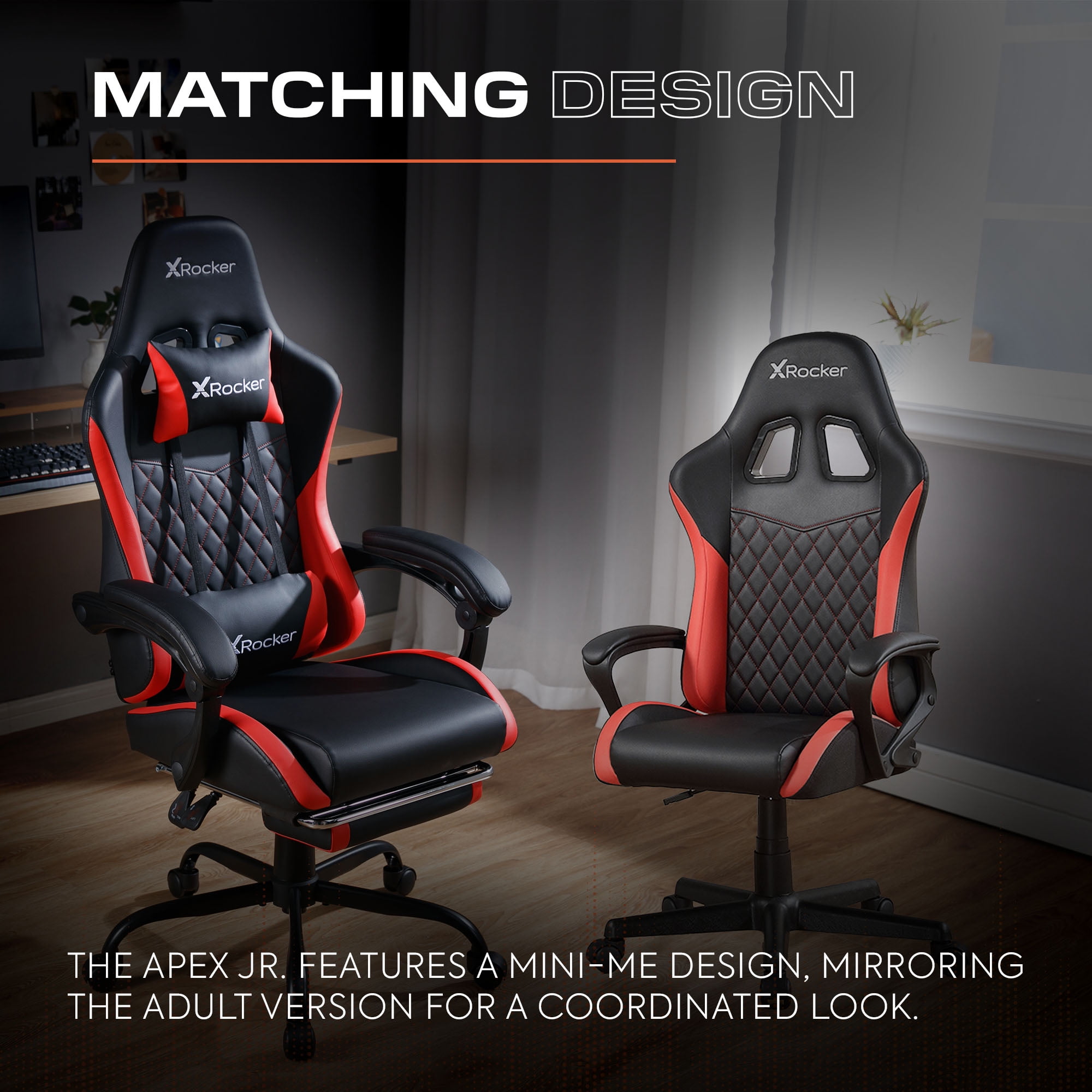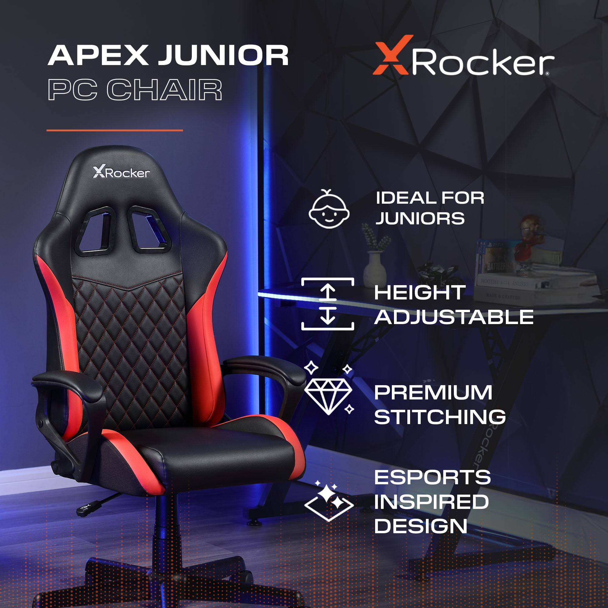Ideal Gaming Chair for Kids: Introducing the X Rocker Apex Jr. PC Gaming Chair, specially designed for young gamers. This chair offers the perfect blend of comfort and style, making it an ideal addition to any gaming setup. Premium PU Leather Upholstery: Crafted from high-quality PU leather, this gaming chair is not only durable but also easy to clean. Its sleek, modern appearance enhances your gaming room while providing long-lasting use. Family Fun Matching Design: The Apex Jr. features a mini-me design, mirroring the adult version for a coordinated look. Now, the whole family can enjoy shared gaming experiences in style. Check it out! Comfortable and Stylish: With its ergonomic support and trendy design, the X Rocker Apex Jr. ensures kids can game for hours in comfort. This chair is a must-have piece of gaming furniture that keeps young gamers engaged and stylish. Dimensions: 22.44 x 20.87 x 38.58 inches, making it the perfect fit for any gaming setup. Transform your child’s gaming experience with the X Rocker Apex Jr. PC Gaming Chair—where comfort meets style in the world of gaming chairs. Complete the set up!
