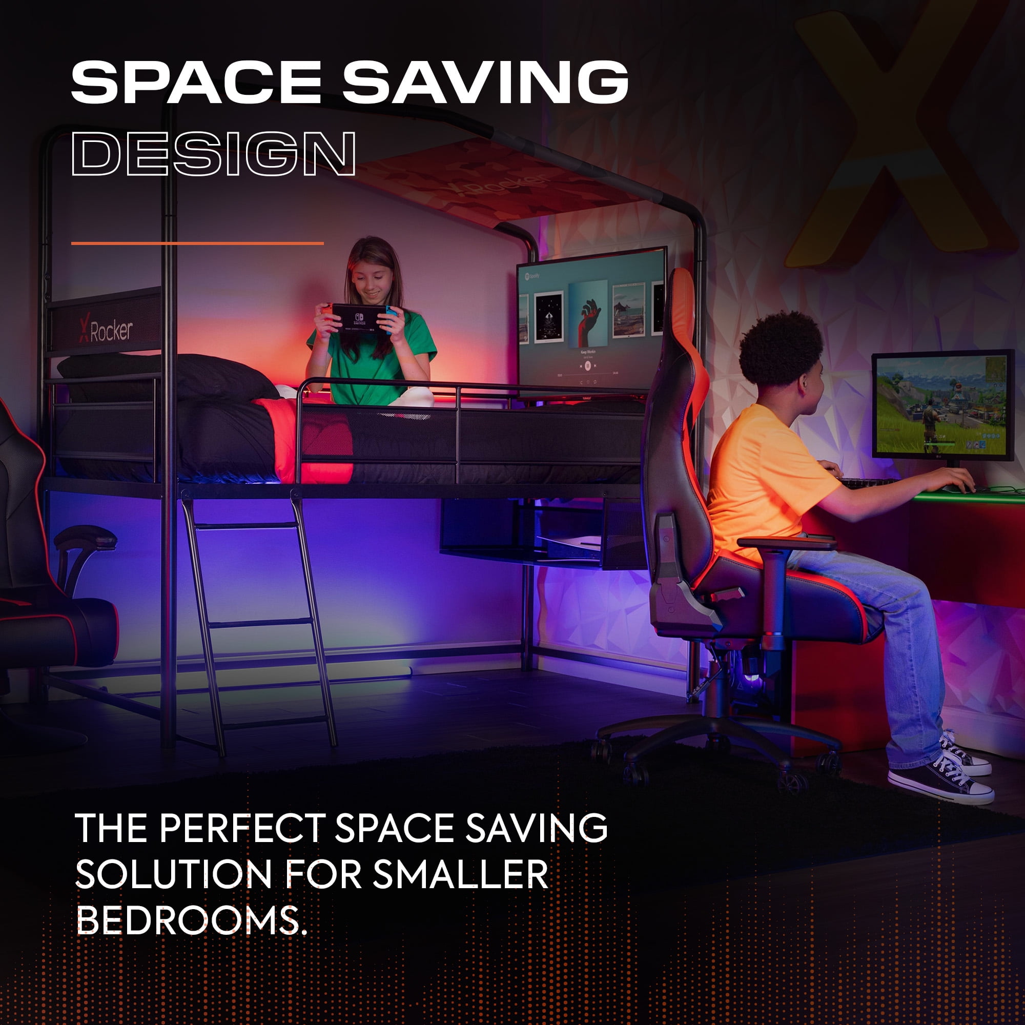 BUILT-IN TV MOUNT I Built-in standard VESA mount can hold TV screens up to 32″. VERSATILE DESIGN I The bed fits a US standard twin-size mattress (not included) and features a desk underneath, making it the perfect option for dorms and bedrooms. DURABLE METAL FRAME I Made with high-quality black metal frame materials to ensure durability and longevity SAFETY I The X Rocker top bunk features a safety guardrail and ladder for easy access, while the bottom bunk can be used as a gaming or lounge area. EASY ASSEMBLY I Simple assembly, so your child can start using it right away – Bed dimensions 78″ x 51″ x 74.9″ 101.43 lb