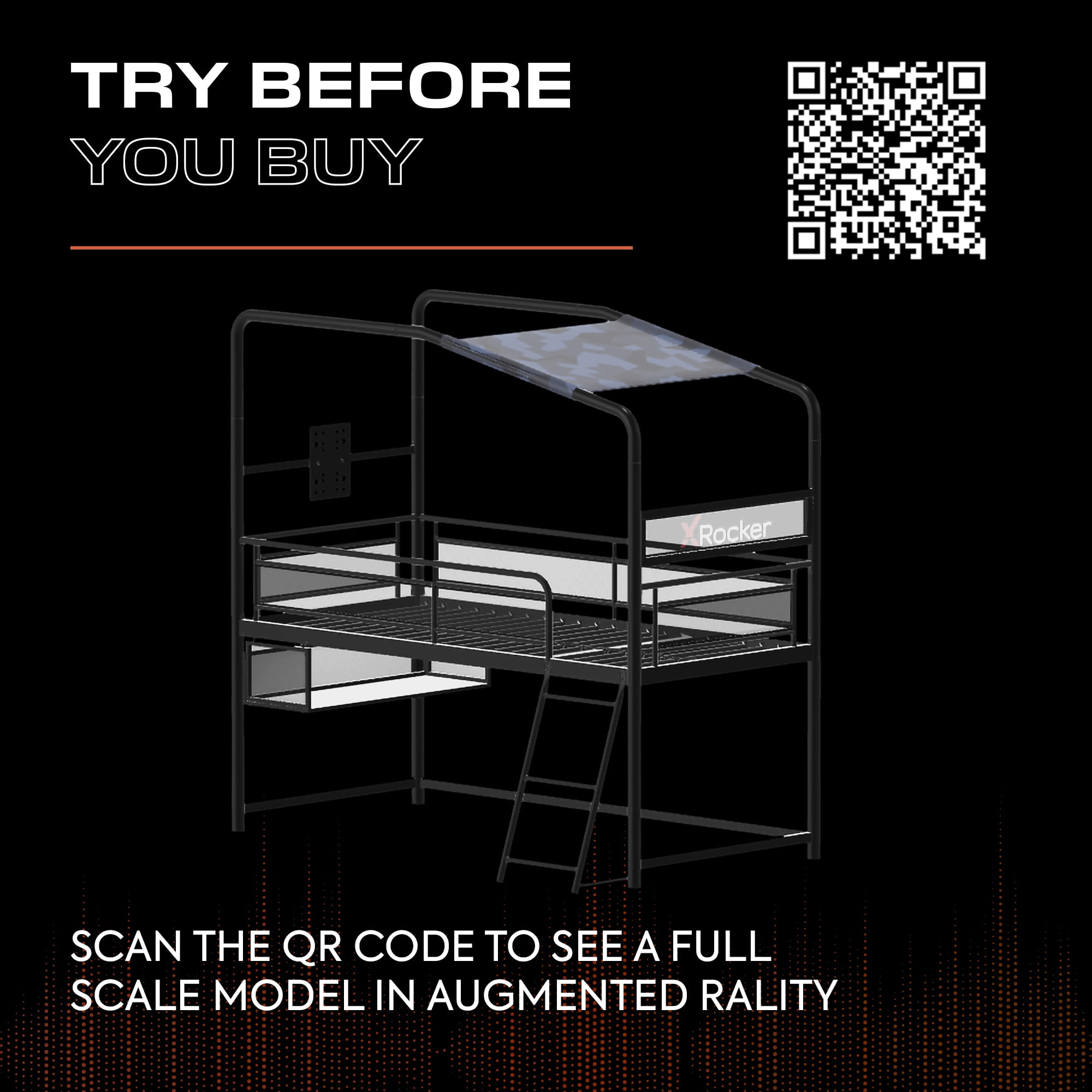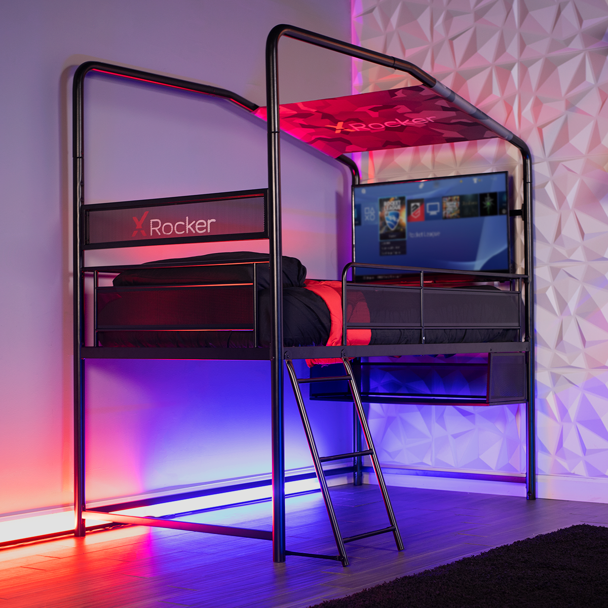 Immerse yourself in your gaming setup with the X Rocker Contra Mid-Sleeper Gaming Bed with Customizable TV Mount. This battle station is ready day or night for intense gaming sessions, which comes equipped with a storage shelf for your consoles and games, and a standard VESA mount to hold a TV screen of up to 32″”. Couple this innovative gaming bed with your child’s X Rocker gaming chair for the ultimate gaming cave setup. Level up your gamer room and be ready to game day or night with our growing range of X Rocker gaming beds. Designed to give you the best of both worlds, we have a huge selection of eSports-inspired bed frames from electric TV beds with ottoman storage to metal bunks, LED Beds, and beds with built-in desks, computer desks, and shelving for a space-saving solution. Celebrating over 15 years of success in the industry, X Rocker is renowned for redefining home entertainment for gamers across the globe. Our mission is to make gaming accessible for the whole family. With X Rocker’s huge product offering of gaming chairs, desks, and the world’s first gaming beds; there’s something for everyone to enhance their gaming lifestyle. As always, design and innovation are at the forefront of our vision as we continue to push the boundaries of gaming furniture in today’s global market.