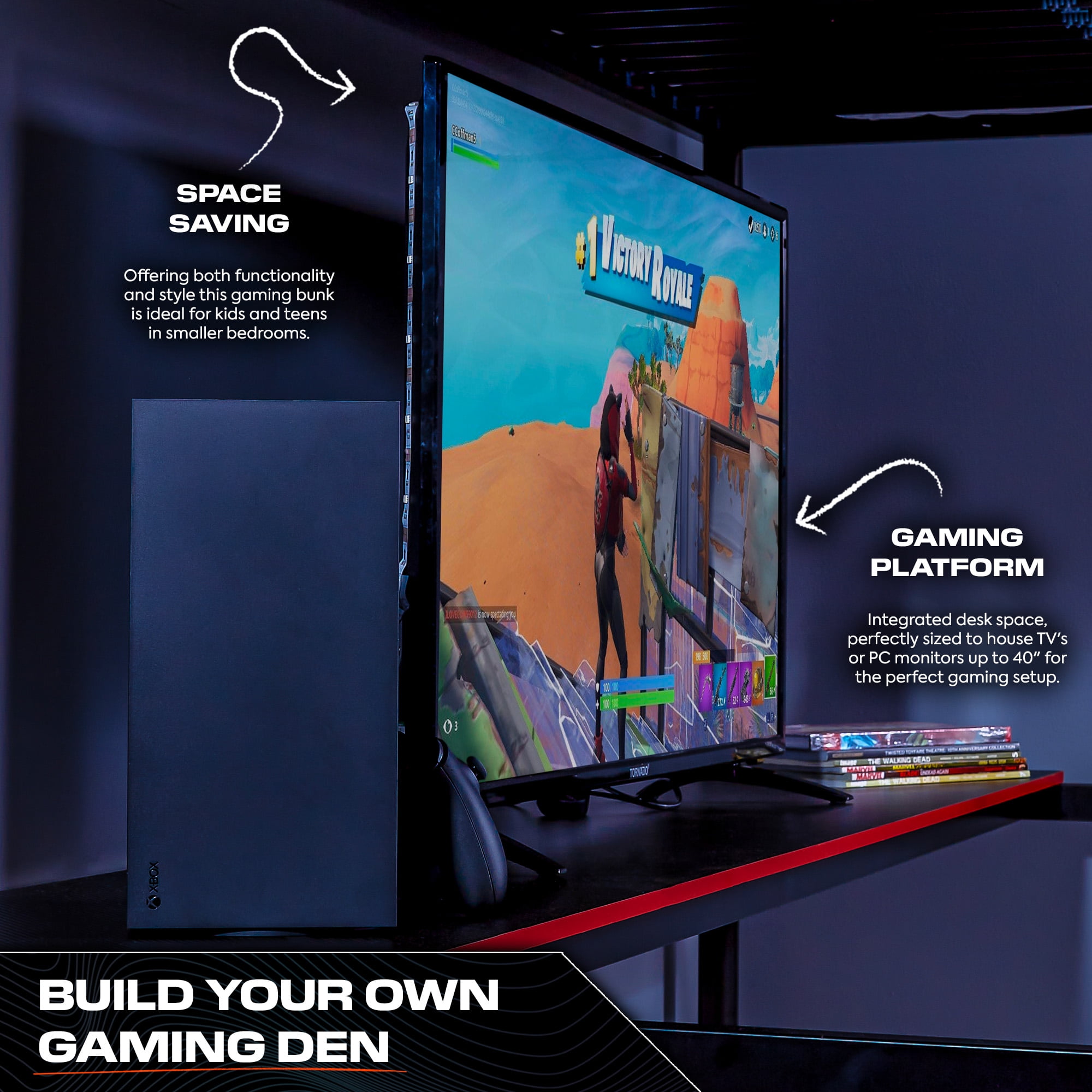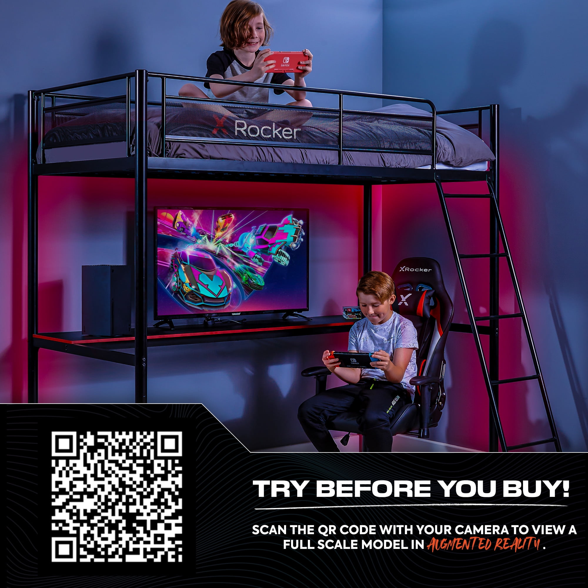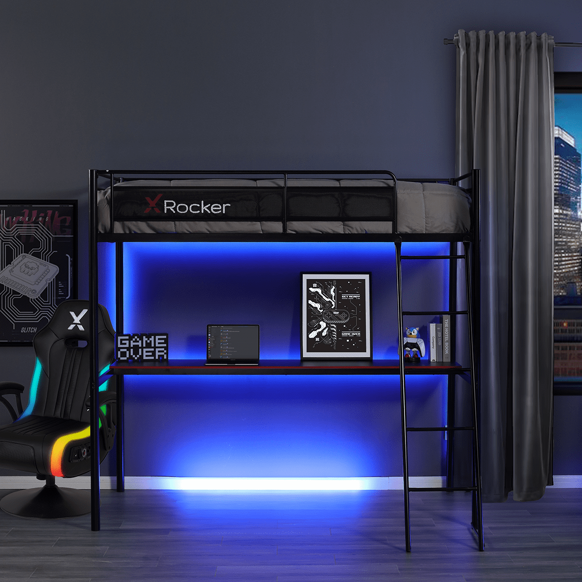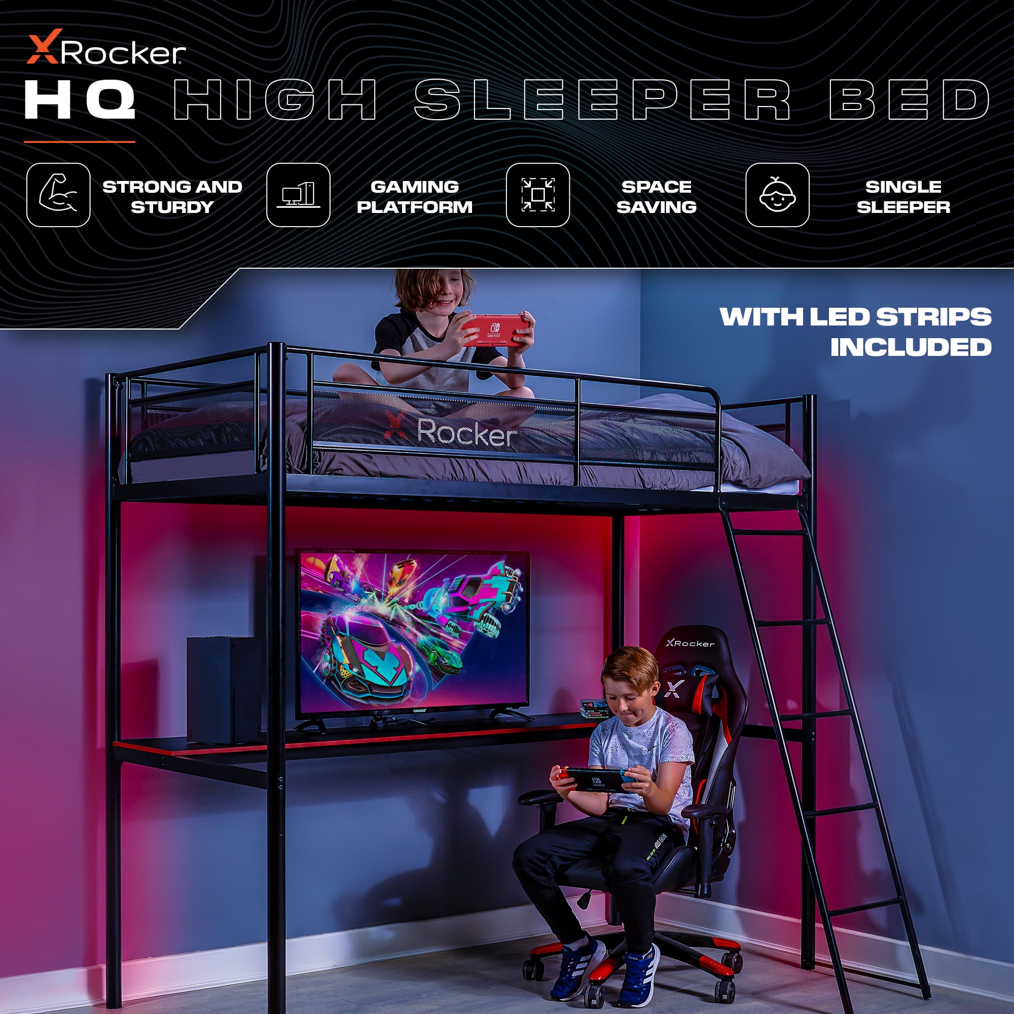 The X Rocker HQ Gaming Bunk Bed with Built-In Shelving is a versatile bunk bed/battlestation hybrid, perfect for younger gamers and college dorms. Featuring a high bunk platform and gaming desk/TV stand that allows you to build the ultimate battlestation. Constructed with a strong and durable metal frame provides stability while the bottom den is perfect for space saving by providing you with a laptop desk or TV stand. Level up your gamer room and be ready to game day or night with our growing range of X Rocker gaming beds. Designed to give you the best of both worlds, we have a huge selection of eSports-inspired bed frames from electric TV beds with ottoman storage to metal bunks, LED Beds, and beds with built-in desks, computer desks, and shelving for a space-saving solution. Celebrating over 15 years of success in the industry, X Rocker is renowned for redefining home entertainment for gamers across the globe. Our mission is to make gaming accessible for the whole family. With X Rocker’s huge product offering of gaming chairs, desks, and the world’s first gaming beds; there’s something for everyone to enhance their gaming lifestyle. As always, design and innovation are at the forefront of our vision as we continue to push the boundaries of gaming furniture in today’s global market.