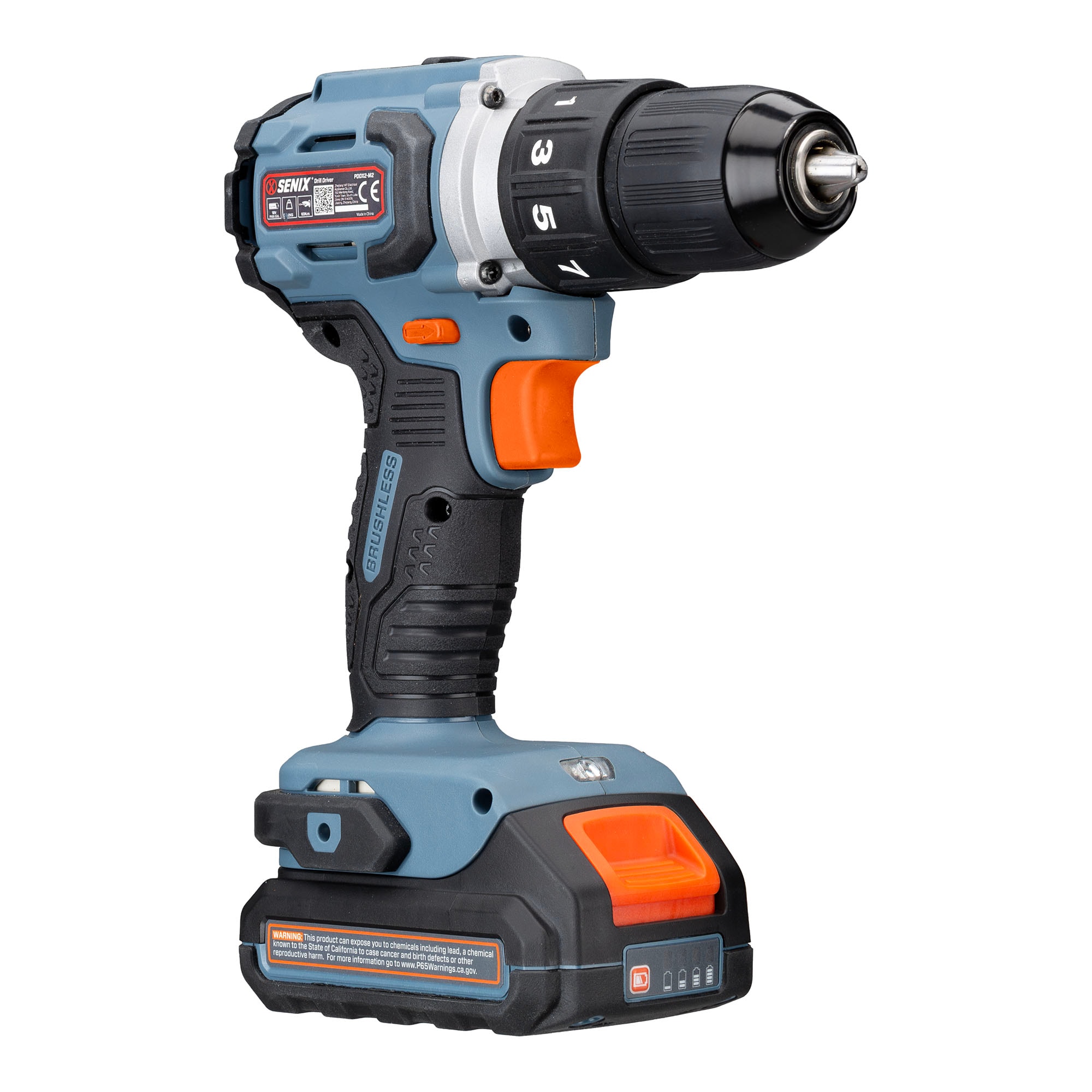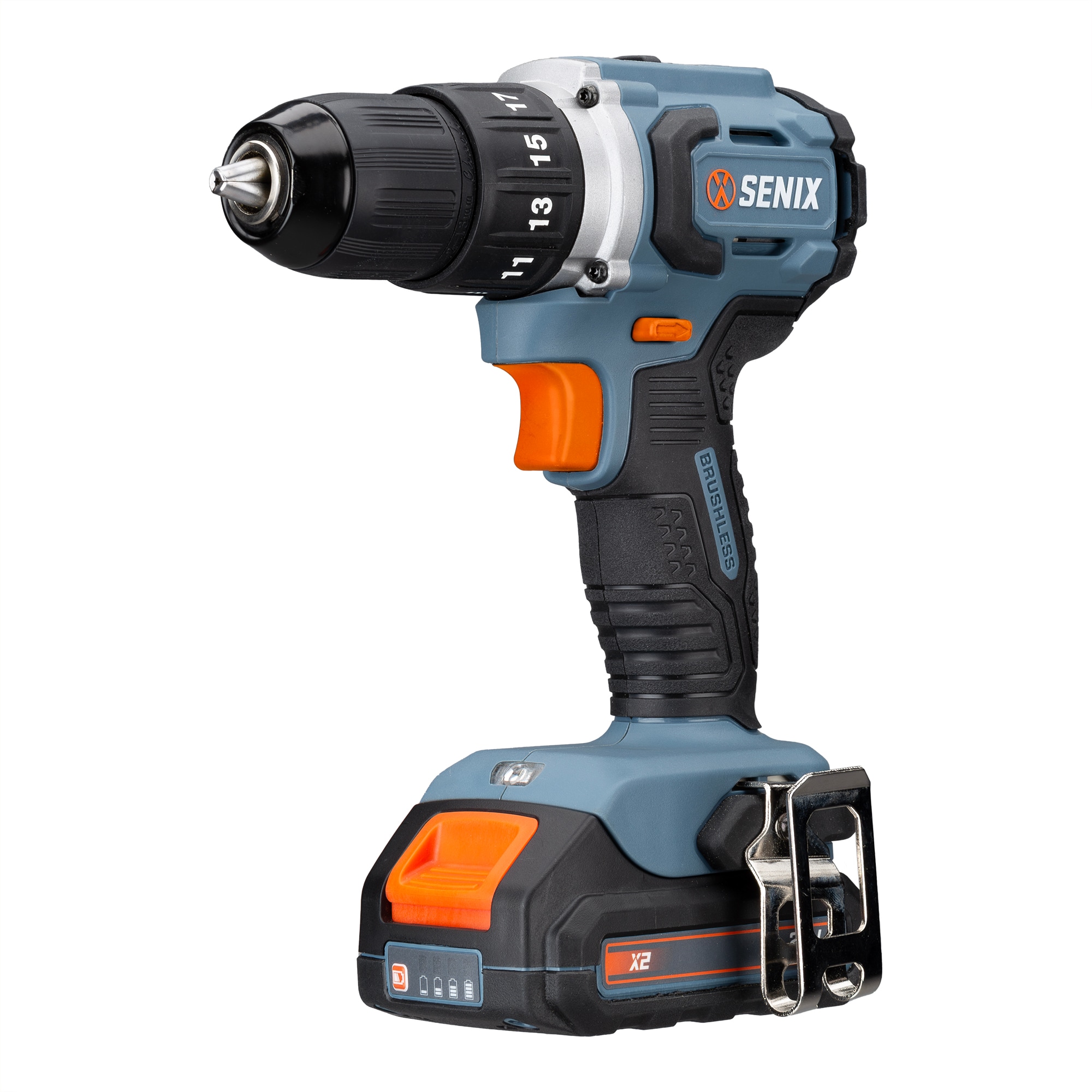 The SENIX PDDX2-M2 20V Max* cordless 1/2-inch drill/driver features a high-performance brushless motor that delivers up to 45 foot-pounds of torque and 2000 RPM efficiently with longer runtime. The 1/2-inch keyless, ratcheting chuck is designed for increased strength and durability. The 17-position clutch and 2-speed gear box match different drilling and driving needs. Ergonomic and compact design offers user comfort during prolonged use. For use with SENIX 20V Max* batteries and CHX2 2 Amp charger. Battery, charger and soft bag are included. All SENIX 20 Volt Max* cordless products are backed by our 5-year limited warranty and all SENIX lithium-ion batteries and chargers are backed by our 3-year limited warranty for your peace of mind. *20 Volt Max* battery, maximum initial battery voltage (measured without a workload) is 20 volts. The nominal voltage is 18.