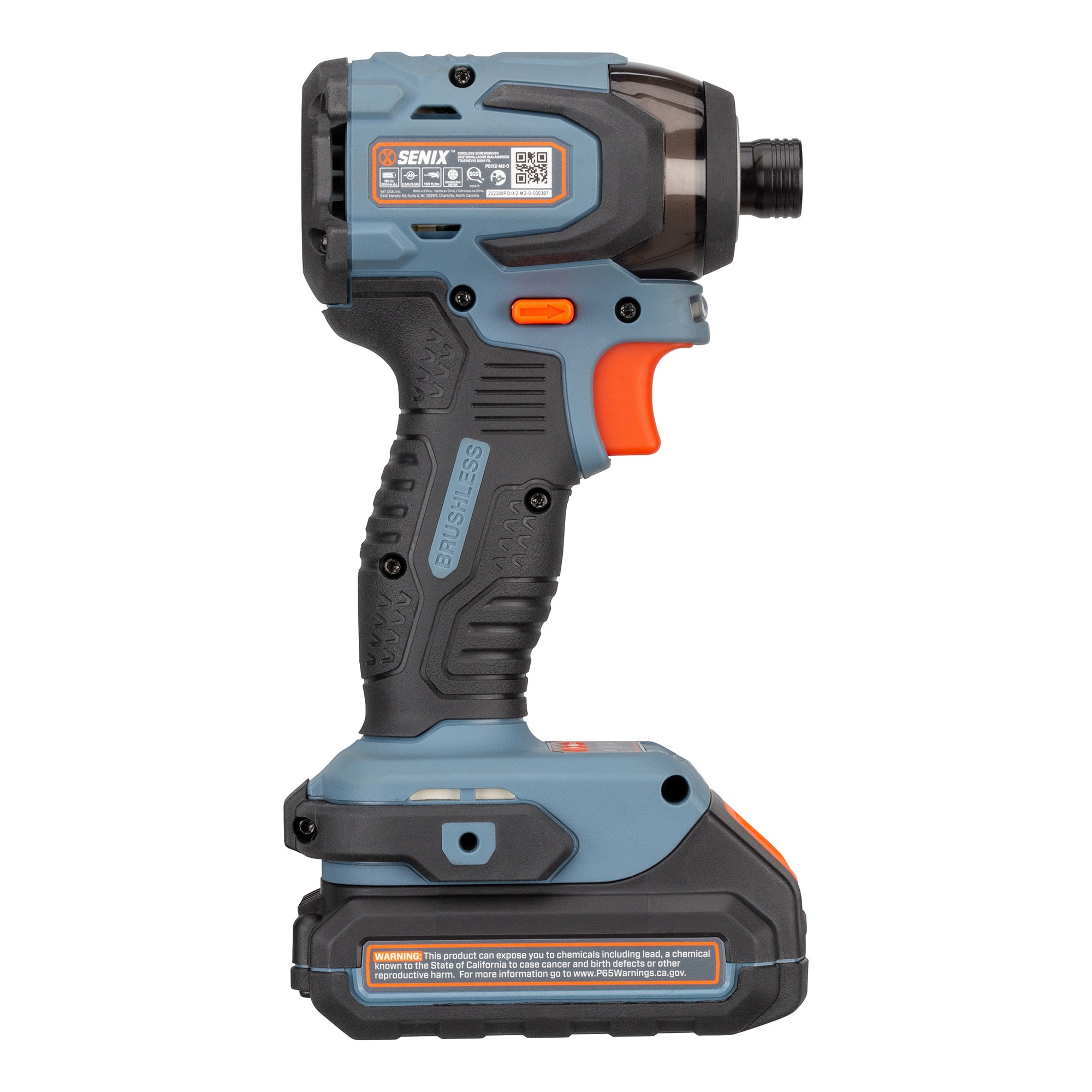 The SENIX PDIX2-M2 20V Max* cordless 1/4-inch impact screw driver features a high-performance brushless motor that delivers up to 130 foot-pounds of torque and 3000 RPM to drive large-diameter screws and bolts. Brushless motor provides more efficient performance and longer runtime. The 4-speed selector switch offers greater control over a wide range of fastening applications. The 1/4-inch hex drill bit holder for easy and secure bit connection. Reversal Auto-Stop button stops tool automatically after bolts / nuts get loosened enough to prevent them from falling. The bright LED light with On / Off button provides increased visibility. Ergonomic and compact design for user comfort during prolonged use. Overmold with customized micro texture for optimum grip and user comfort. For use with SENIX 20V Max* batteries and CHX2 2 Amp charger. Battery, charger and soft bag are included. All SENIX 20 Volt Max* cordless products are backed by our 5-year limited warranty and all SENIX lithium-ion batteries and chargers are backed by our 3-year limited warranty for your peace of mind. *20 Volt Max* battery, maximum initial battery voltage (measured without a workload) is 20 volts. The nominal voltage is 18.