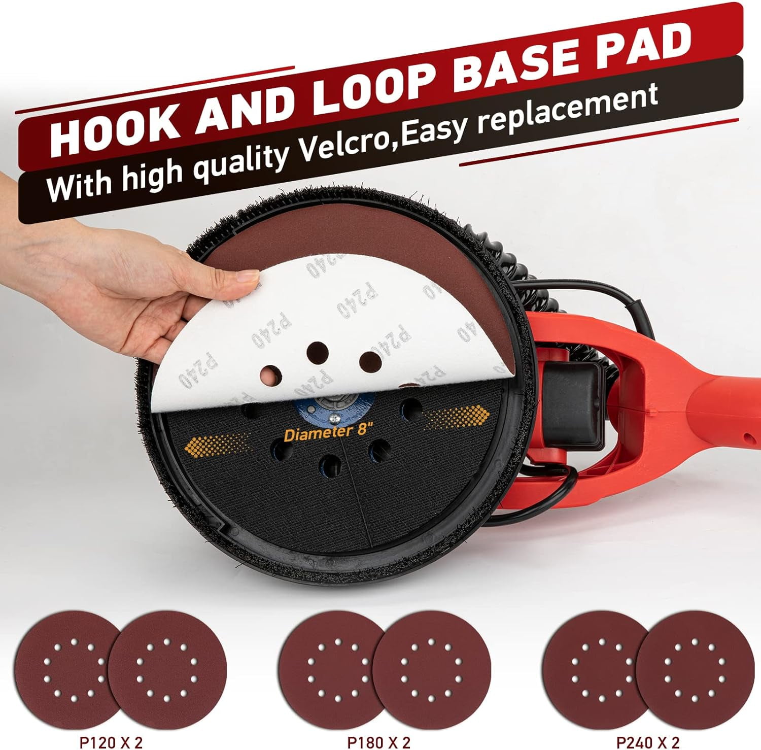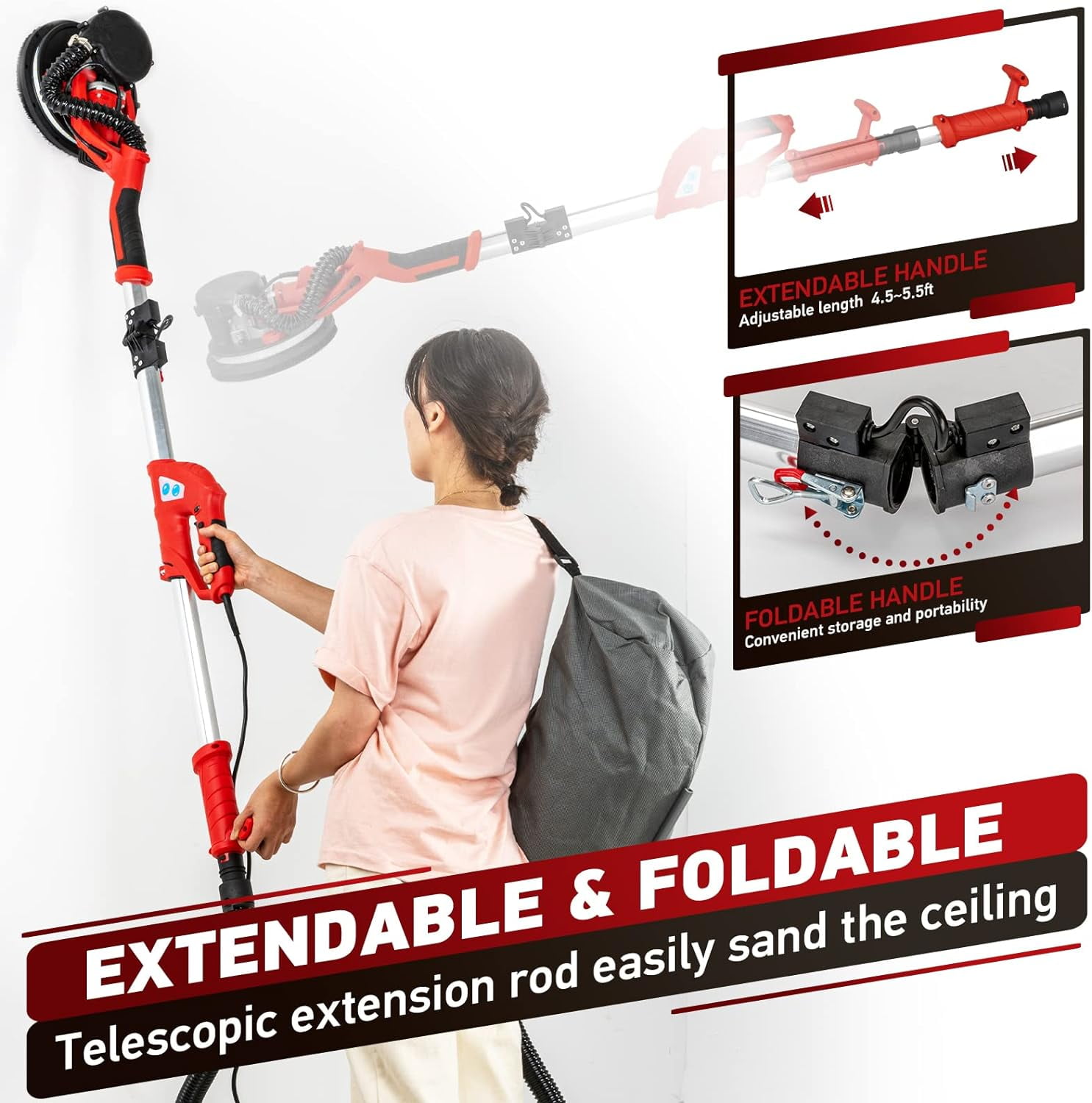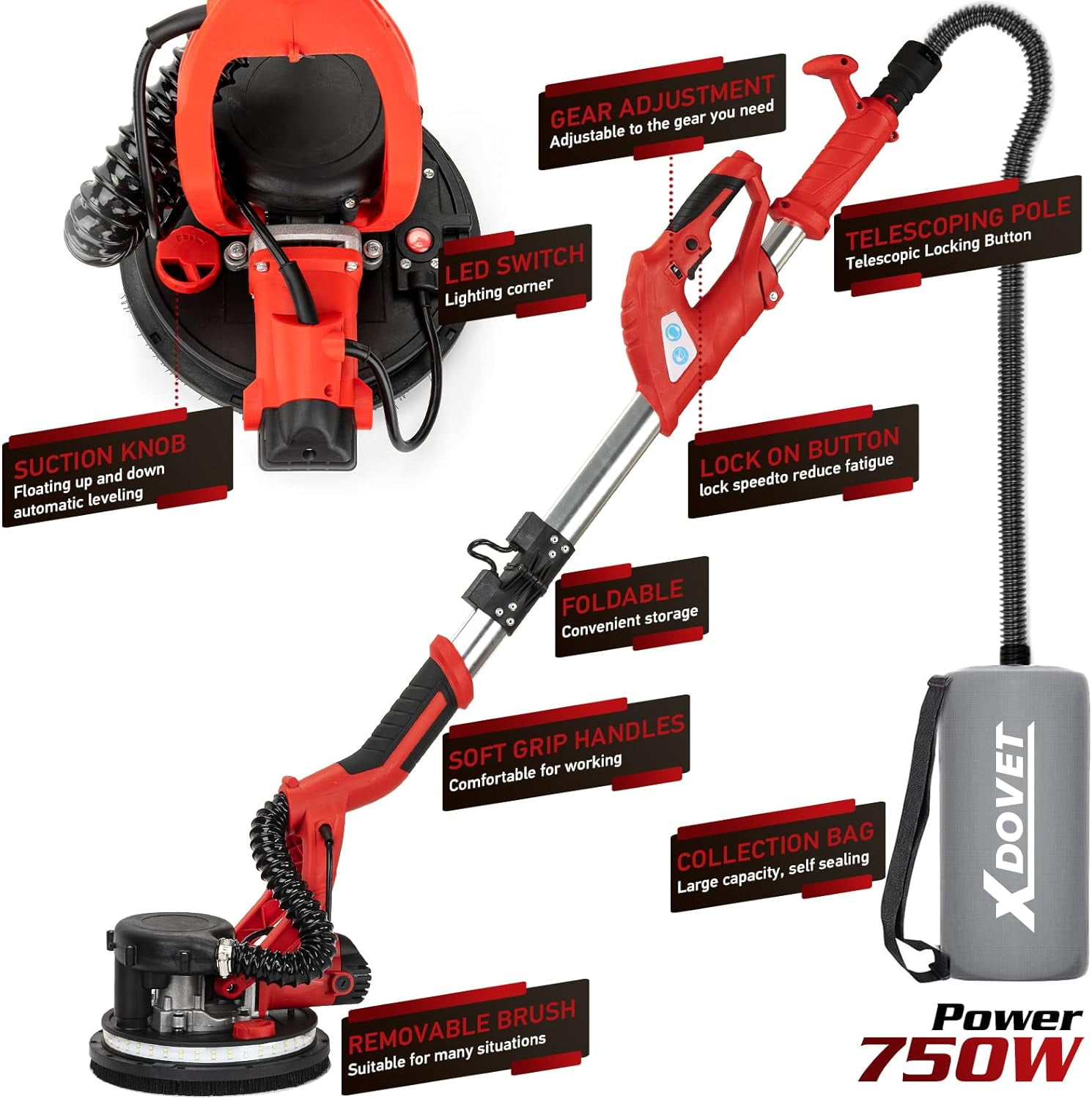 7A HIGH POWER MOTOR: The XDOVET drywall sander delivers a powerful 850W, providing plenty of power for sanding surfaces quickly and efficiently; the six variable speeds allow you to switch between 800-1750 rpm VACUUM SYSTEM: Popcorn ceiling removal tool use of a vacuum cleaner in conjunction with this sander further improves the dust collection effect. If you use a dust collection bag, you will need to dispose of the dust in the bag frequently to maintain the dust collection effect. A dry wall sander with vacuum attachment will minimize your cleaning efforts ADJUSTABLE HEAD AND LED LIGHTS: This wall sander for drywall keeps the head at a perpendicular angle to the ceiling for more effortless and flexible operation; the 360° double-decker LED lights provide plenty of illumination for clear sanding, even in dark environments; in addition, the lights are soft and non-stinging, which is also friendly to the eyes SPACE SAVING AND CONVENIENT: The drywall sander with vacuum designed with a foldable handle for easy storage when you’re not using it; this wall sander with vacuum can be folded and bagged, making it easier to store and carry ERGONOMIC DESIGN: the dustless drywall sander maximum range can be extended to 90”, more convenient for sanding ceilings, the head-to-tail weight ratio is close to 3/4, which effectively avoids top-heaviness, and the handle can be adjusted in length according to the need to adapt to different working heights