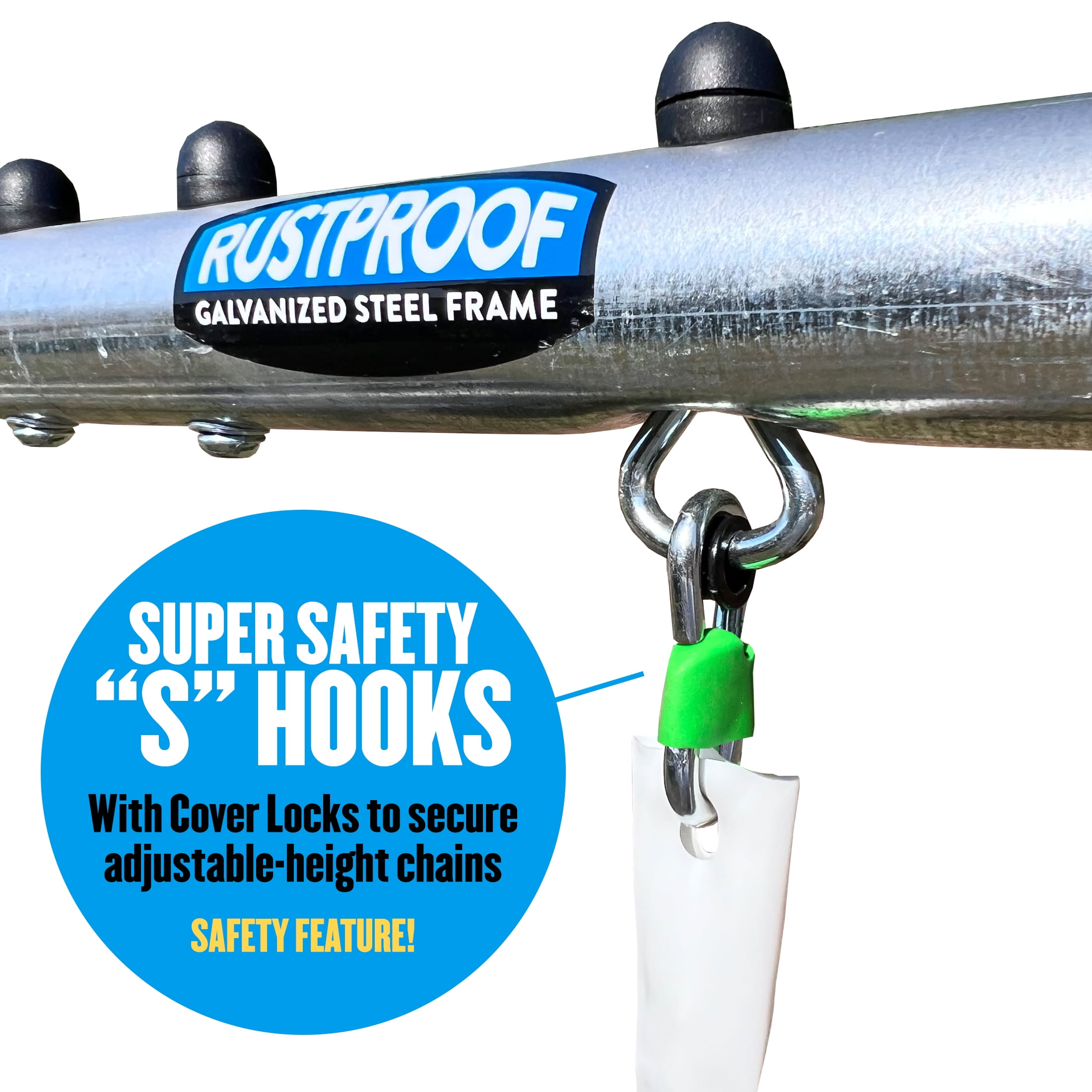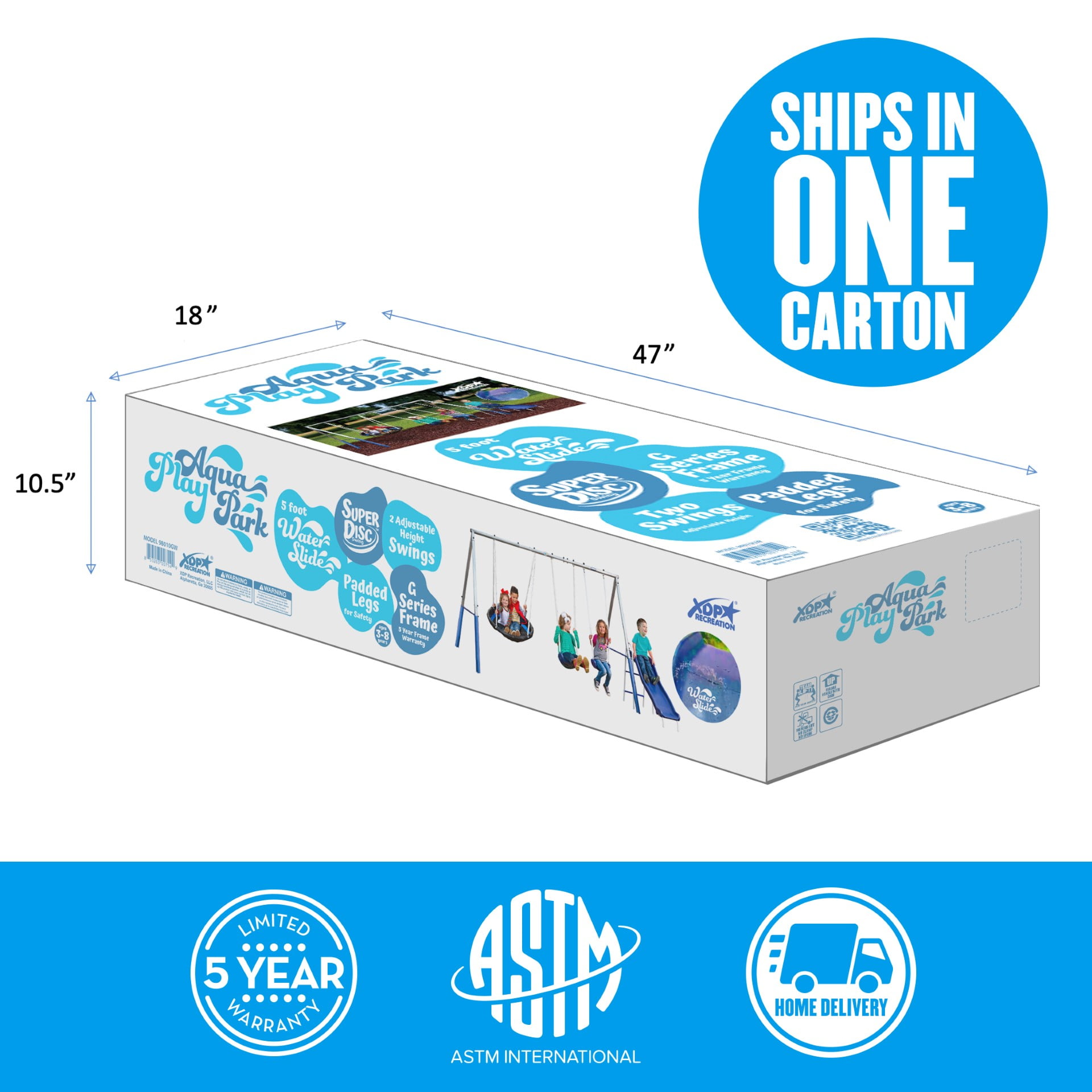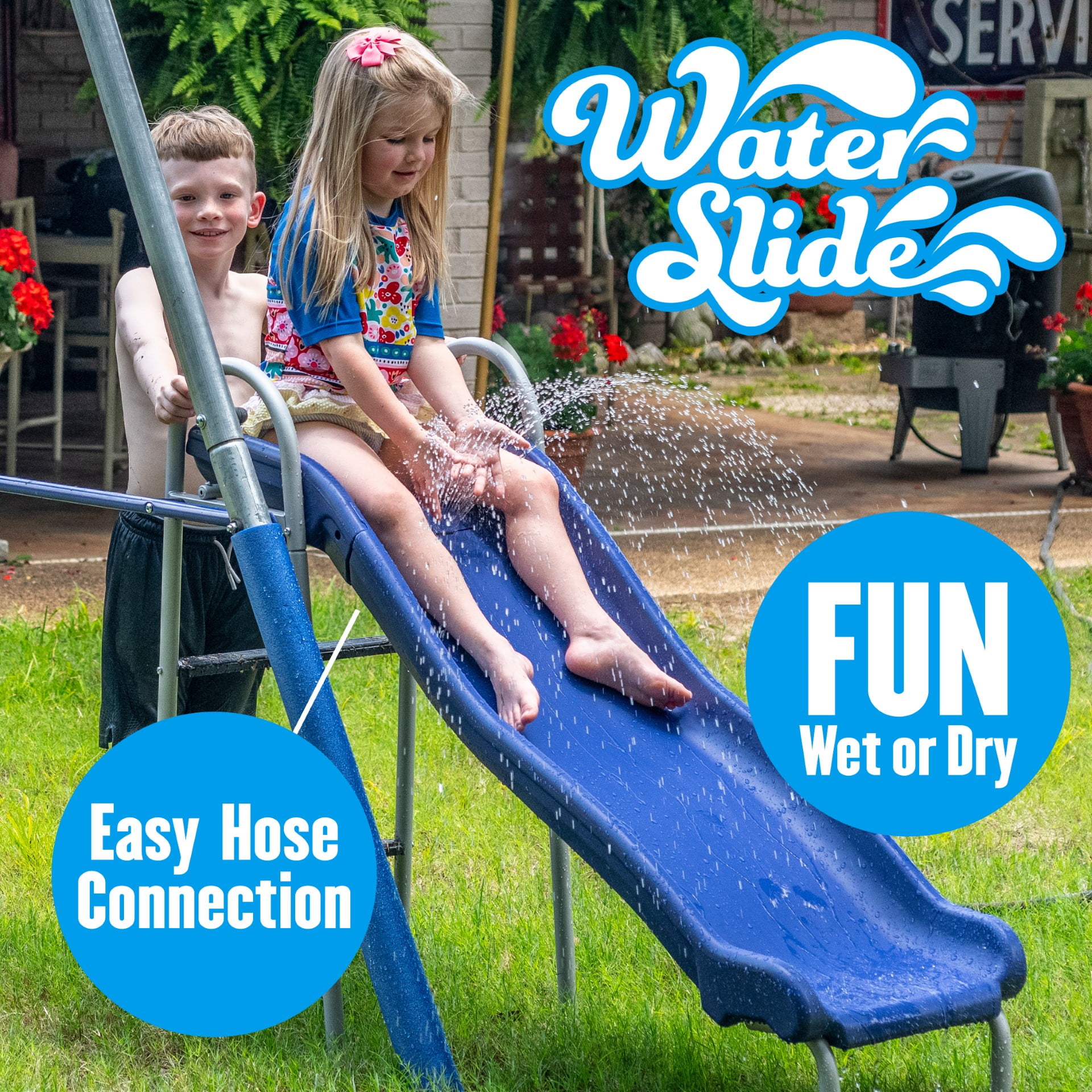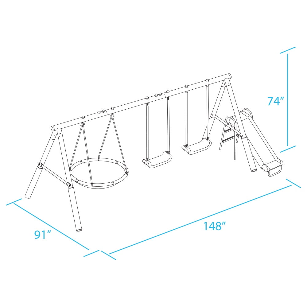 Water Wave Slide (Patent Pending) – Solid Blow Molded Slide with Safe Landing Zone connects to a hose for some water fun for kids. Water sprays over the slide, keeping kids and the slide cool in hot summers! (Slide can be used with or without water function). Two large blow-molded, adjustable-height swing seats. SUPER DISC ™ 34-inch diameter saucer swing for 2, with padded frame and weather-resistant durable fabric. One Super Disc Swing for two with a padded frame for child safety. Galvanized G Series Steel Frame with 5 Year Ltd Warranty features welded corner brackets and foam padded legs for safety. Ships in 1 box – weight 93 lbs. For Ages 3 – 8 years old. Meets all ASTM Safety Standards