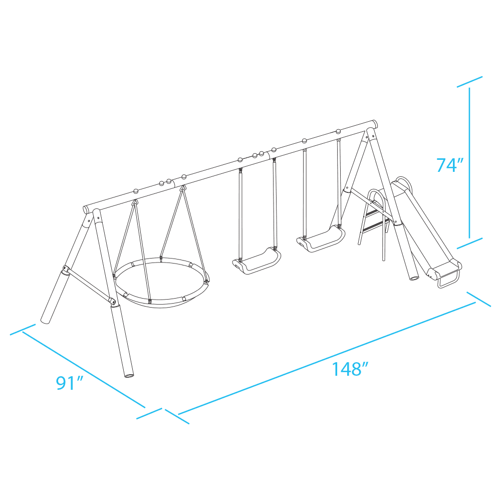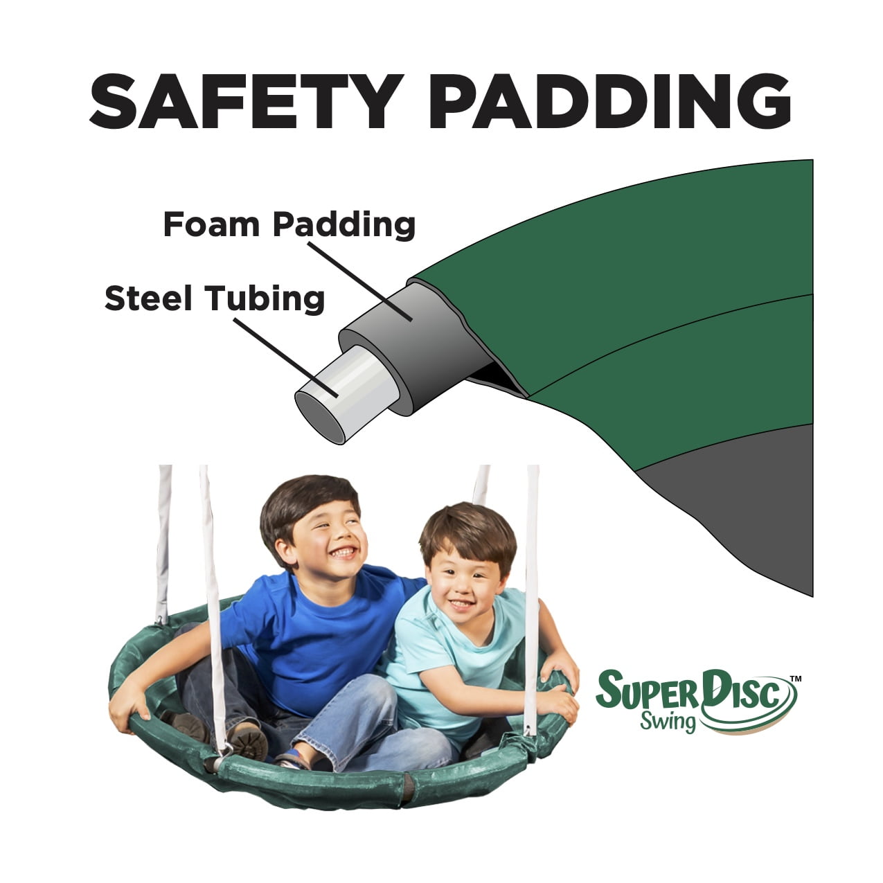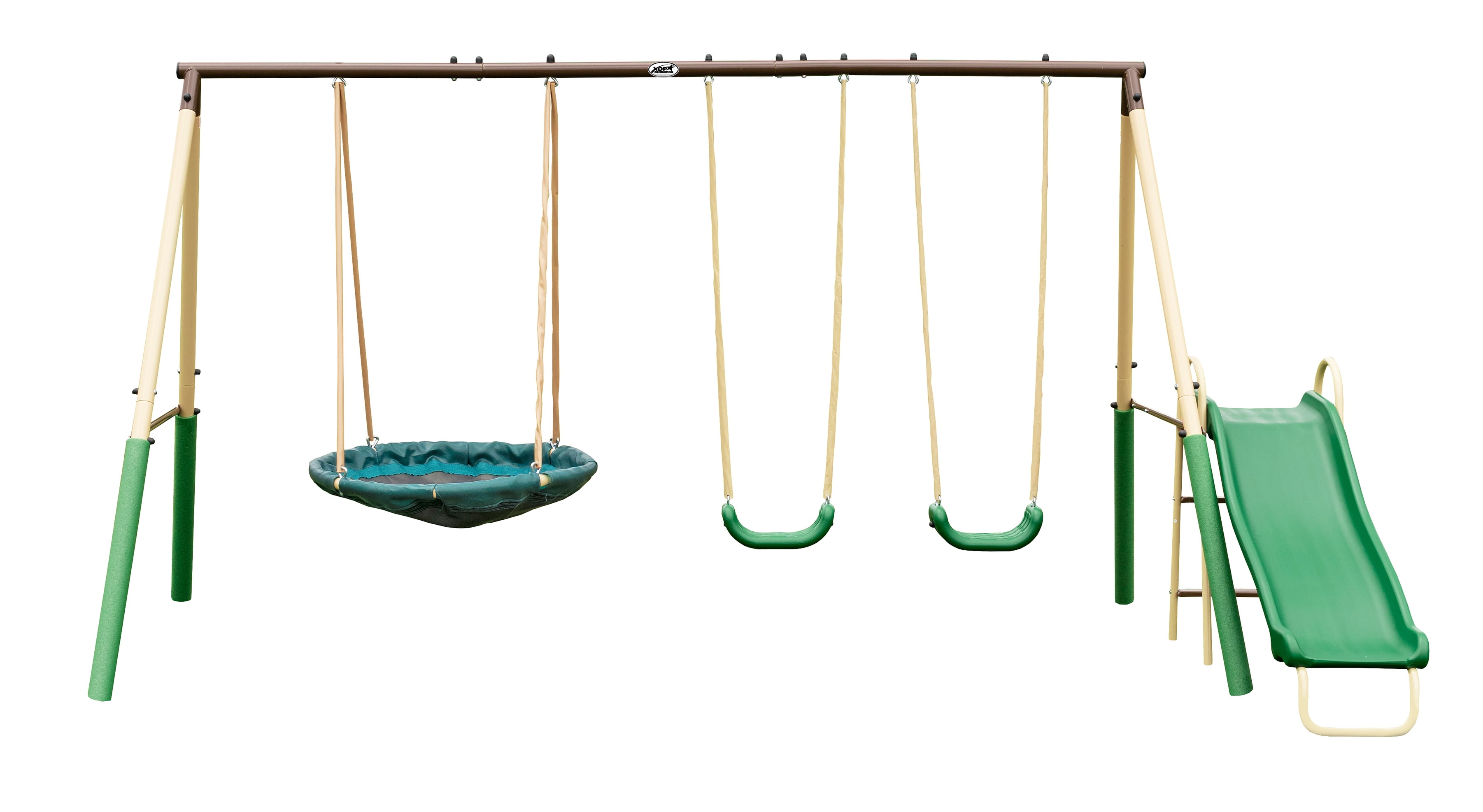 Super Disc™ Saucer Swing with Safe-Touch vinyl coated chains, weather-resistant fabric. A total of 5 kids can play on this swing set together. Ages 3-8 recommended, up to 100 lbs. per user. Powder Coat Painted Steel Tubing Frame – Green, Brown, and Beige Foam Padded Leg Protectors on all 4 legs for safety. Designed by American Families. 5′ Blow Molded Slide with “Safe Landing” zone. 4 Leg, 2″ Diameter Welded Steel Tubing Frame Assembled Dimensions: 122′ Width x 93″ Depth x 72″ Height. 2 Blow Molded non-slip Swing Seats with Safe-Touch vinyl-covered chains for safety. ASTM safety standards tested.