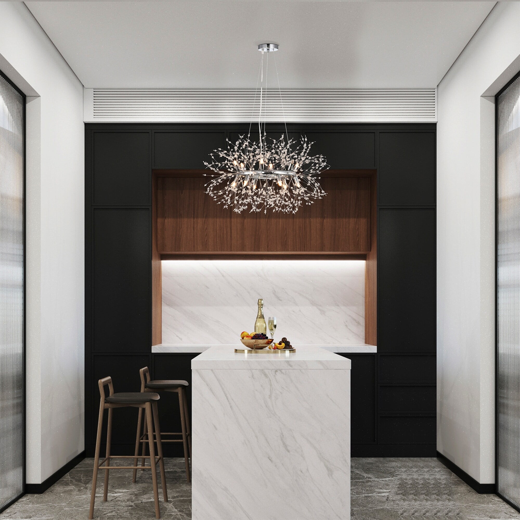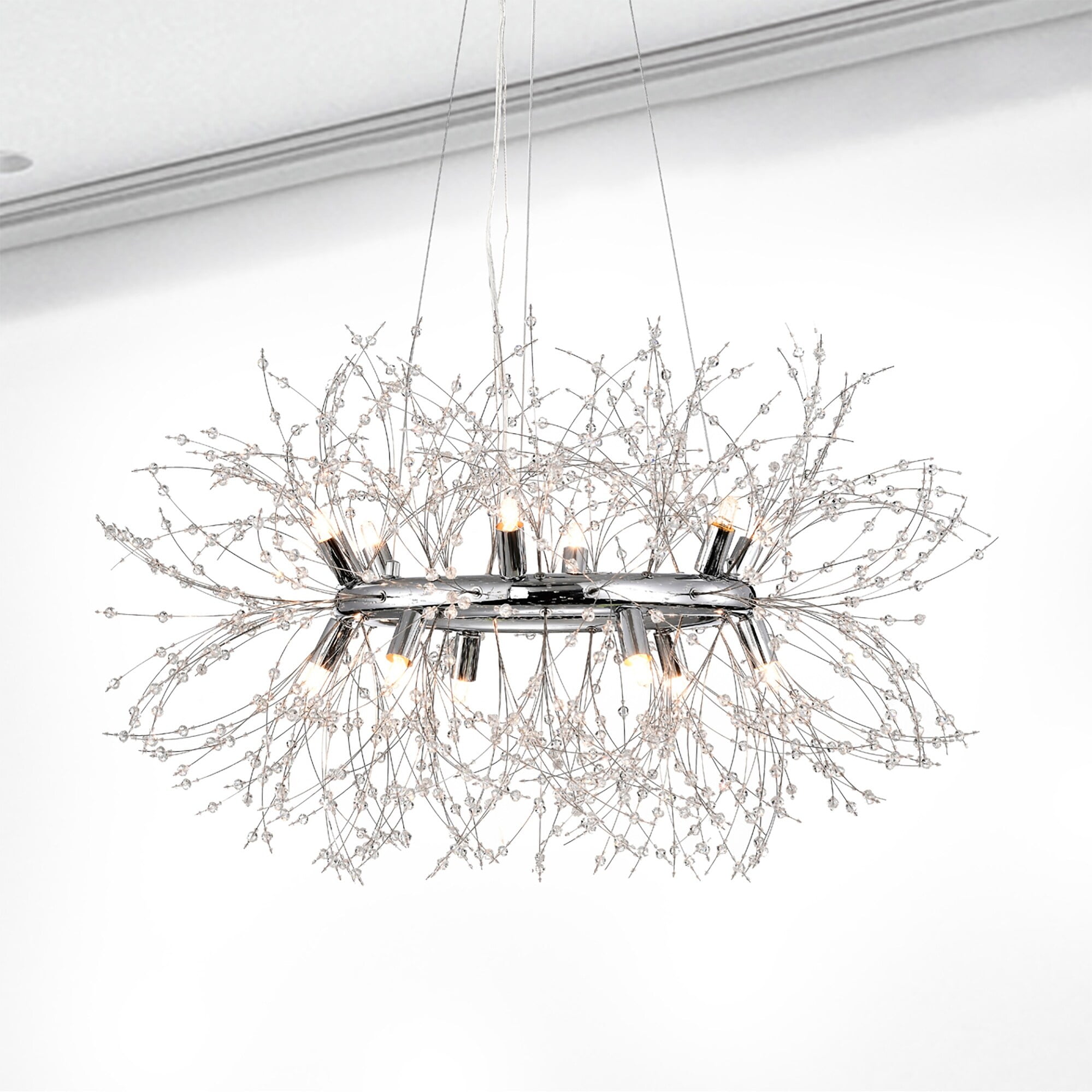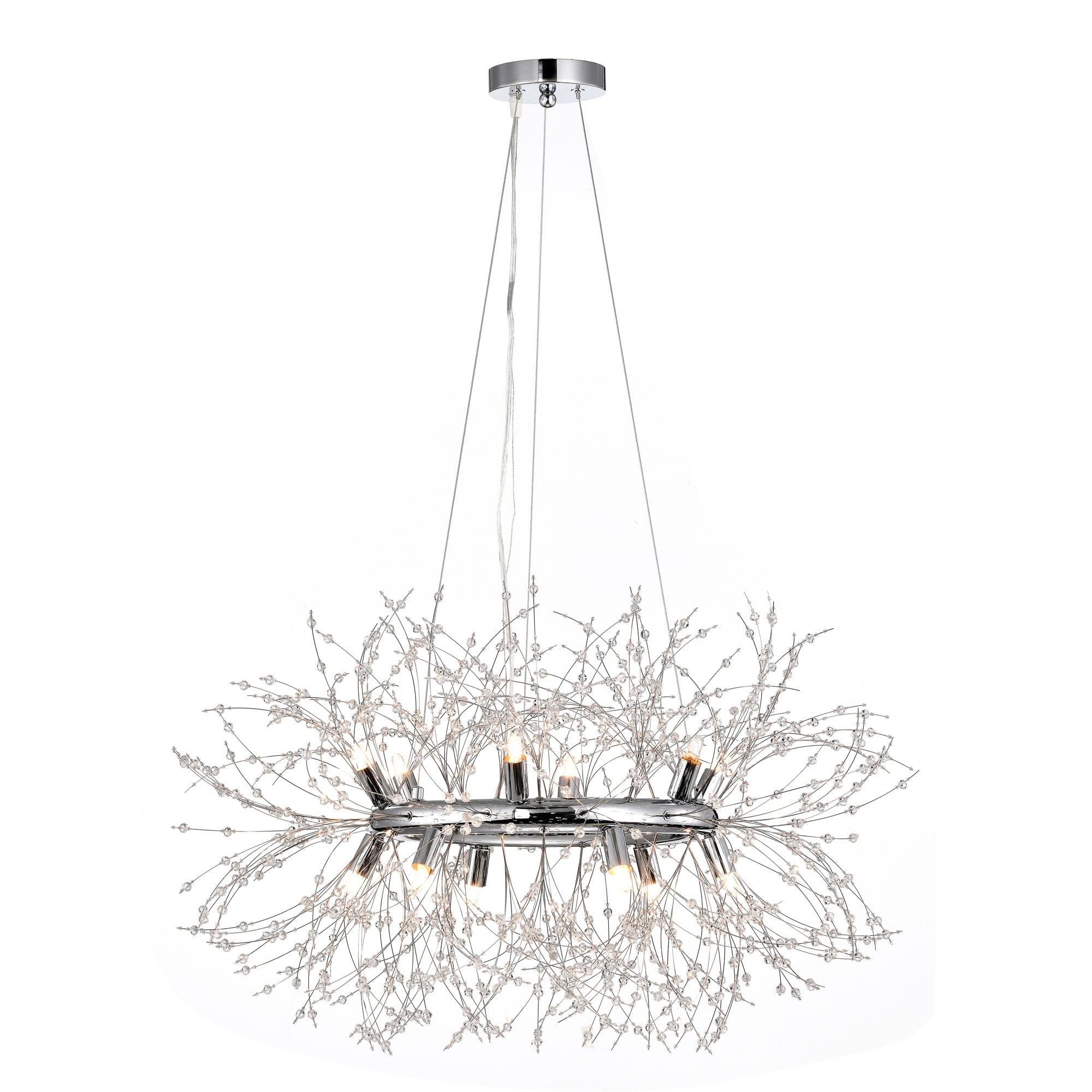 Allow your home to come to life with the installment of our 30-inch Chrome Xhosa Chandelier. Our fixture features twelve (12) lights, a crystal embedded body, and a fashionable design that is bound to refreshen your environment. Allow yourself to take in a breath of fresh air after a long day when you get home and see our 30-inch Xhosa Chandelier up in display.