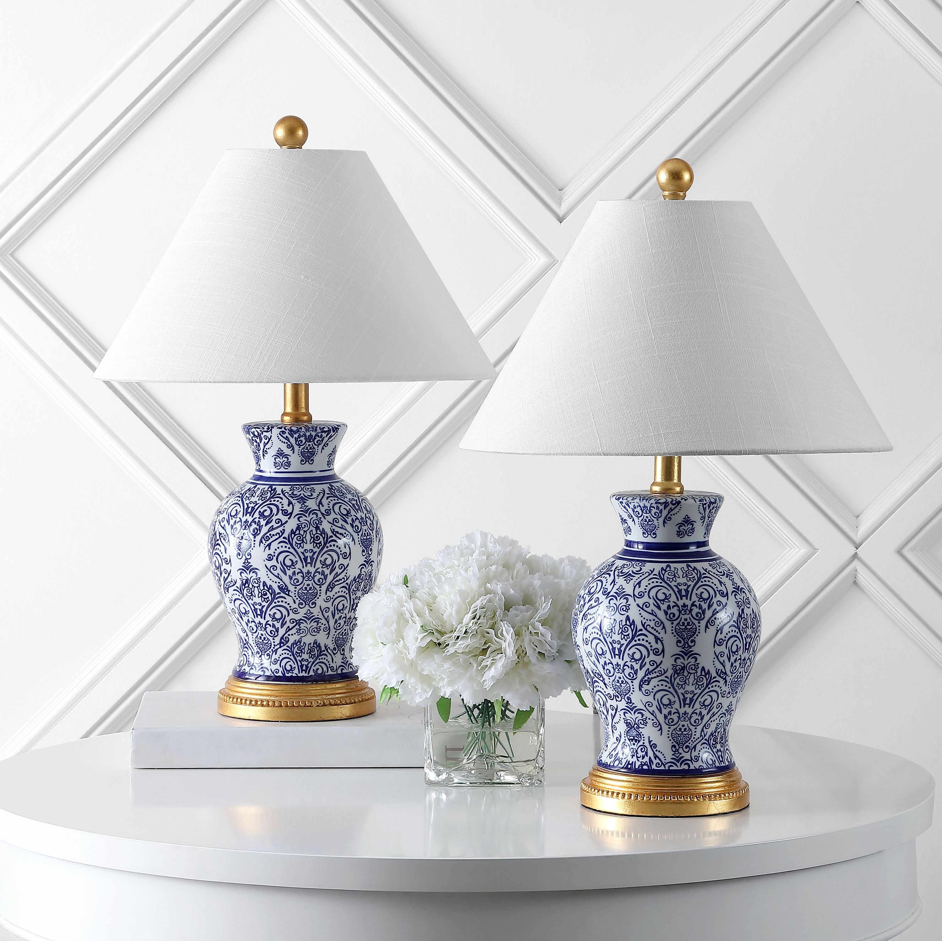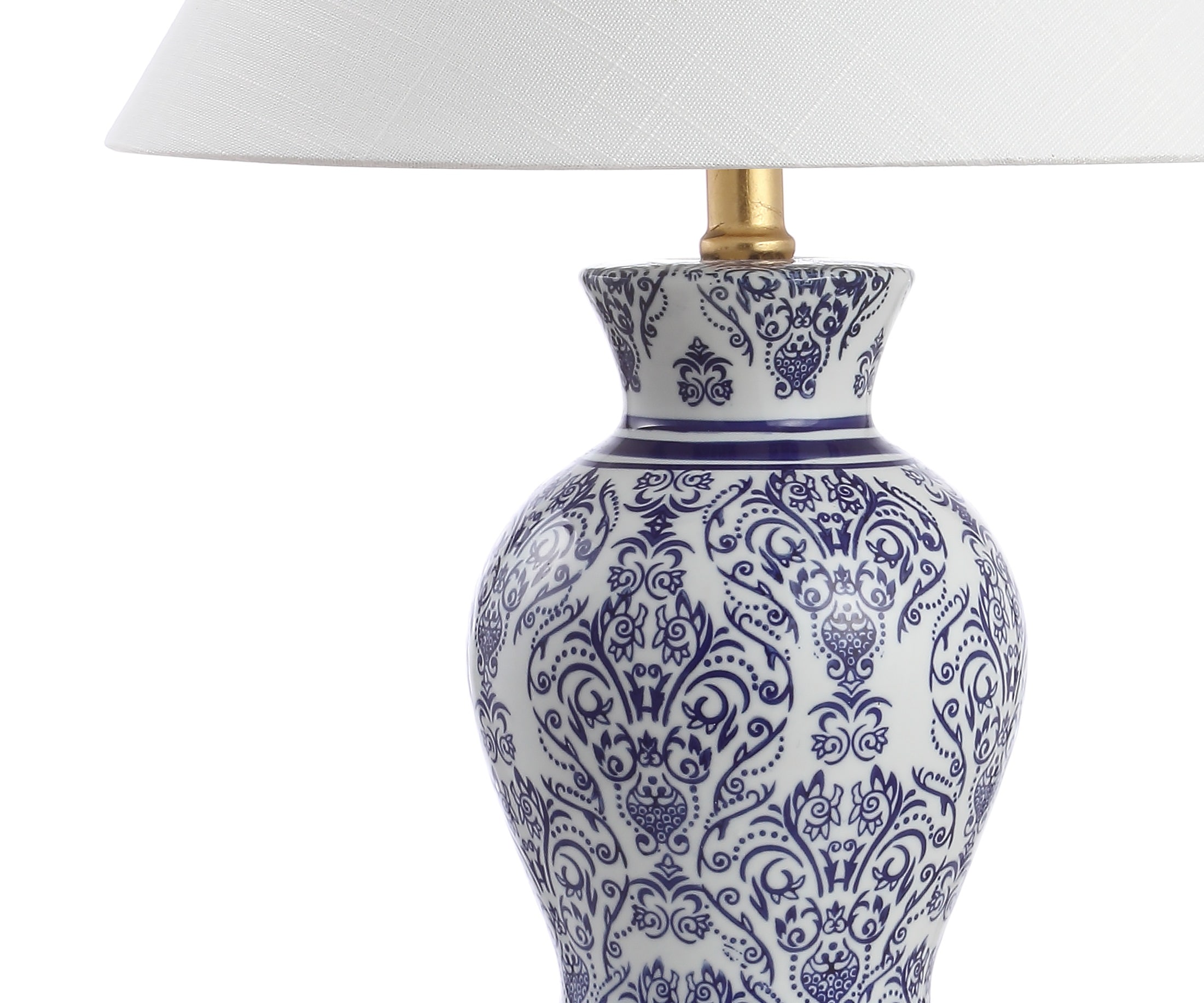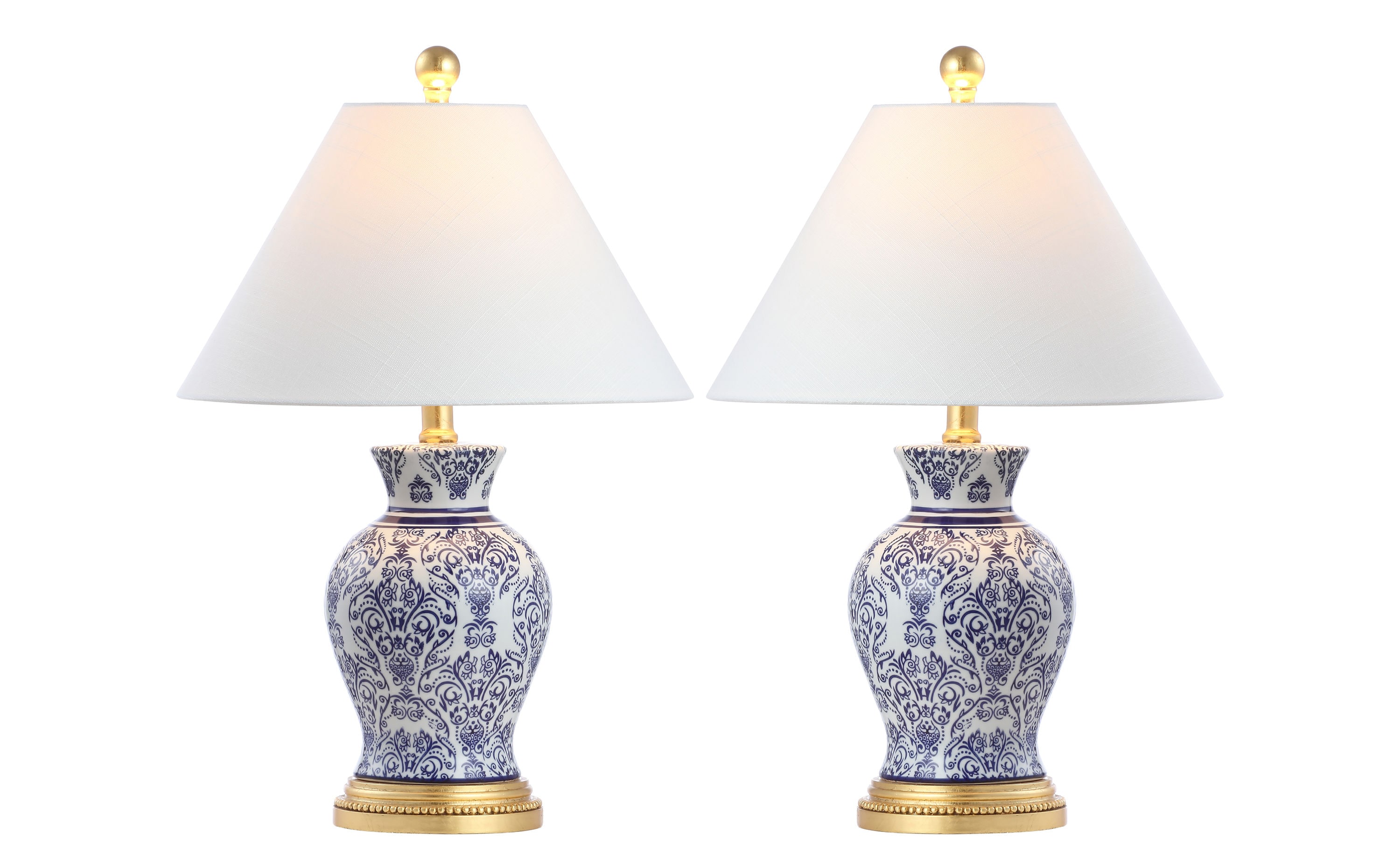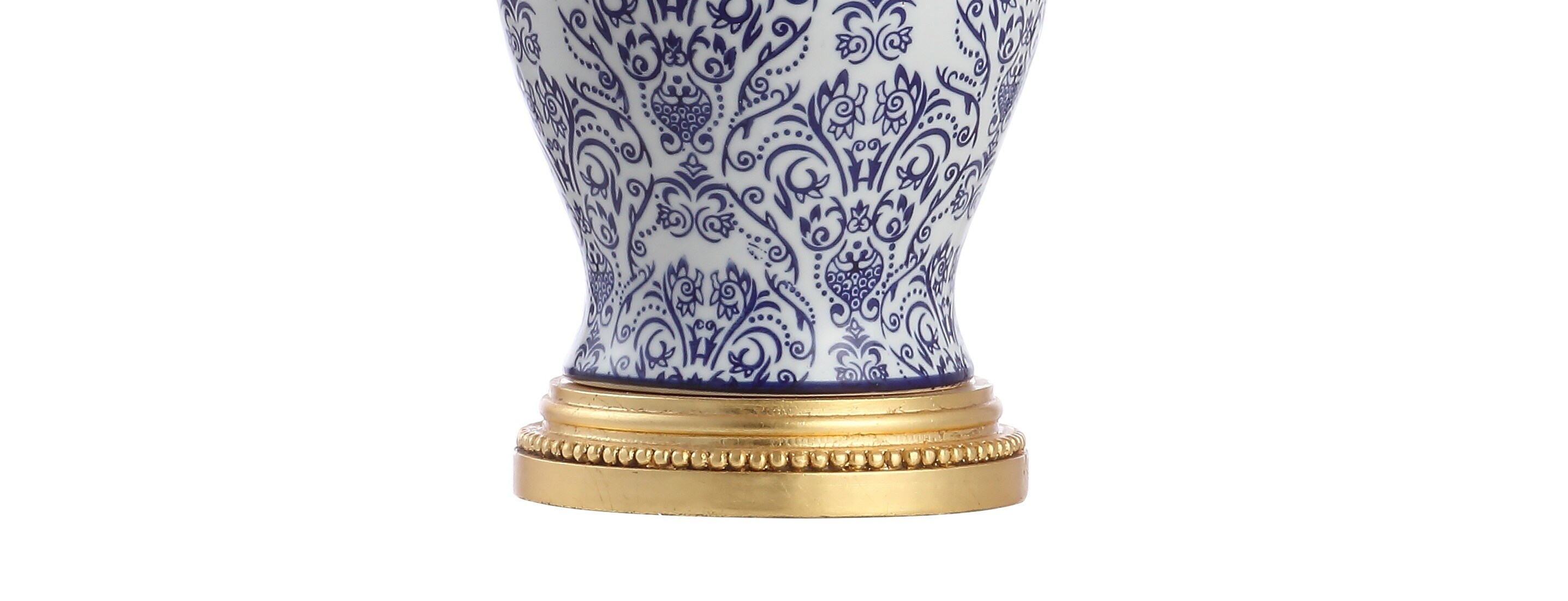 Our modern take on Chinoiseries features blue and white porcelain with an all-over floral pattern. Two lamps would make the perfect pair for a bedroom, living room, or entry console. It has a classic vase shape for a traditional look, and gold fittings to satisfy your inner Maximalist. The silk-wrapped cord is an upscale touch. Includes an energy-saving LED bulb