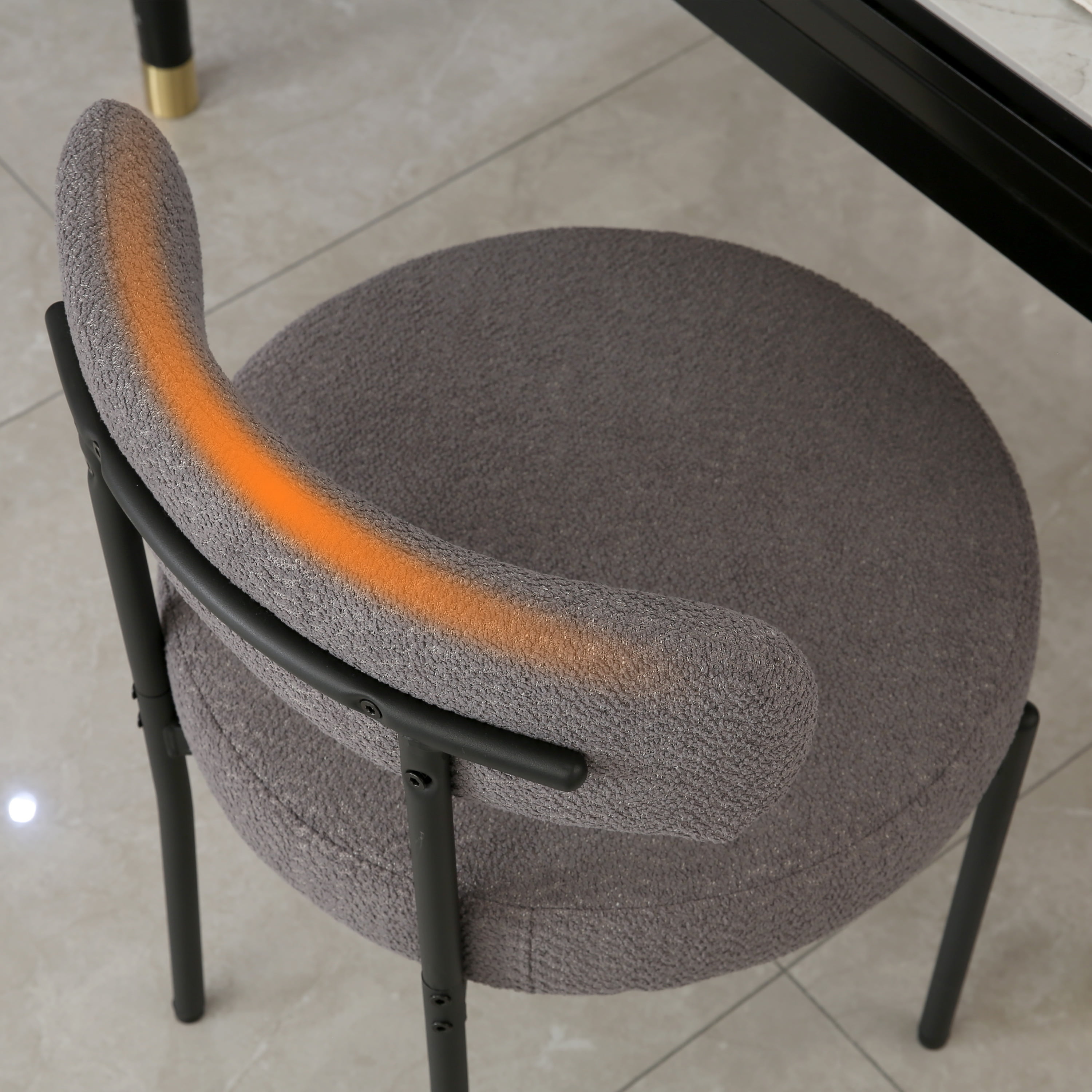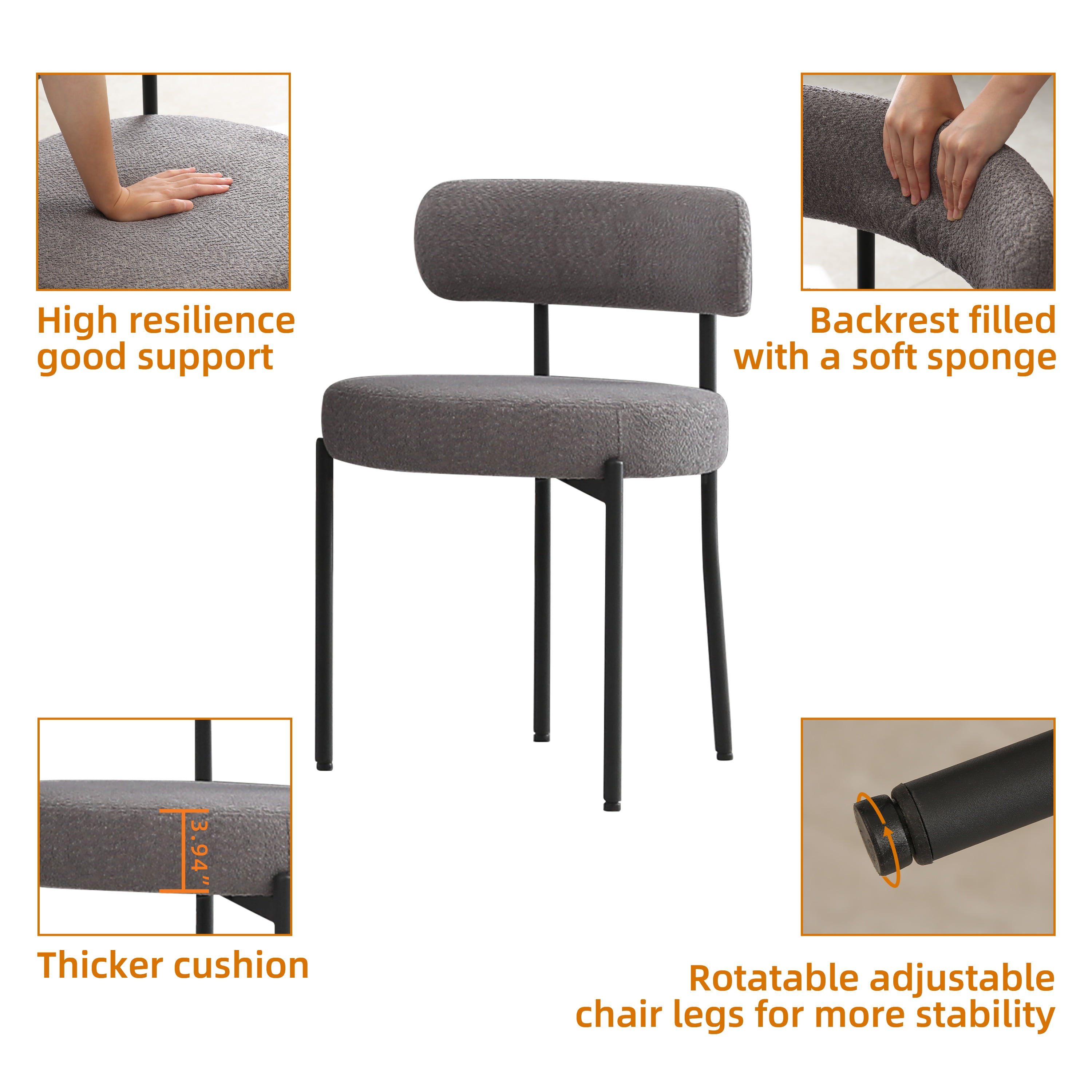 XINMICS Dining Chairs Set Multicolor Modern Boucle Dining Chair for Dining Room Kitchen. This round upholstered chair features high-quality upholstery, simple and elegant design is suitable for both modern and contemporary styles. It is perfect for use in dining room, bedroom, living room, and banquet. Skin-friendly boucle fabric is insulating that retains much of its insulating properties when wet, and is highly breathable and soft. Cushion filled with high-density sponge and the soft curved backrest provide you with good support and comfortable sitting experience. Coated metal legs are both lightweight and stable which can withstand 330 pounds without shaking, tilting or breaking. Specification: Name: Boucle dining chair Material: Fabric+Metal Color: White/Black/Camel/Orange/Gray/Dark Gray/Dark Green Size: 20.47″D x 20.47″W x 29.92″H Weight Capacity: 330lbs Count: Set of 2/Set of 4/Set of 6 Seat Height: 19.69 Inches Seat Depth: 20.47 inches
