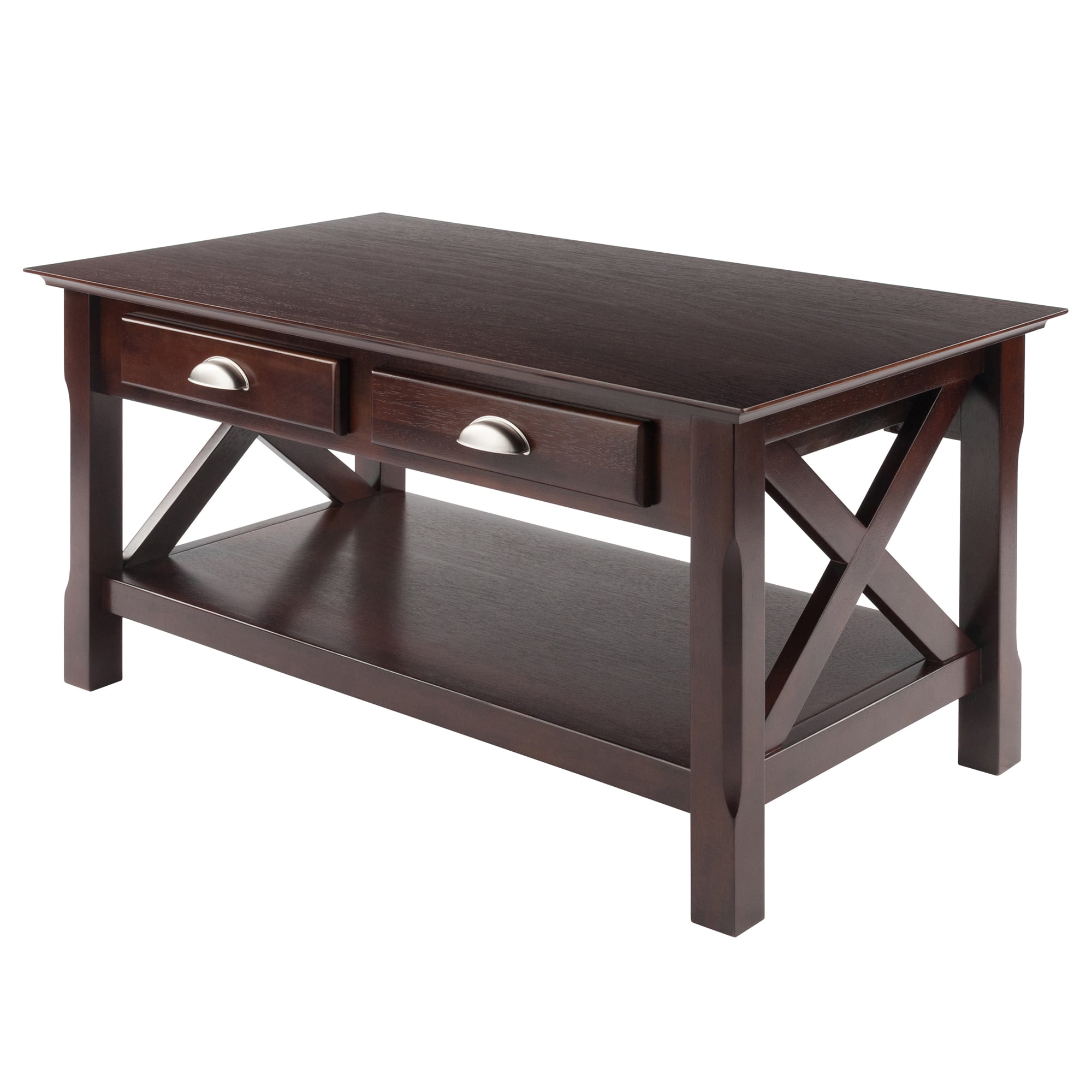 - 3-piece coffee table set in cappuccino includes a console with 2 drawers and shelf