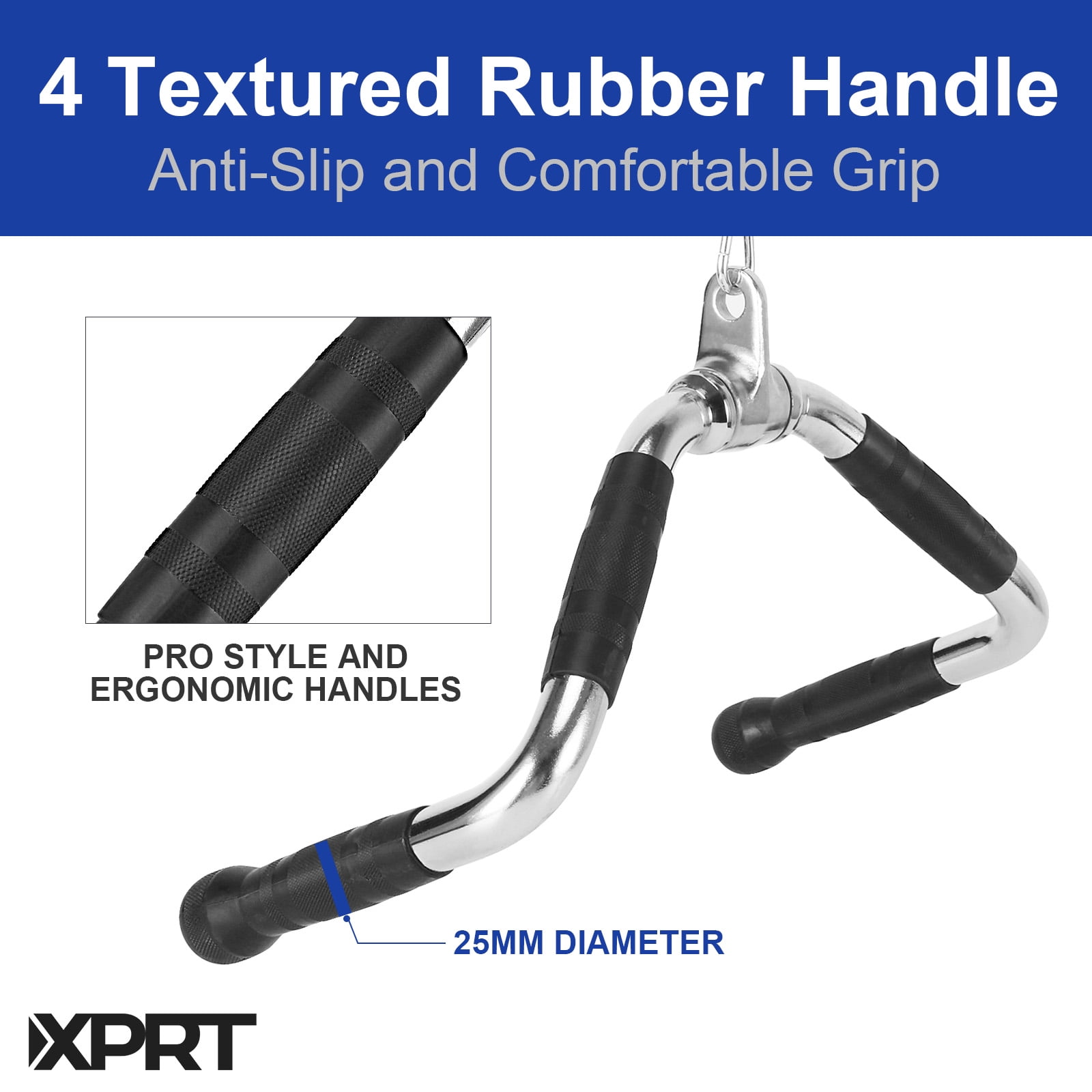 XPRT Fitness LAT Pull Down Cable Attachments variations are a great tool that maximizes back development and increases LAT muscle strength and pulling strength. The overhead pull-down exercises from the wider overhand grip or underhand grips of these various LAT attachments work differently and angles to grow lats in size and give a more muscular and wider back. It can add great variety to your shoulder, back, and lats strength training—great choices for beginners and professional athletes.